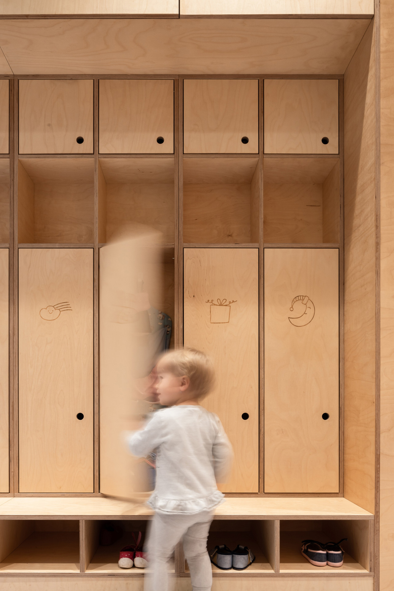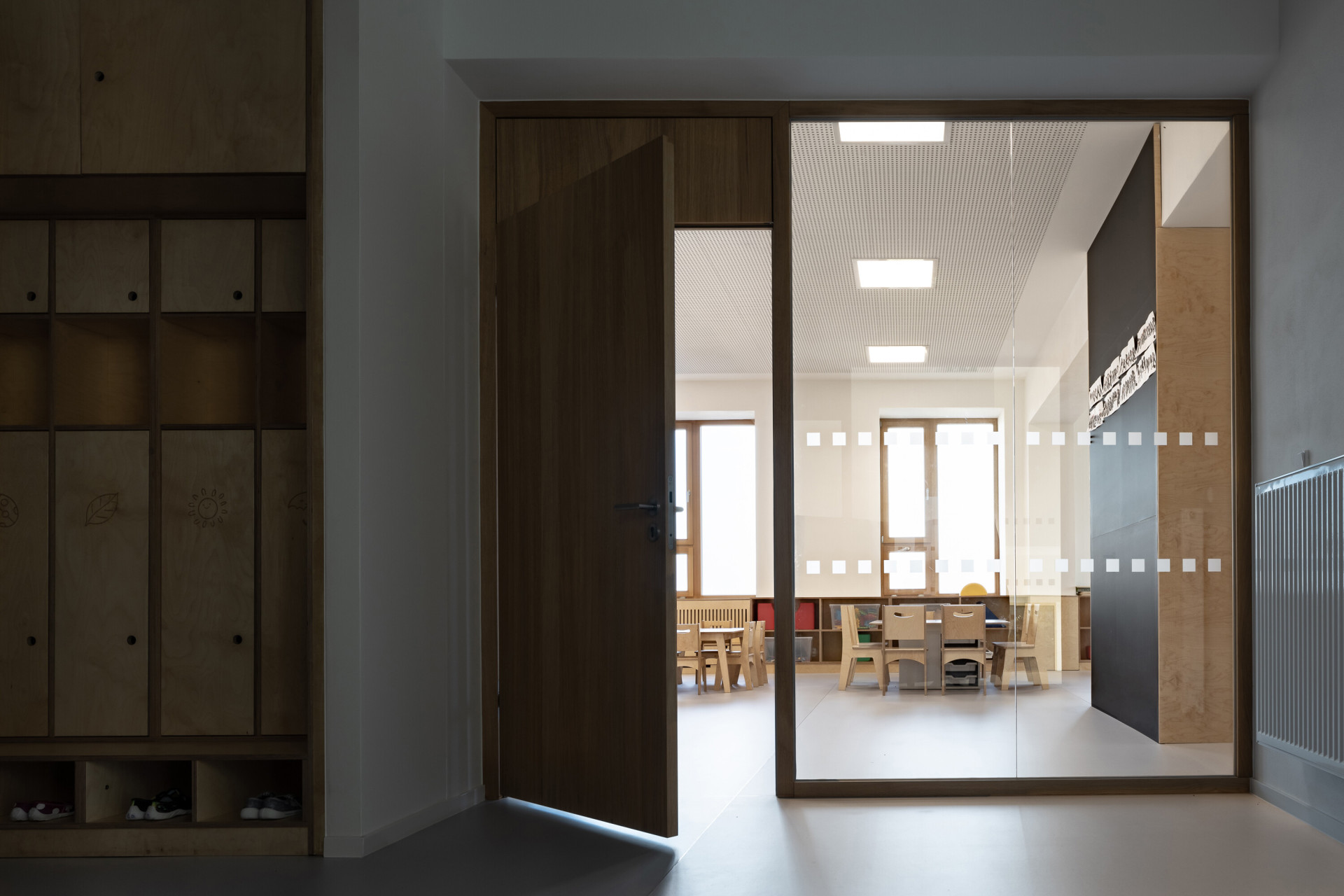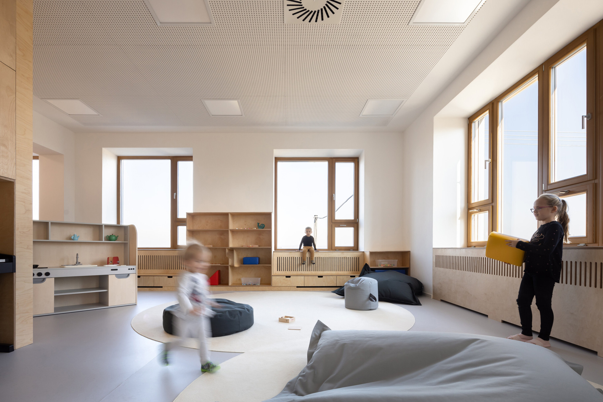 Děti tráví svůj čas především v prvním patře domu. Hlavní prostor školky je zde rozdělený na dvě části – hernu a učebnu. Interiéry jsou navrženy střídmě, ale ne nudně. Líbí se i učitelkám, podle kterých v nich hezky vynikají dětské hračky a výrobky. Vybavení tvoří na míru navržený nábytek z překližky a MDF desek. Veškeré úložné prostory jsou řešené jako vestavné. Ve vysoké skříni, která má i šikovný výklenek na klavír, jsou uskladněné dětské postýlky, které se vytahují pro odpolední odpočinek. Hračky se zase uklízejí do menších regálů nebo úložných parapetů.