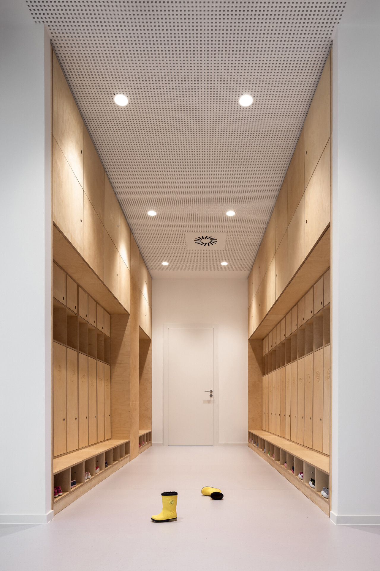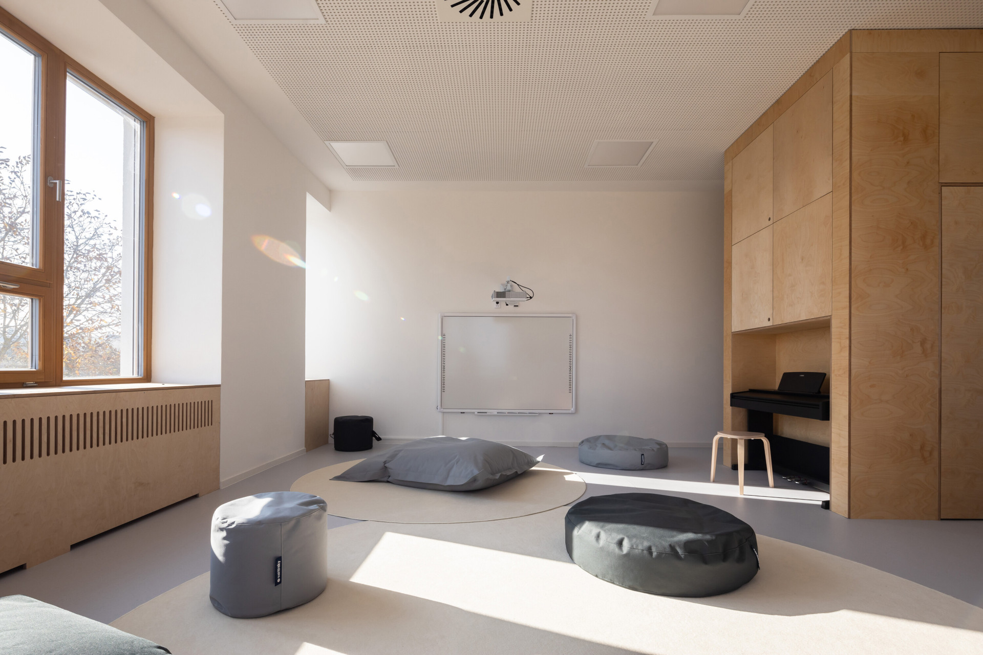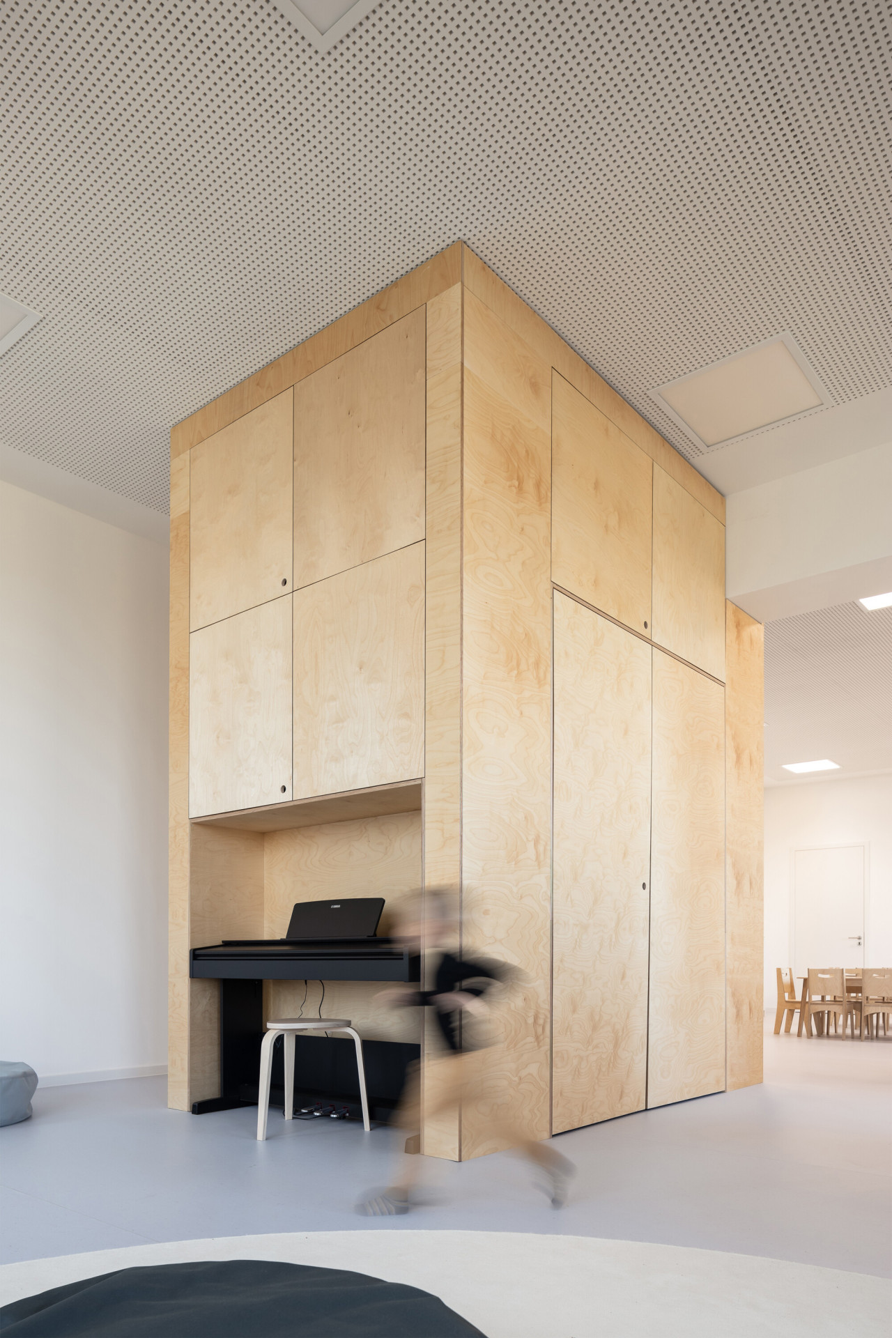 Děti tráví svůj čas především v prvním patře domu. Hlavní prostor školky je zde rozdělený na dvě části – hernu a učebnu. Interiéry jsou navrženy střídmě, ale ne nudně. Líbí se i učitelkám, podle kterých v nich hezky vynikají dětské hračky a výrobky. Vybavení tvoří na míru navržený nábytek z překližky a MDF desek. Veškeré úložné prostory jsou řešené jako vestavné. Ve vysoké skříni, která má i šikovný výklenek na klavír, jsou uskladněné dětské postýlky, které se vytahují pro odpolední odpočinek. Hračky se zase uklízejí do menších regálů nebo úložných parapetů.