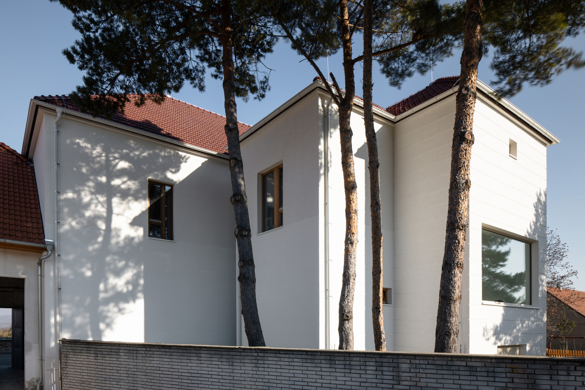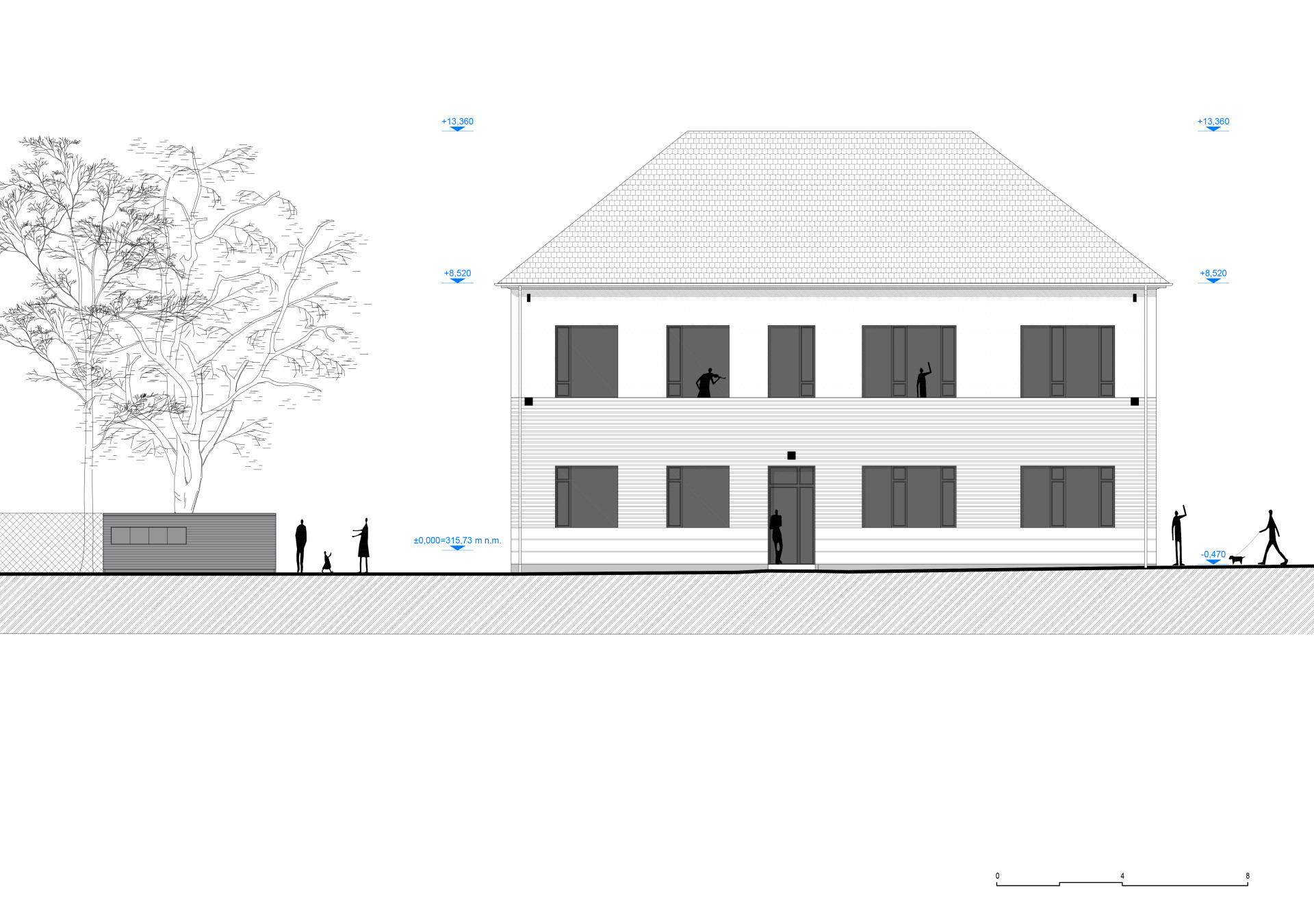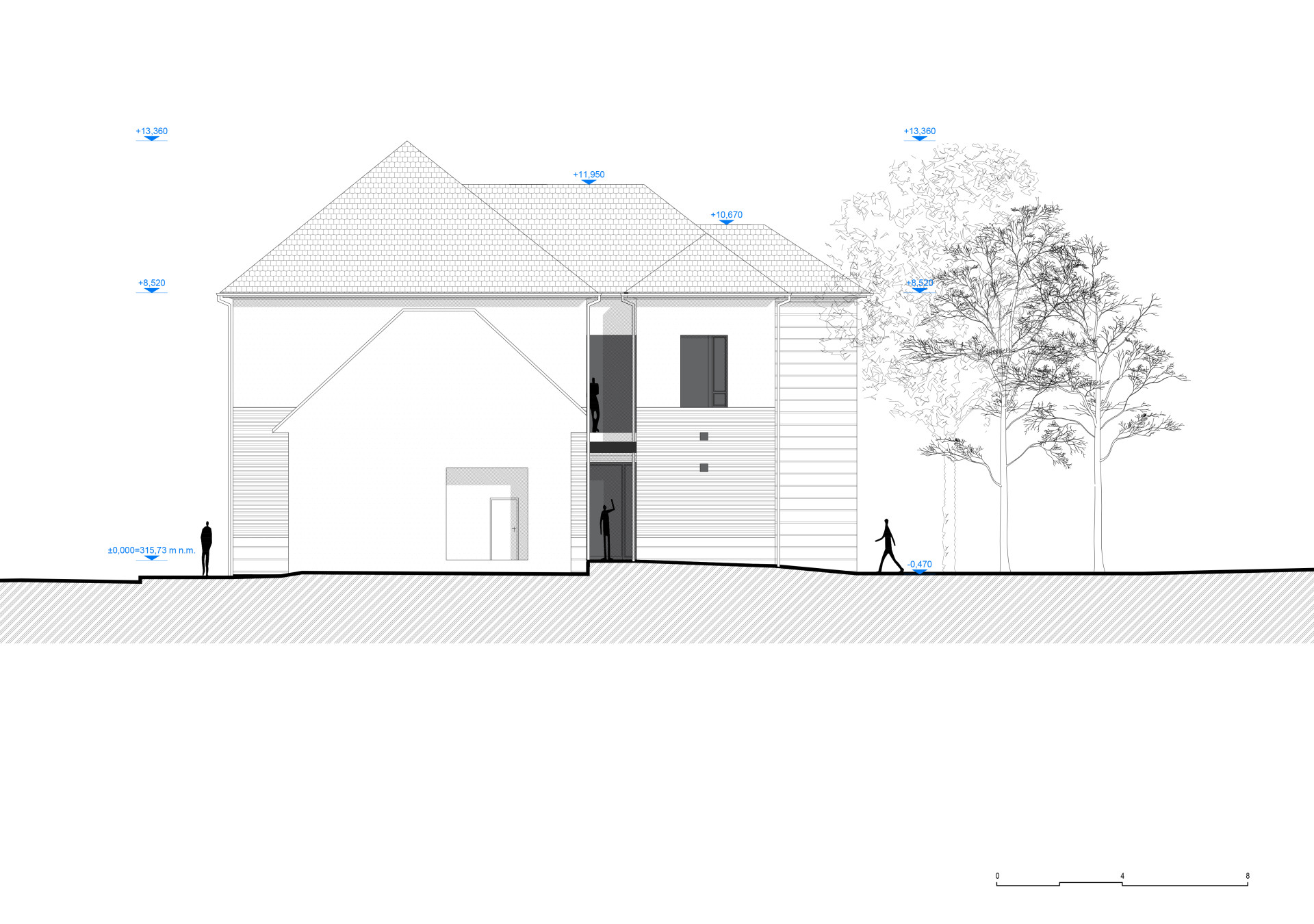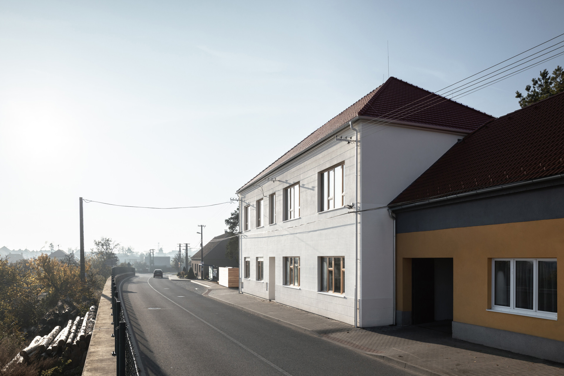 Zrekonstruovaná stavba s novou bílou omítkou působí v kontextu obce zcela přirozeně. Architekti záměrně zachovali její tradiční podobu, nově ji však podtrhli různými rastry profilací v omítce, díky kterým dostala jemné ozvláštnění. Kontextuální práce s tradičním, avšak moderně posunutým tvaroslovím je ostatně pro brněnský CL3 ateliér charakteristická. Dobrým příkladem tohoto přístupu jsou například apartmánové budovy v Jeseníkách s šindelovými fasádami a zešikmenými komíny, které nabourávají jinak archetypální siluetu domů.
