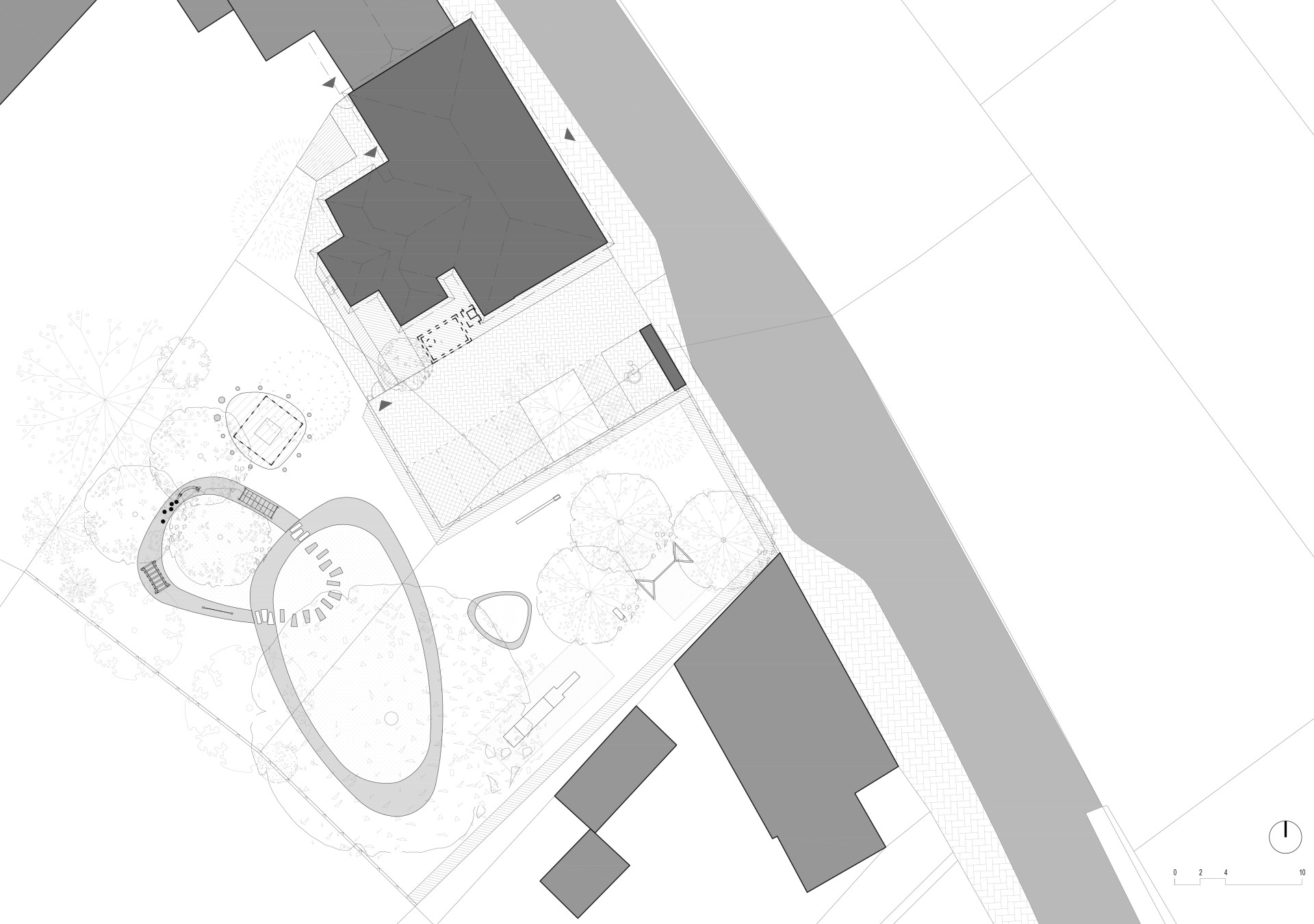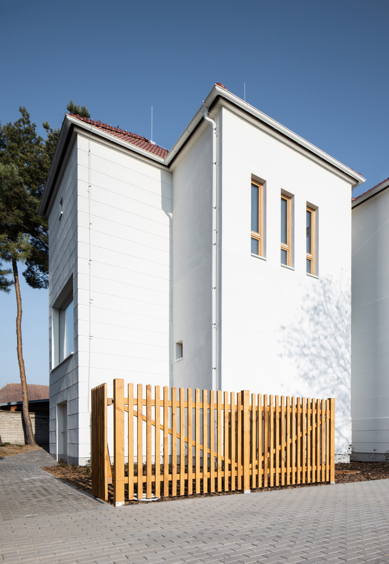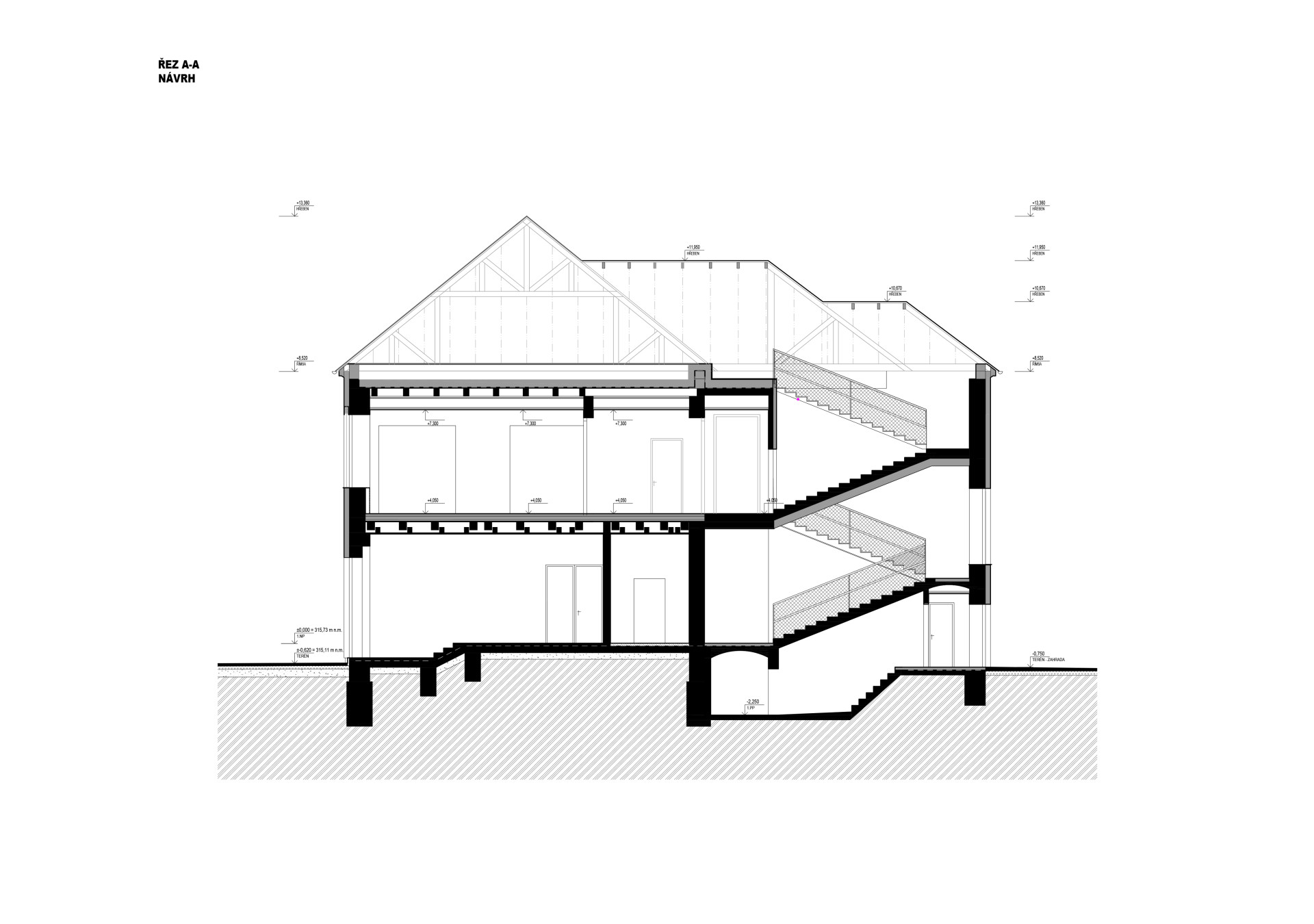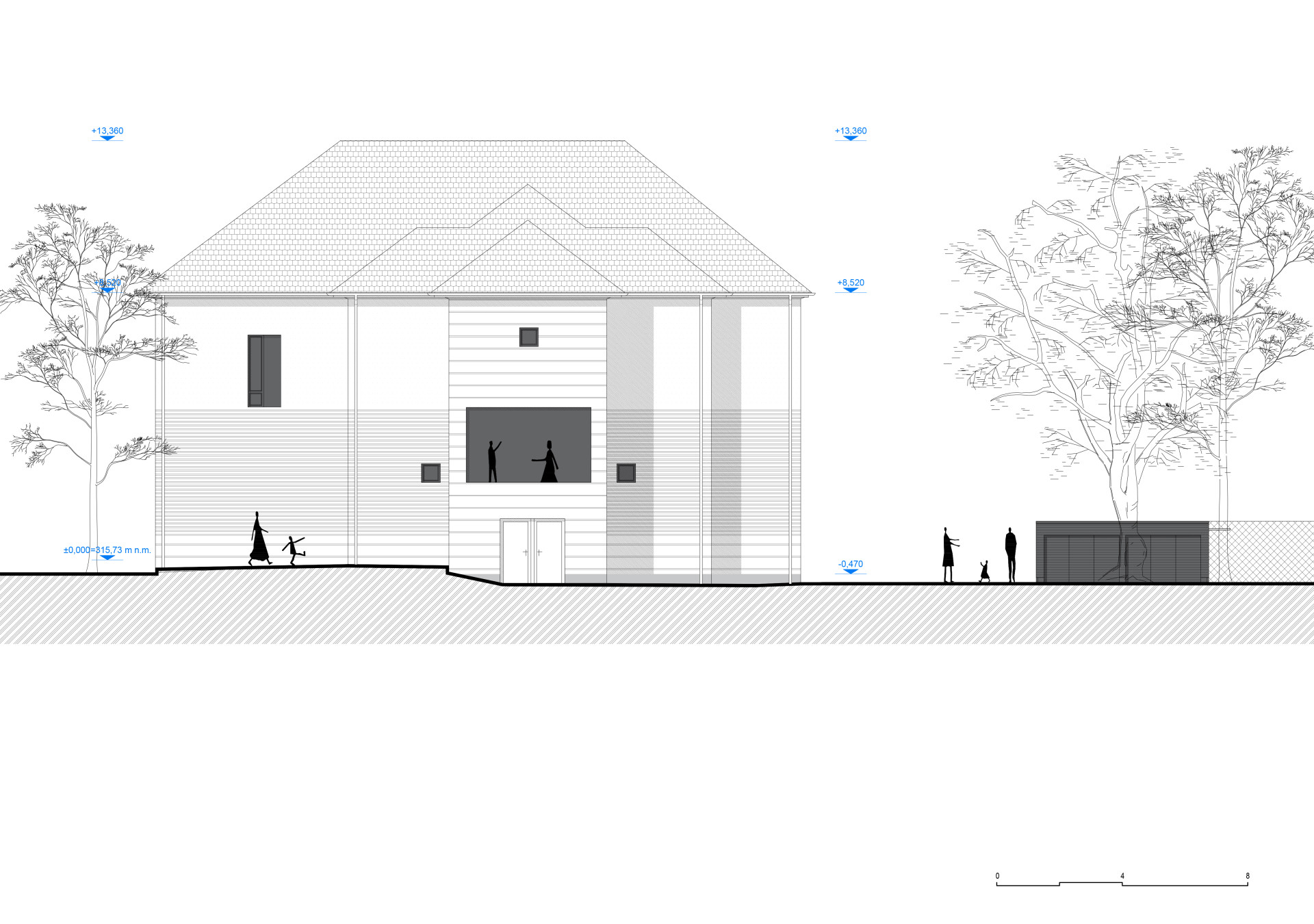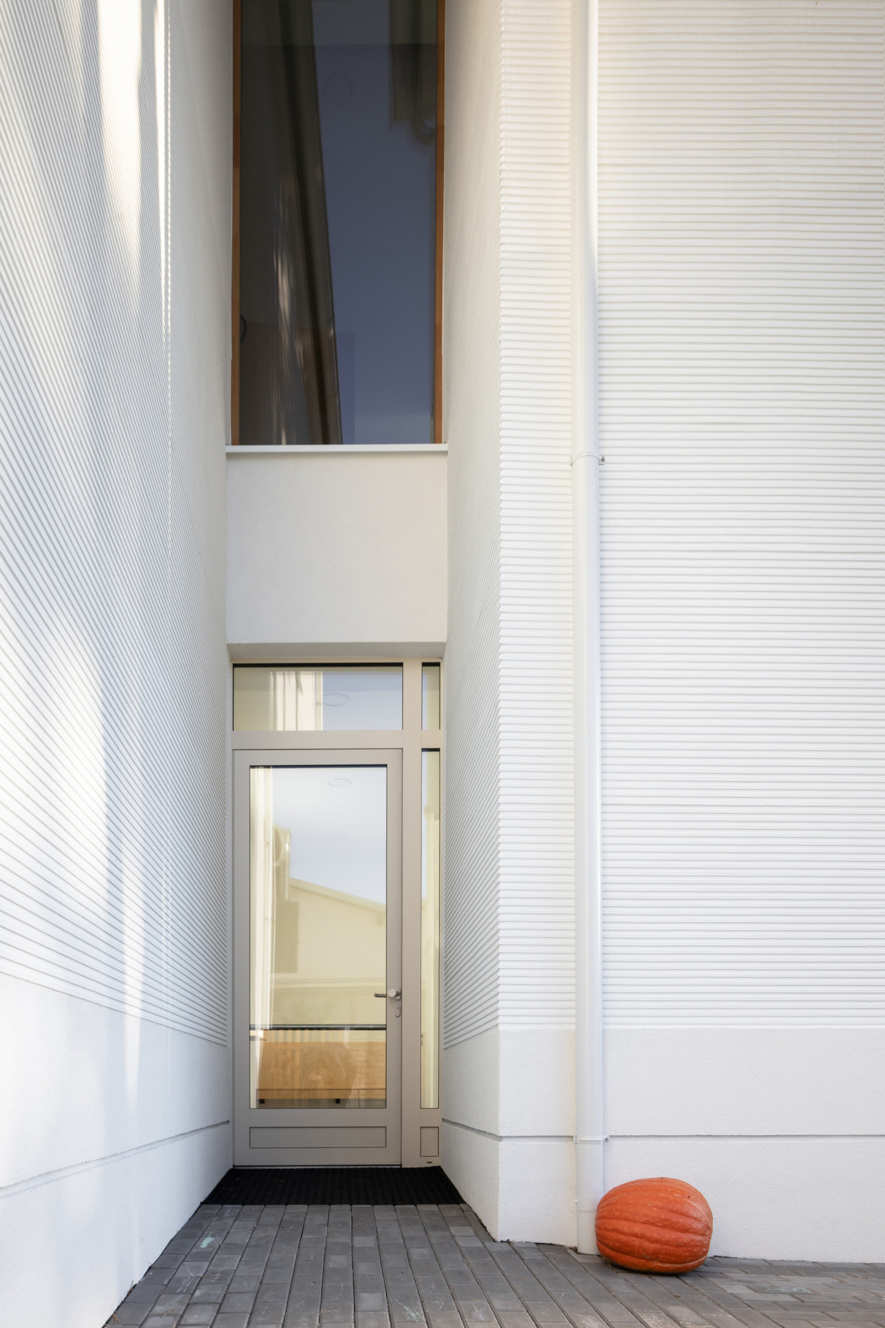 Zrekonstruovaná stavba s novou bílou omítkou působí v kontextu obce zcela přirozeně. Architekti záměrně zachovali její tradiční podobu, nově ji však podtrhli různými rastry profilací v omítce, díky kterým dostala jemné ozvláštnění. Kontextuální práce s tradičním, avšak moderně posunutým tvaroslovím je ostatně pro brněnský CL3 ateliér charakteristická. Dobrým příkladem tohoto přístupu jsou například apartmánové budovy v Jeseníkách s šindelovými fasádami a zešikmenými komíny, které nabourávají jinak archetypální siluetu domů.