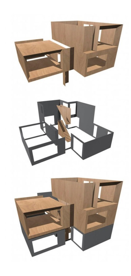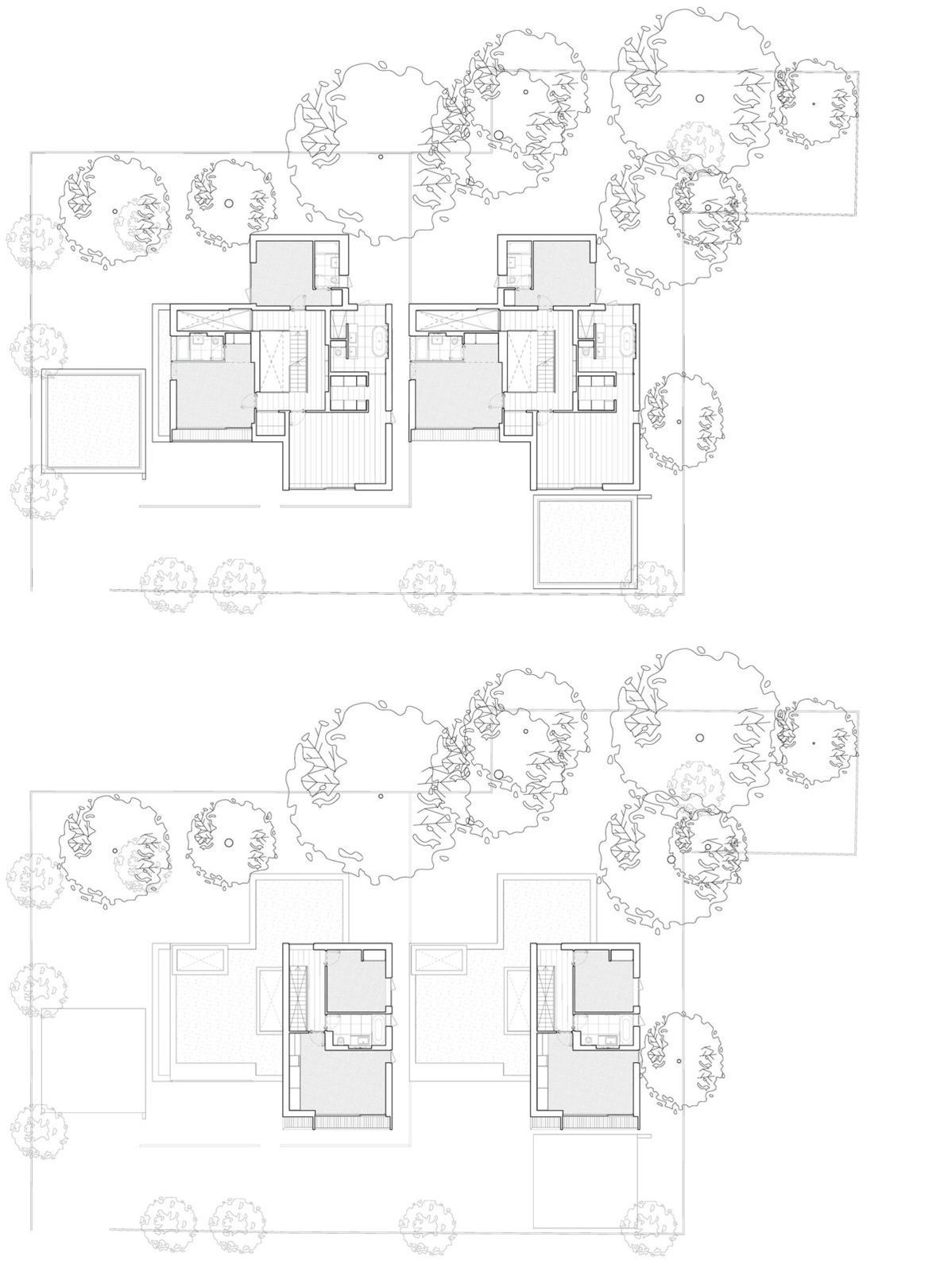 Oba domy vznikly na principu navíjení a vzájemného prostupování dvou spojitých struktur, jedné dřevěné a druhé z grafitové omítky (viz fotoalbum). Ty prochází z exteriéru do interiéru, tvoří zdi, podlahy, vnější krytinu a nakonec i ploty. Technikou postupného „zabalování“ či zavíjení obou dvourozměrných plánů vzniknul vnitřní prostor, který je neformální, jasný a světlý a který charakterizuje otevřenost a pohostinnost. Přízemní patro je organizováno kolem atria a tvoří obývací část domu, kuchyně a další společné prostory vedou k velkorysým zahradním terasám. Dřevěné schodiště, jež je jinak pojaté jako jednolitý kvádr rozdělený vedví, je doslova omýváno svrchním světlem; přízemí propojuje s ochozem v prvním patře. Prostor atria potom prosvětluje i sklepní patro, které se tak stává plnohodnotnou součástí domu.