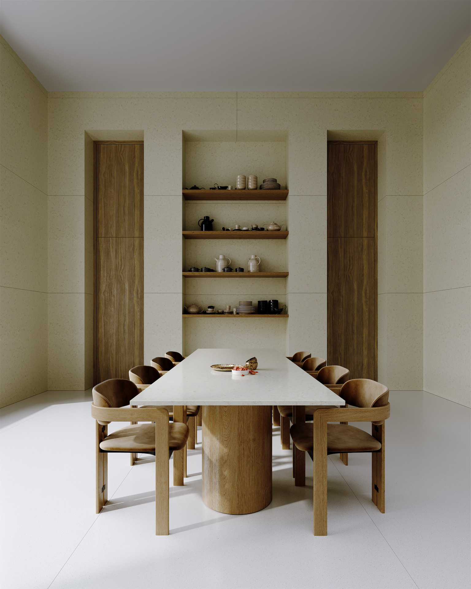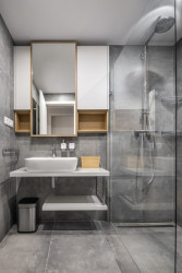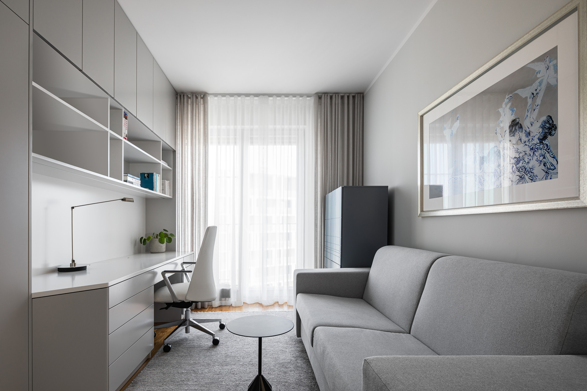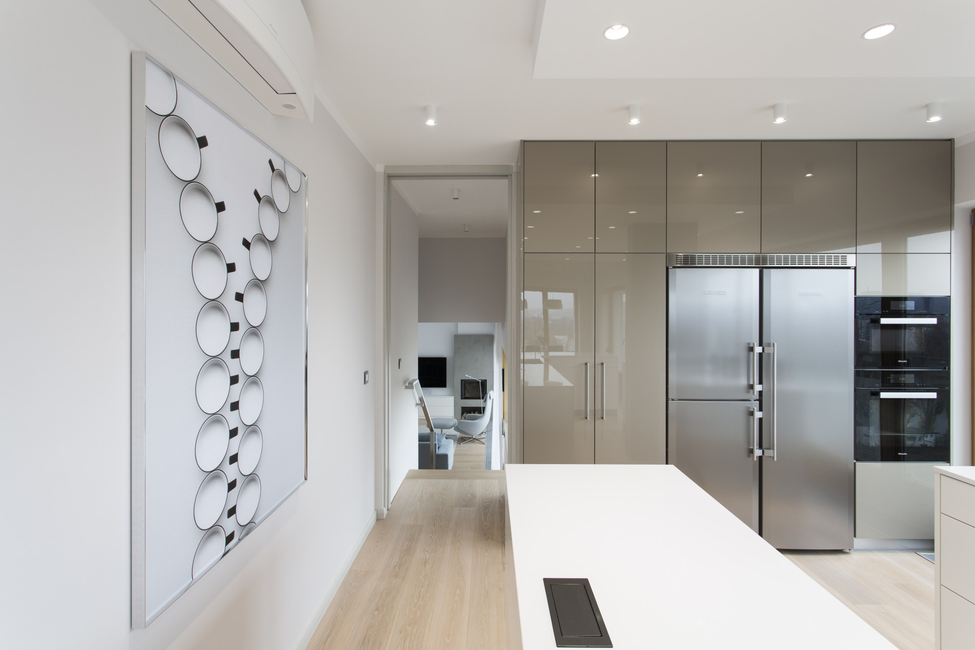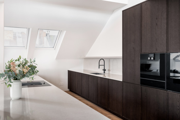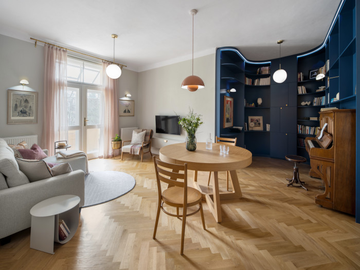Podobné uspořádání kuchyně a jídelního prostoru designérky použily i v interiéru bytu v pražských Modřanech. Celkové ladění bytu o dispozicích 4+kk je opět navržené klientovi, v tomto případě klientce, na míru. „Dojem z celého prostoru, kterého jsme chtěli dosáhnout, by se dal popsat slovy jako křehkost, ženskost a elegance,“ říkají designérky. V bytě tak dominuje tlumená paleta a neutrální odstíny, které místy ozvláštňují barevné akcenty na menších kusech nábytku – například židlích, kobercích, uměleckých dílech, nebo křeslech, která designérky nechaly osadit do prosklených výklenků.