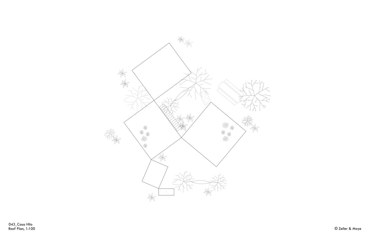 Jednoduchému materiálovému řešení hmot architekti přizpůsobili i venkovní zahradní prvky, jako jsou jídelní stůl, nádrž pro zadržování dešťové vody či schodiště vedoucí na střešní zahradu nebo (v případě vícepodlažního uspořádání) do dalšího patra. Stejně jako nosná konstrukce je i toto venkovní zařízení provedeno v betonu, což už jen potvrzuje ideu prototypu Casa Hilo – tedy že na tvorbě domu se nepodílí jen vnitřní prostory, ale také exteriér.