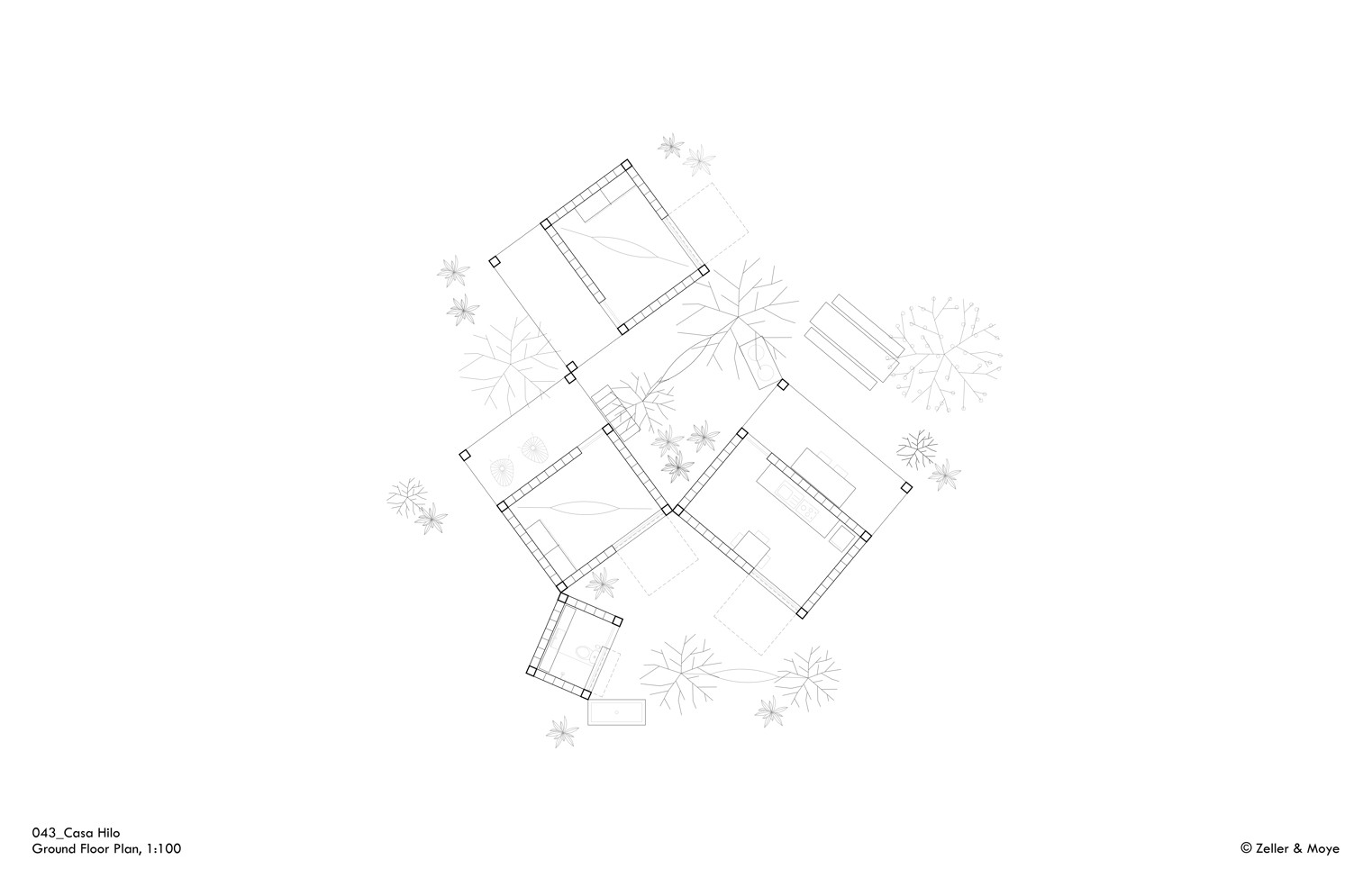 Základní uspořádání Casa Hilo tvoří dvě ložnice, kuchyně s jídelnou a koupelna, přičemž každý z prostorů tvoří samostatný objekt. Základní složení dohromady představuje přibližně 90 metrů čtverečních plochy, nicméně vzájemné uskupení modulů je zcela variabilní – jednotlivé prostory lze seskupit do podoby jednopodlažních bungalovů propojených zastřešenými terasami, místnosti je však možné také řadit nad sebe a docílit tak vícepodlažního objektu, který zabere minimum plochy pozemku.