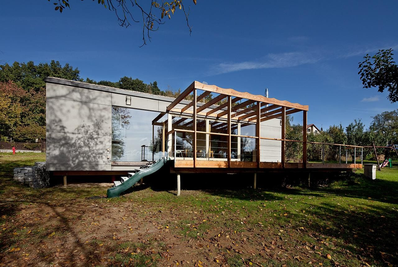 Hlavní místnost domu – obývací prostor s kuchyní - je skrze posuvní dveře vsazené do rozměrného předního okna spojena se zahradou. Prostorná dřevěná terasa s dřevěnou pergolou je další pobytovou plochou domu. Na hlavní společný prostor navazují tři soukromé ložnice a koupelna se samostatným wc. Menší podlahové plochy těchto místností jsou kompenzovány vysokou světlou výškou, která umožnila umístit ve dvou ložnicích palandy na spaní. V prostoru, který vzniká mezi dvěma hmotami stavby jsou posazeny úzká okna, do severních místností přivádějí jižní světlo.