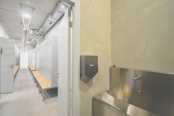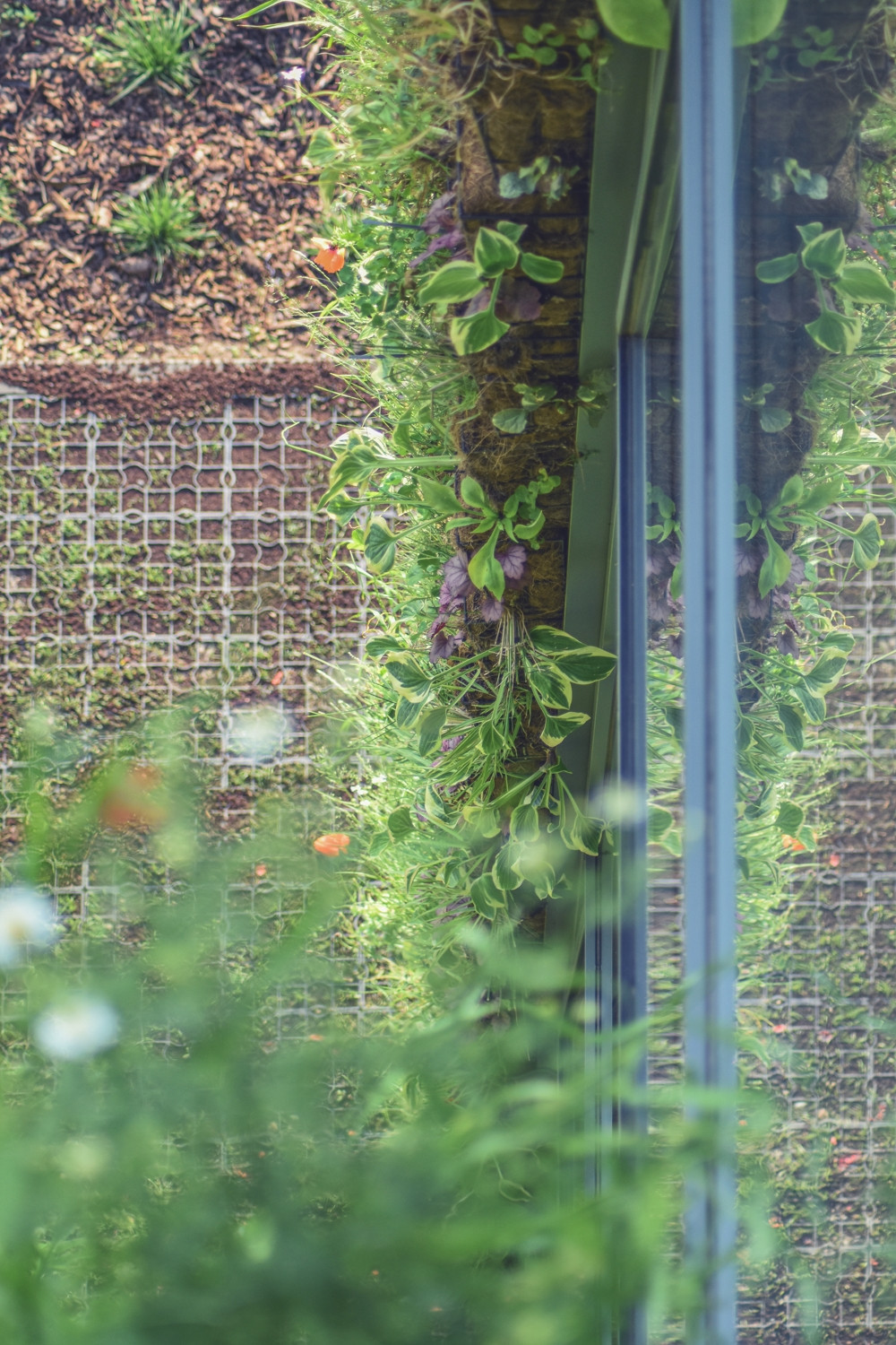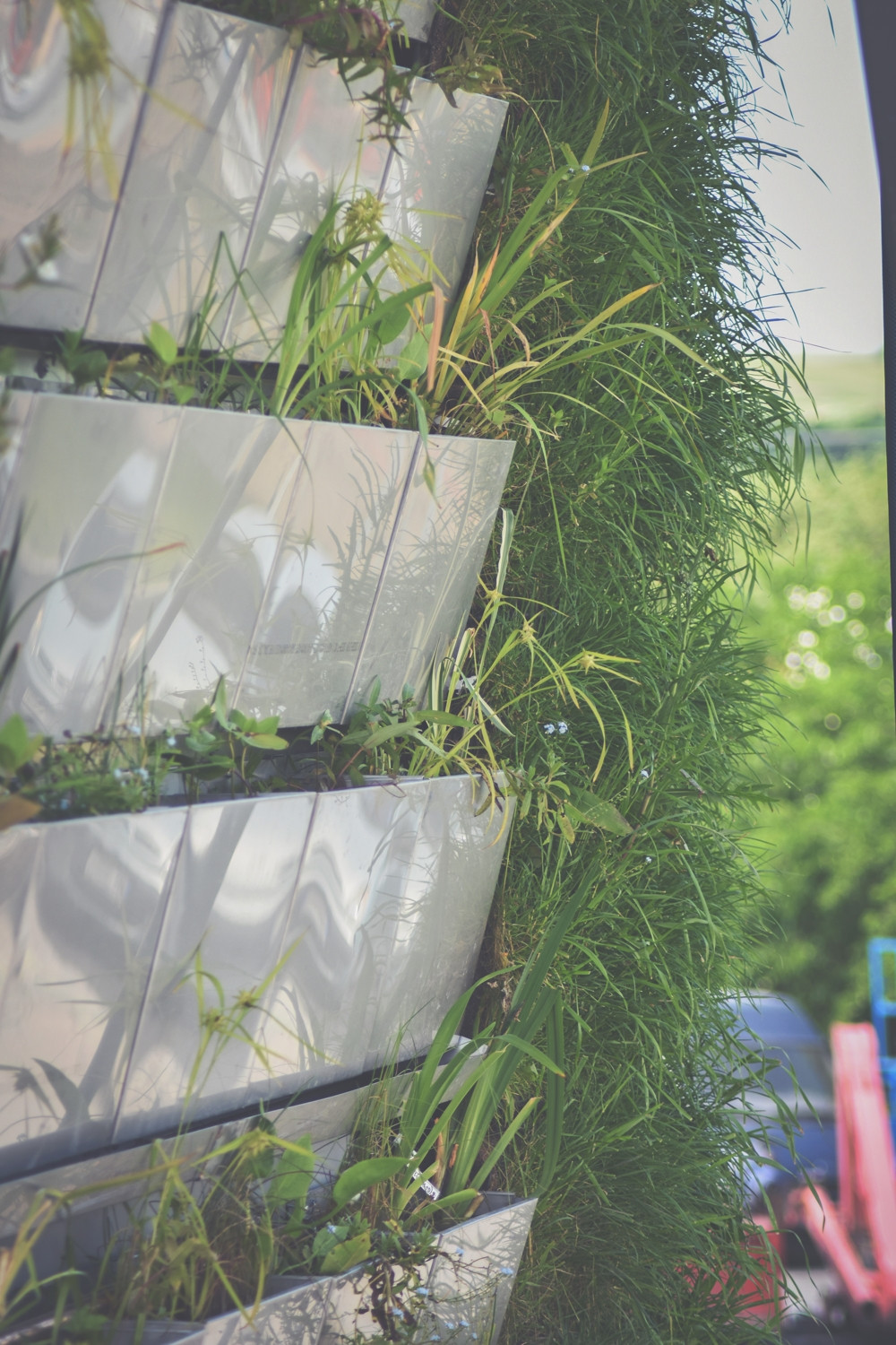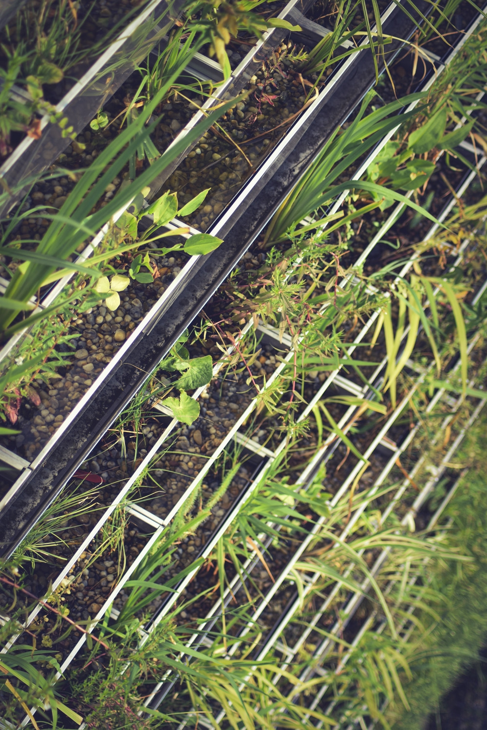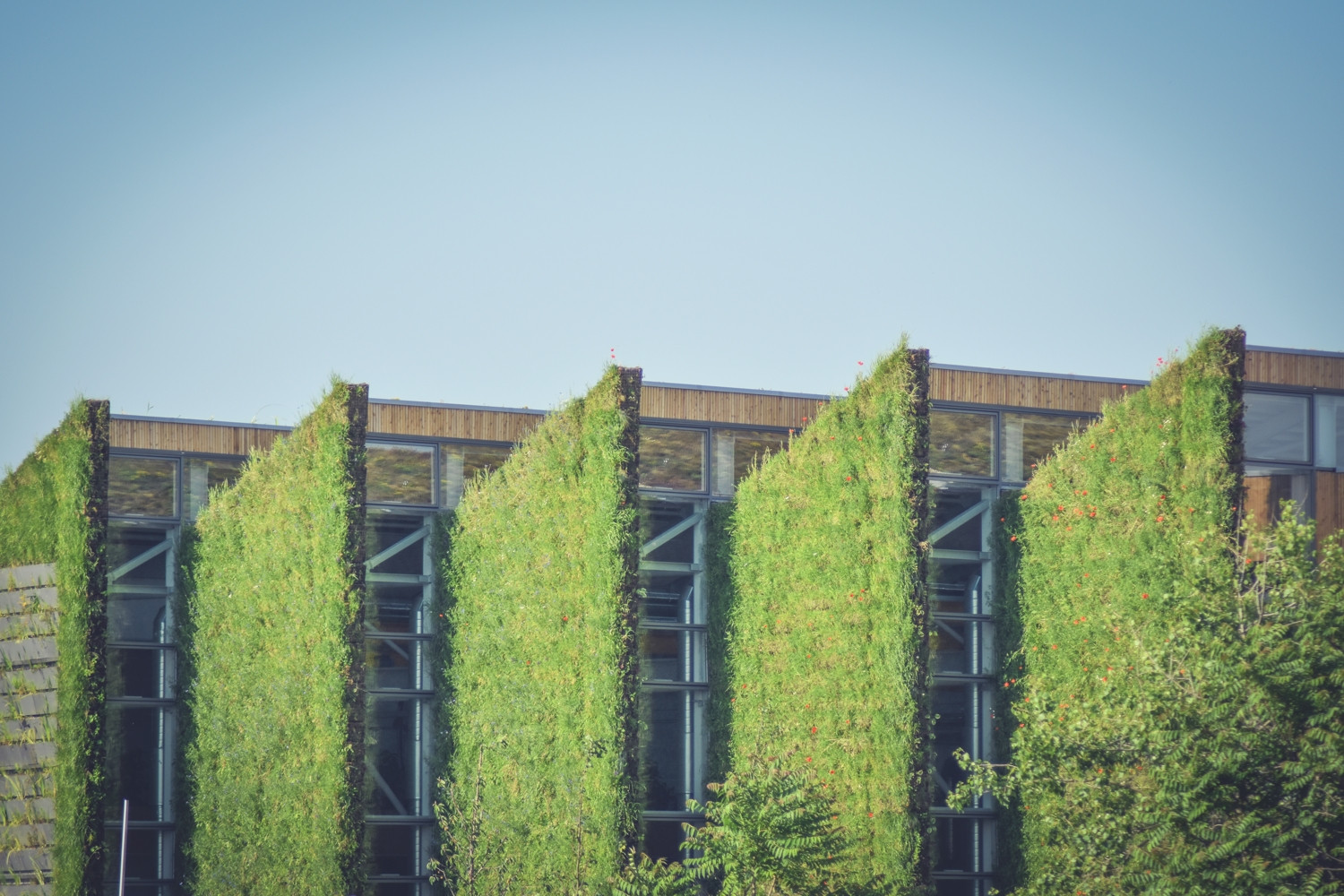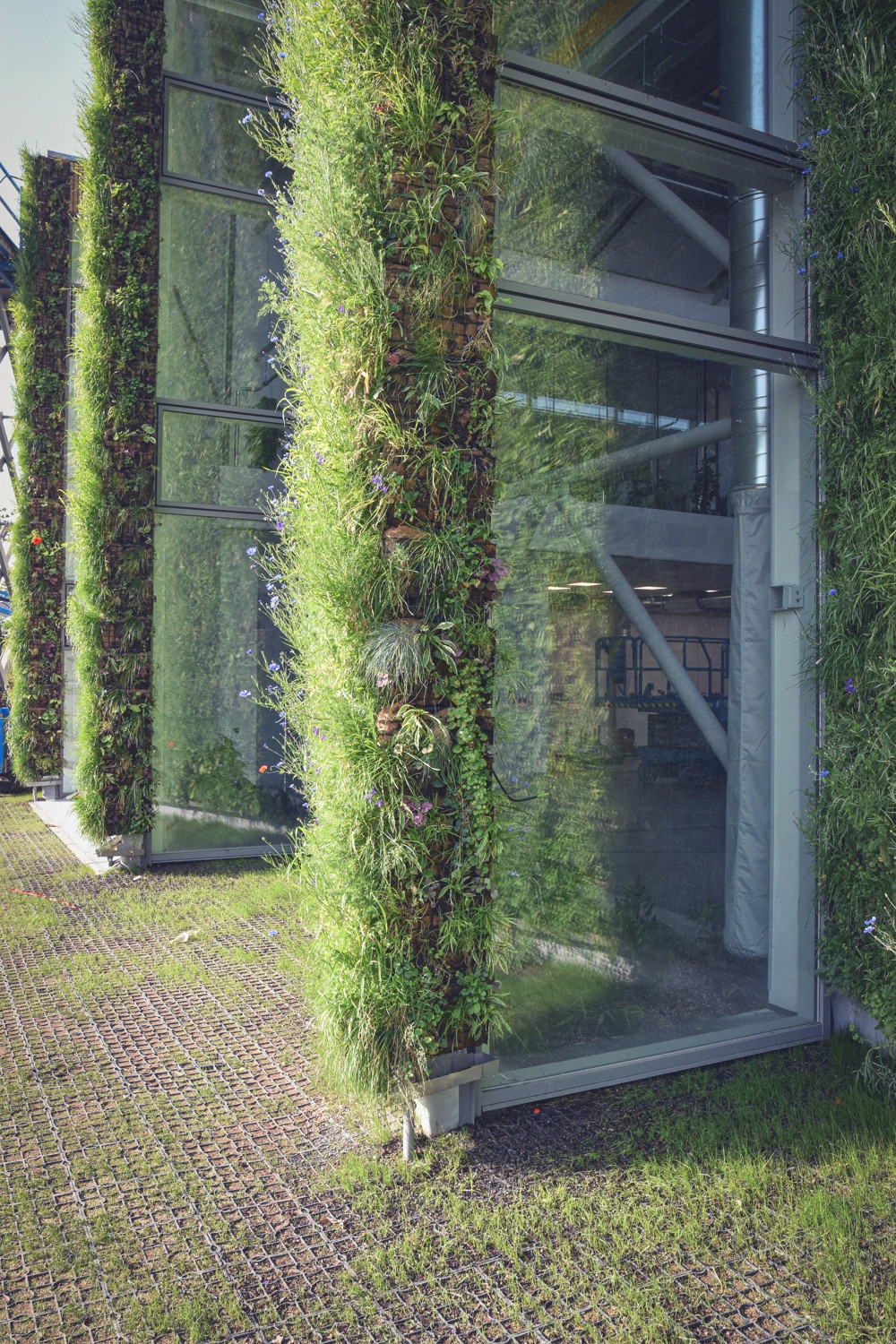 Stěny haly navrhl architekt Fránek jako prolamované a zelení porostlé plochy tak prostřídal velkoformátovým prosklením, které vzhledem ke své severní orientaci propouští do interiéru dostatek přirozeného světla, nikoliv však slunečního tepla, díky čemuž se stavba nepřehřívá. Nepříjemně vysokým teplotám v interiéru brání také částečné zapuštění objektu do země z jižní strany. Díky důmyslnému použití zelených fasád a jejich vhodné orientaci ke světovým stranám je tak objekt schopen nabídnout příjemné vnitřní prostředí i bez klasického klimatizačního systému.