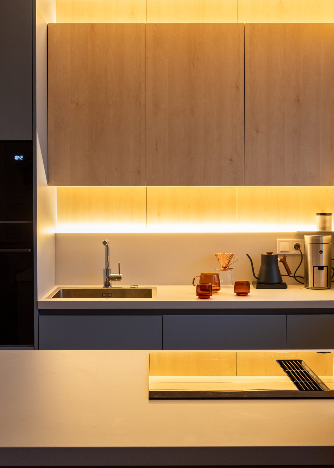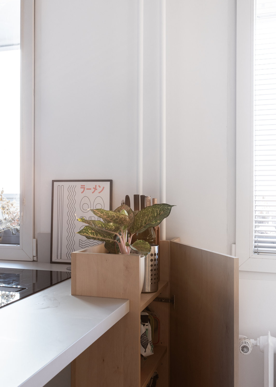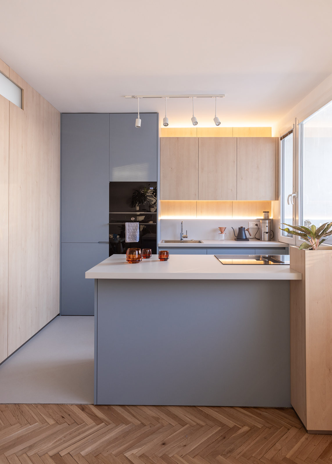 Podobných hříček je ve zrekonstruovaném panelákovém bytě víc. Třeba skříňka zabudovaná v ostrůvku, která v zavřené poloze vytváří box na květinu a kuchyňské nezbytnosti. Nebo světlík vyříznutý do stěny – malá lucerna propojující kuchyň a sprchu.
