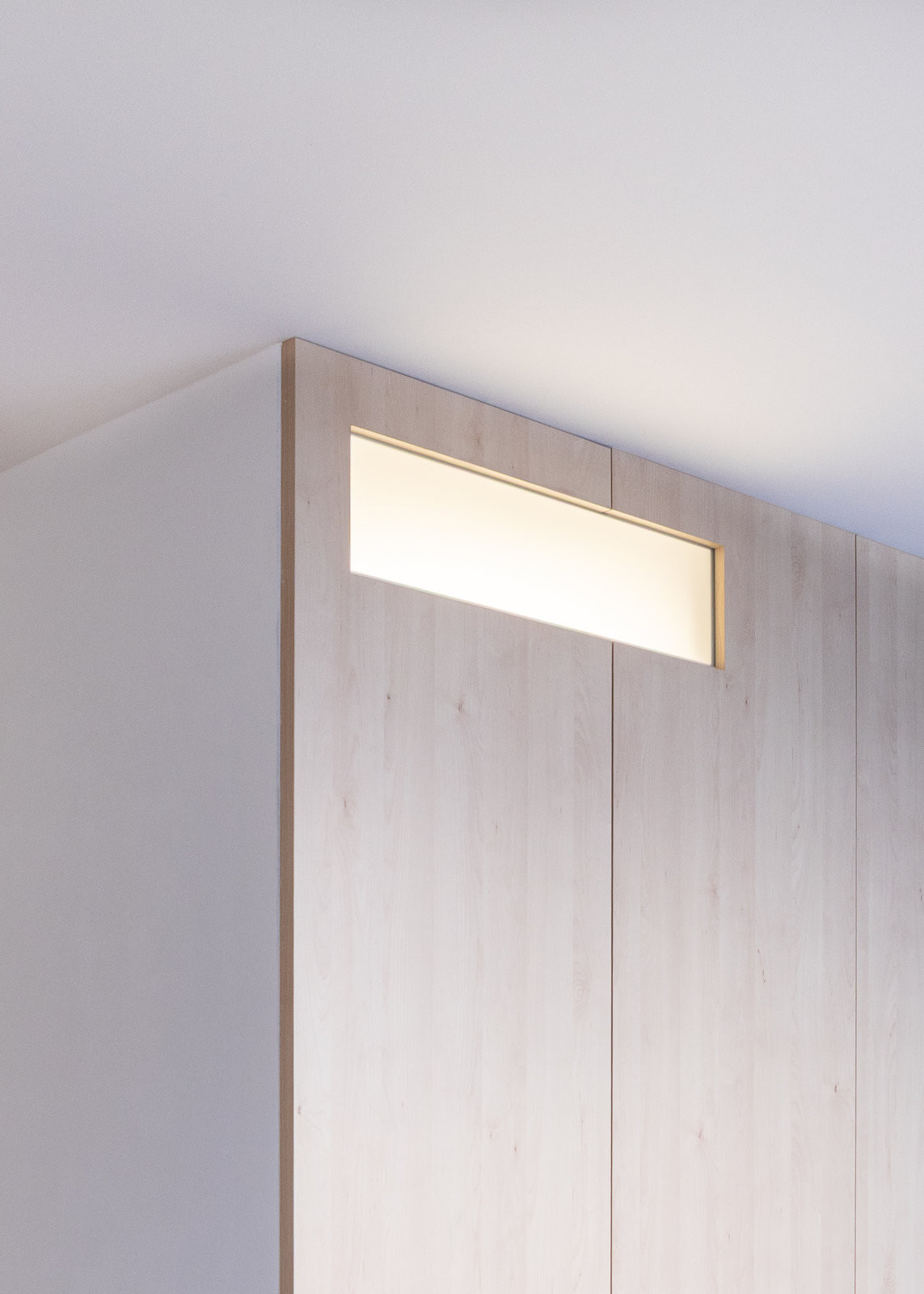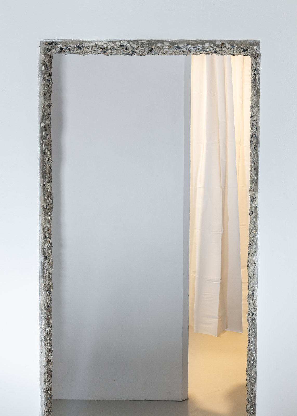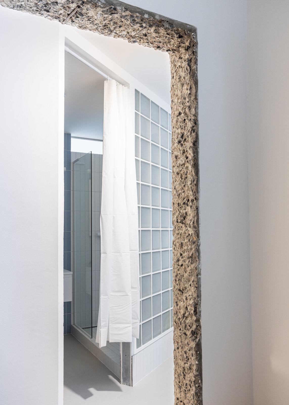 Kromě chodby, umakartu a příček šla pryč také futra ze vstupní předsíně. Zůstal po nich odhalený beton prořízlého panelu. „Portál svou materialitou odhaluje vrstvu ‚naturel‘ panelového bytu,“ popisují to architekti.