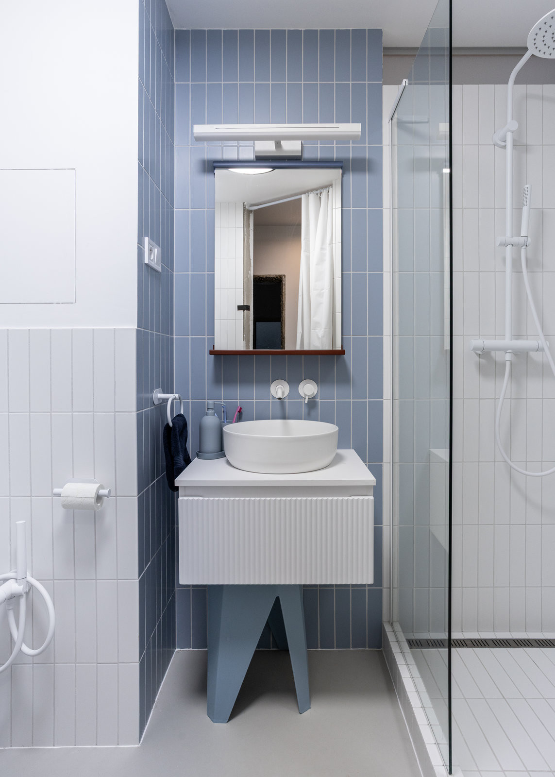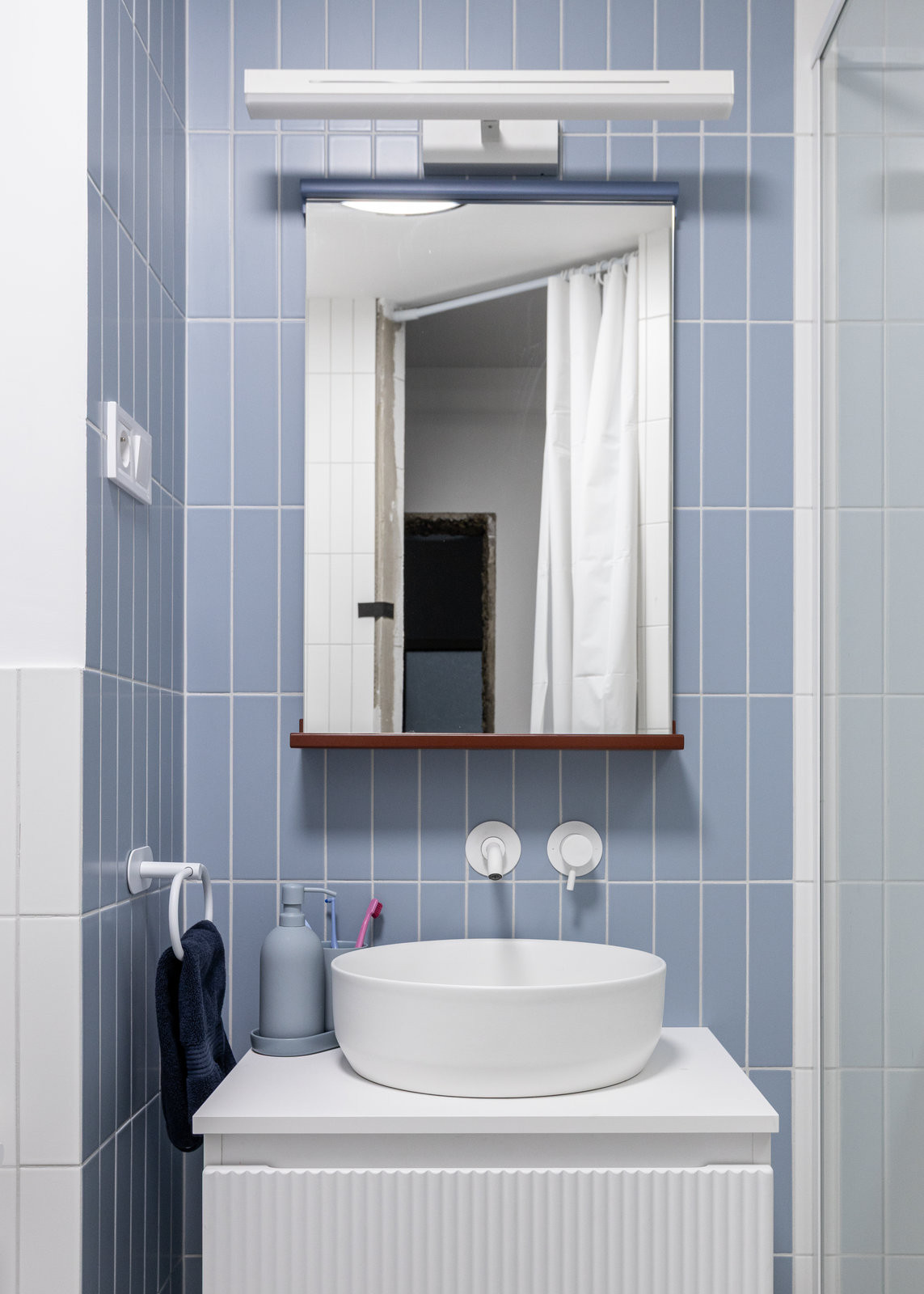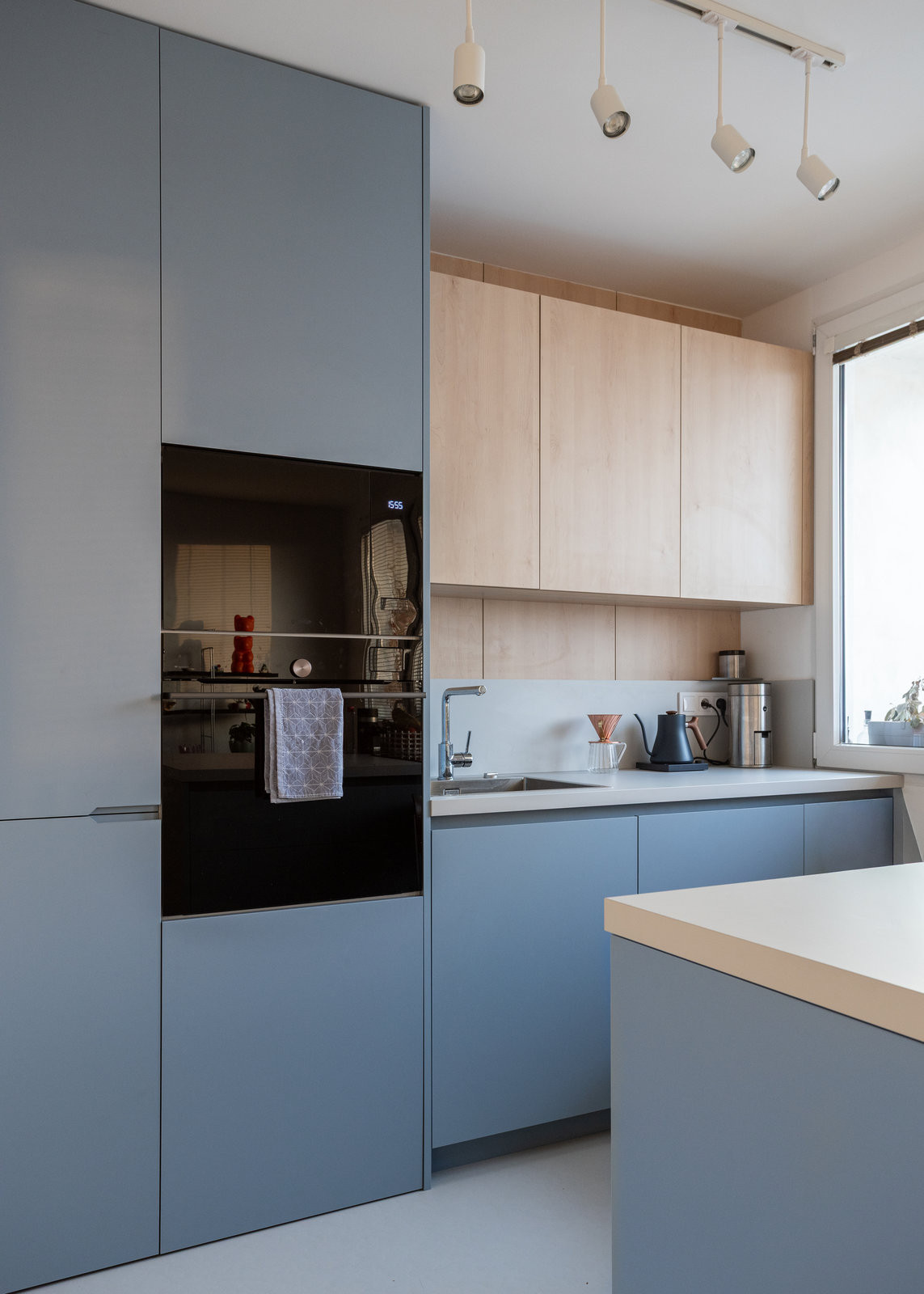 Propojení kuchyně a koupelny se odehrává také v barevnosti. Kuchyňské skříňky ladí ke stejně modrým koupelnovým obkladačkám. Mají příjemný vertikální formát, takže navíc opticky zvyšují jinak v panelákových bytech nízké stropy.