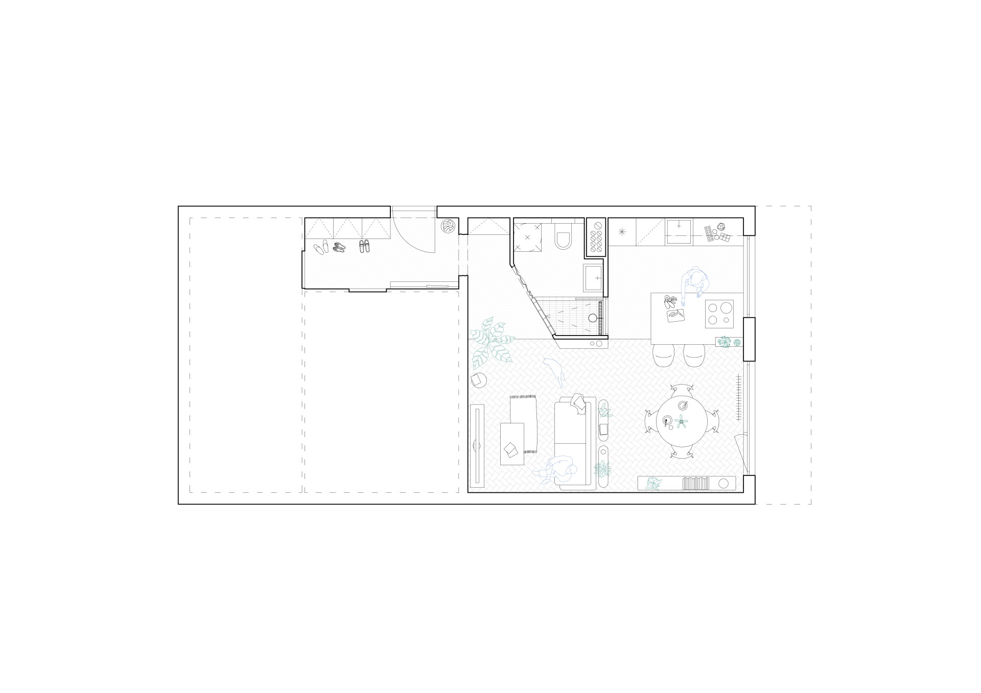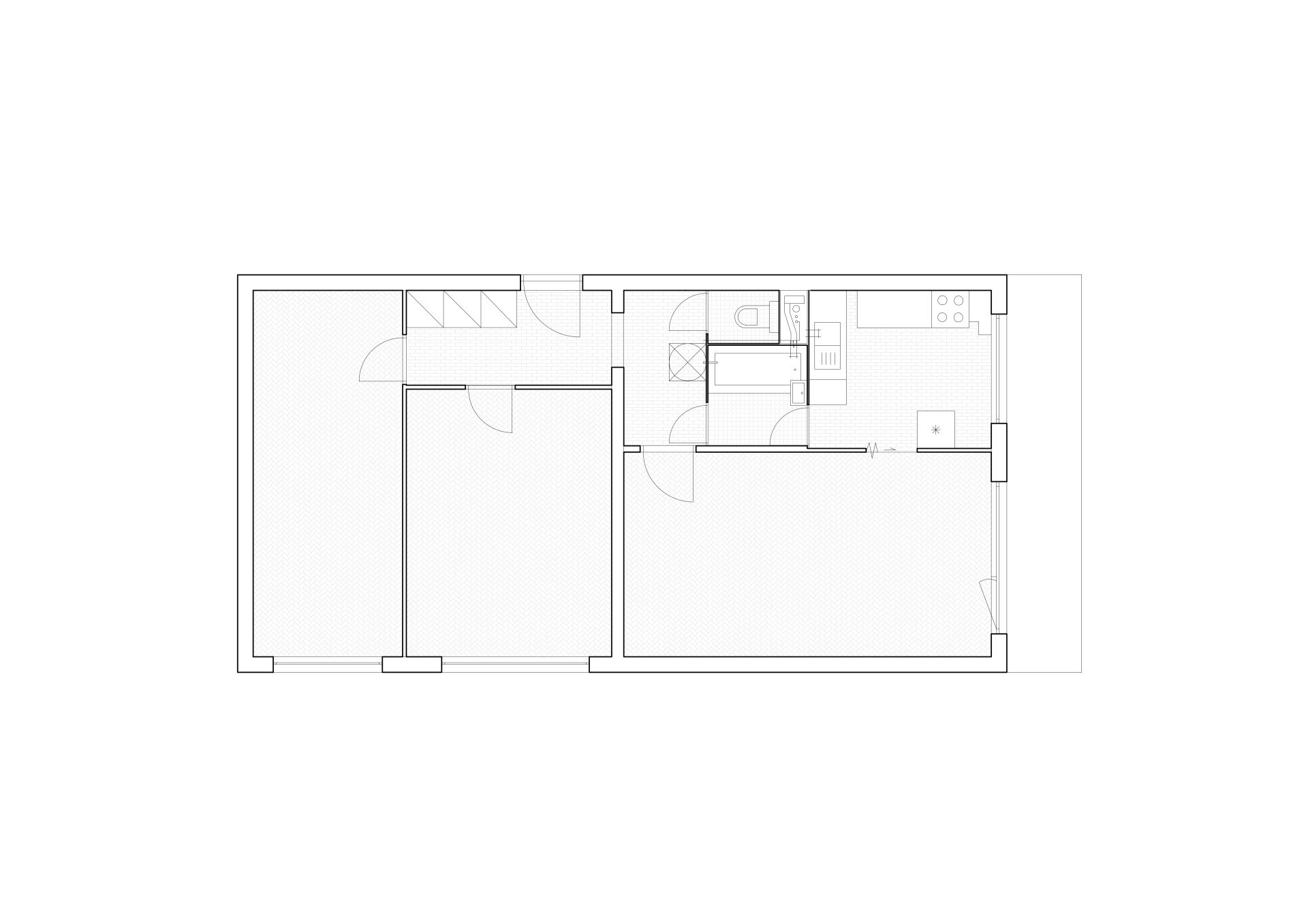 Před vstupem architektů to byl standardní panelákový byt, který měl už ta nejlepší léta za sebou. A trpěl také typickými panelákovými limity – změtí malých pokojů a temných chodeb. Proto se bouralo. Ve východní části bytu vznikl nový velkorysejší obytný prostor tvořený obývacím pokojem propojeným s kuchyní.