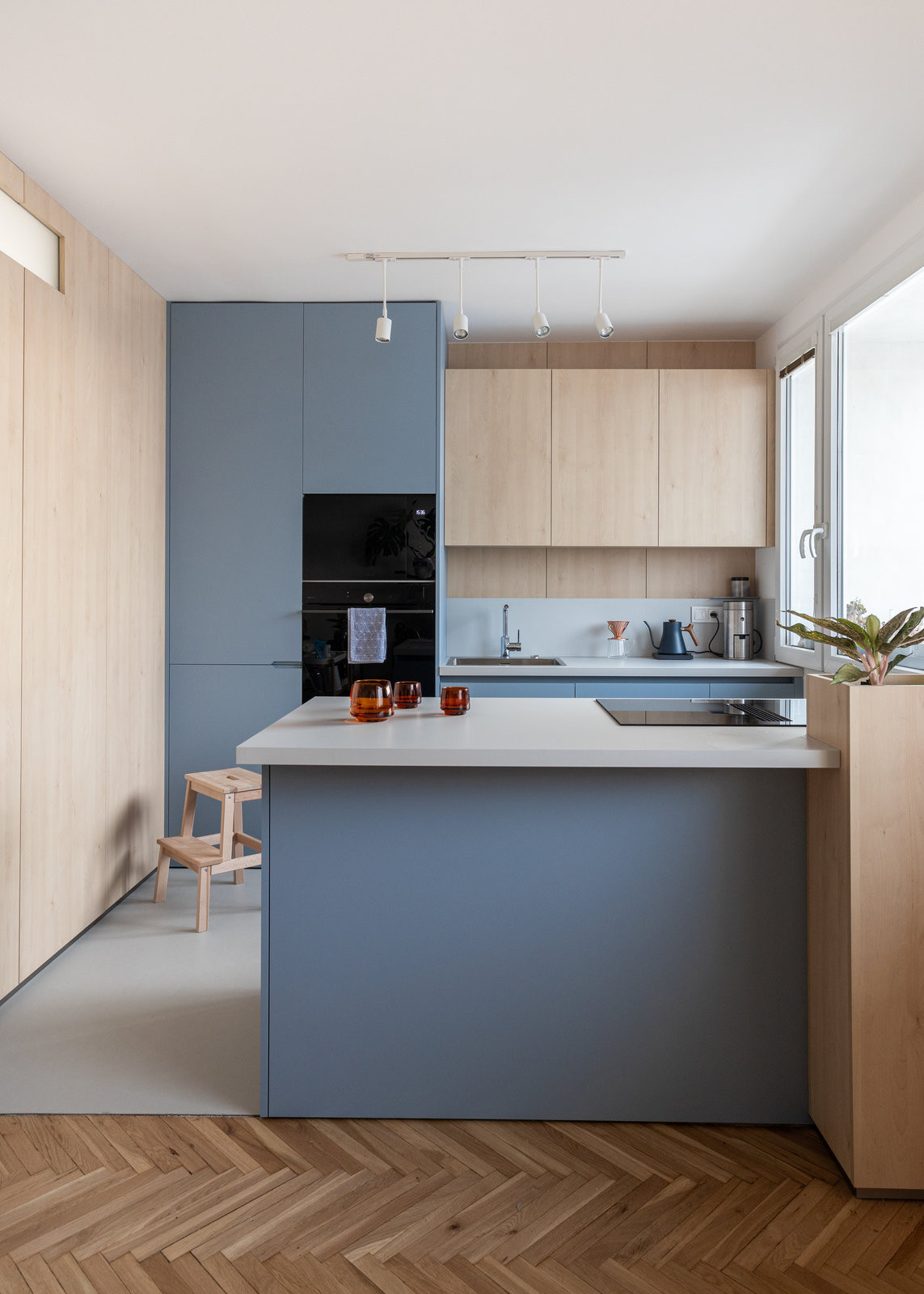 Kde dřevěná podlaha nebyla, tam architekti navrhli krytinu novou, konkrétně marmoleum, které je v chodbě, koupelně i kuchyni. Zde předěl mezi starými parketami a novým marmoleem zdůrazňuje přesně na jejich rozhraní umístěný kuchyňský ostrůvek.