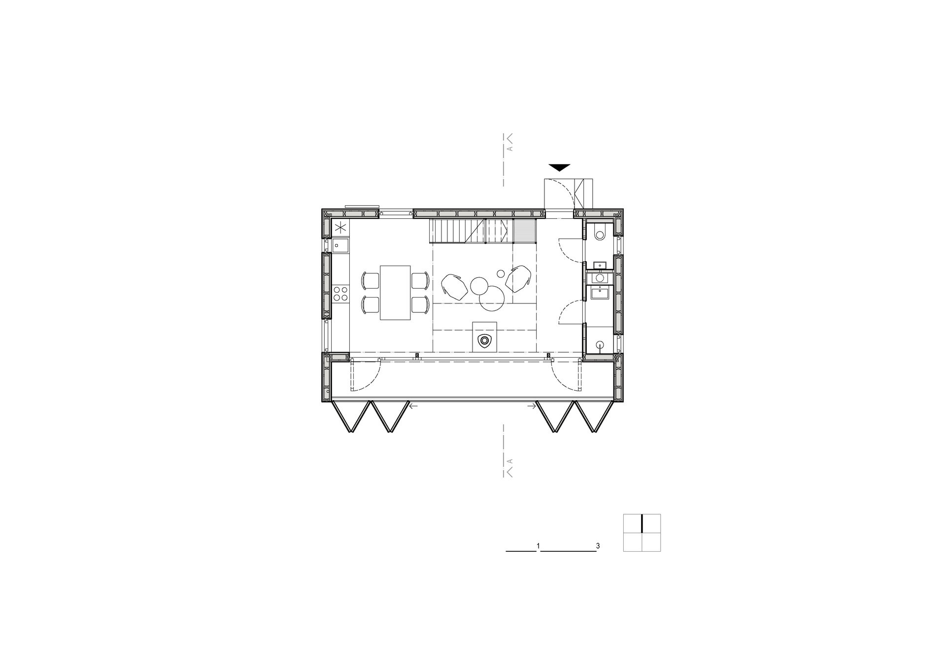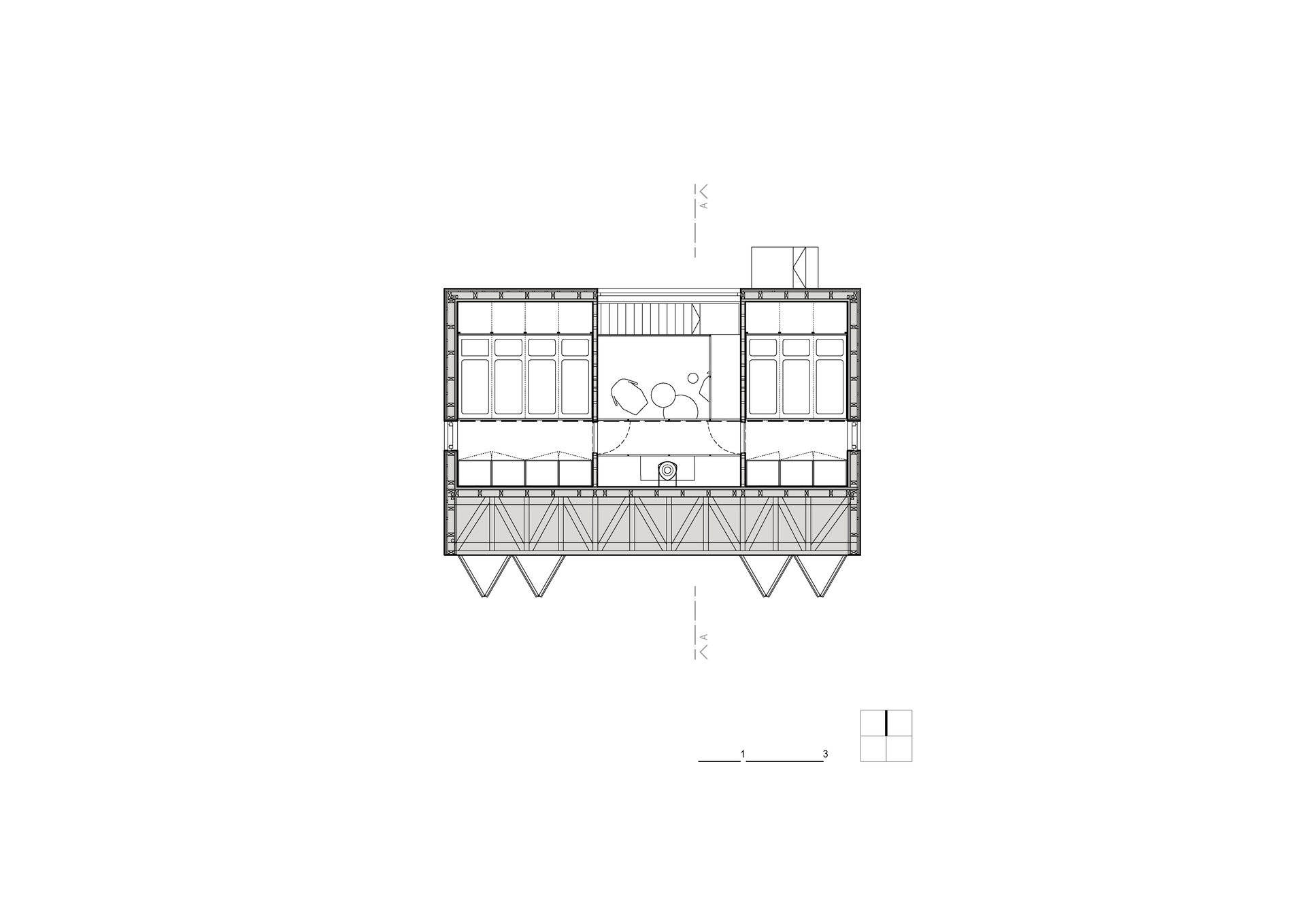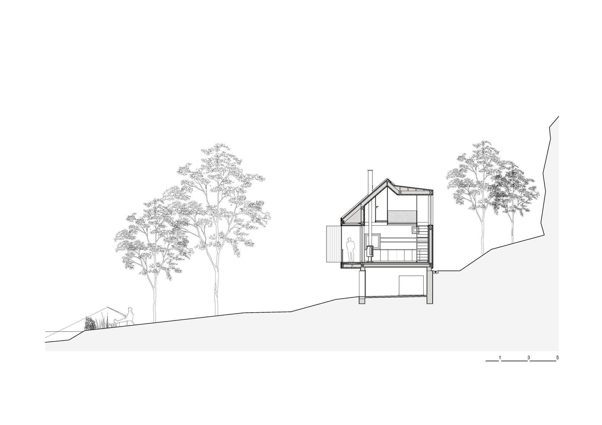Otevřený prostor spolu s kamny je navržen jako hlavní místo společného trávení času. Jeho velkorysost, daná výškou prostoru i velkým prosklením, je možná díky skromným pokojům v patře pod střechou. Ty mají sloužit převážně pro přespání. Ze spojovací lávky se díky širokému prosklení otevírá výhled do skal tyčících se za chatou.