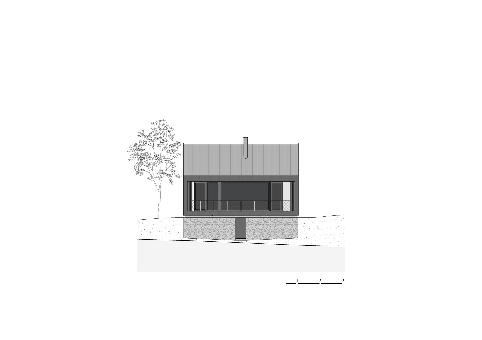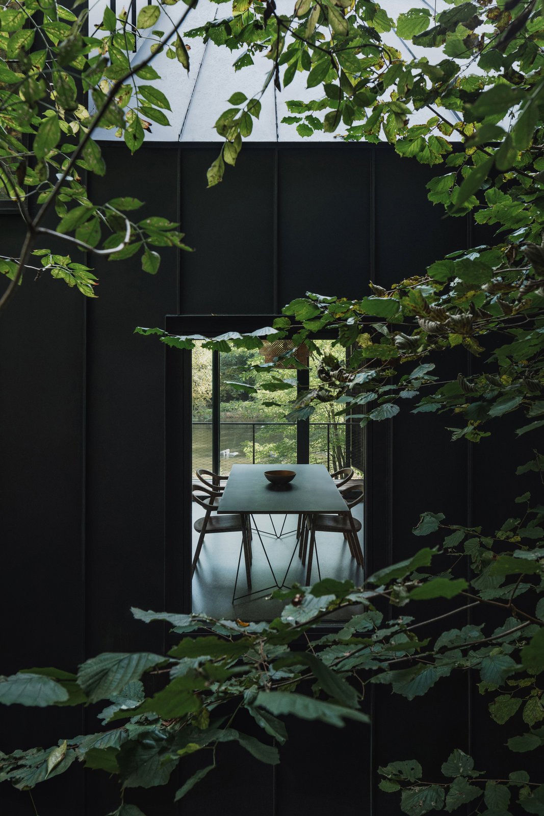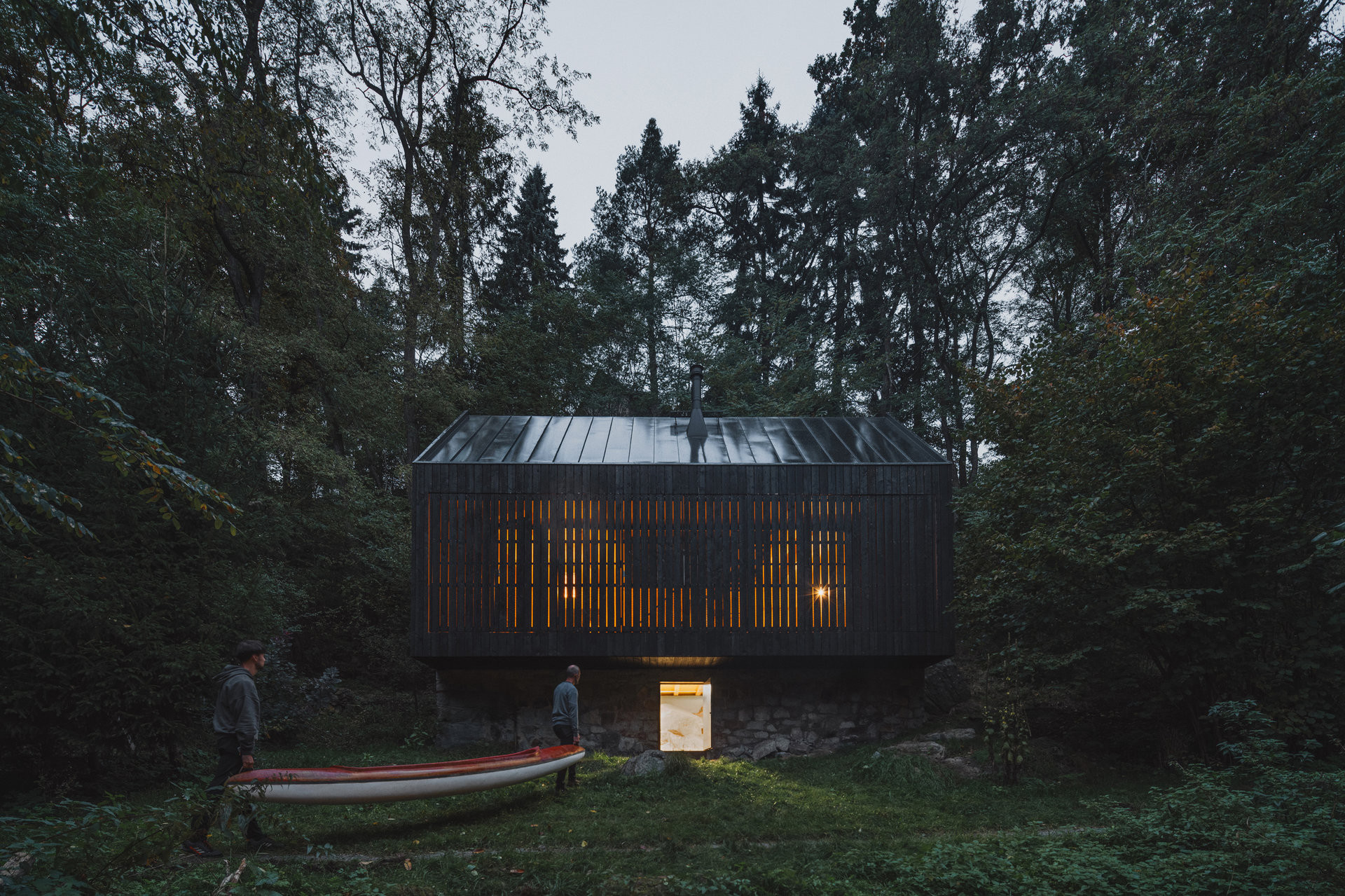 Stojí v těsné blízkosti řeky a na první pohled zůstává okolnímu světu téměř skrytá. Temná fasáda z opalovaných modřínových prken přesně zapadá do okolí, kde barevně koresponduje s blízkými tmavými skalami, které jsou pro Posázaví typické. Lehká dřevěná konstrukce je usazená na původní kamenné podezdívce, která zároveň chrání dům před zvýšenou hladinou řeky. Zároveň umožňuje vnímat řeku tak trochu z nadhledu a pozorovat veškerý cvrkot okolního lesní prostředí. To umožňuje i po celé své délce prosklená stěna orientovaná k řece. Otevírá hlavní obytný prostor směrem do krajiny, propojuje interiér s terasou a umožňuje vnímat přírodu jako přirozenou součást každodenního života v chatě.