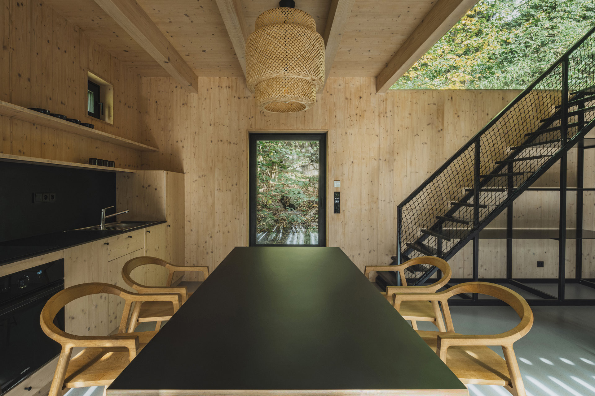 Zevnitř je dřevěná konstrukce chaty obložená smrkovou biodeskou. Interiér je tak laděný do přírodních dřevěných tónů, které se objevují i na kuchyňské lince. Černá barva se zase opakuje na kovových krbových kamnech, která celému prostoru dominují, ale také na schodišti, spojovací lávce mezi horními pokoji, zárubněmi či detaily v jídelní zóně, jako je deska jídelního stolu nebo obklad za kuchyňskou pracovní plochou. Barevně se tak propojuje interiér chaty s jeho exteriérem.