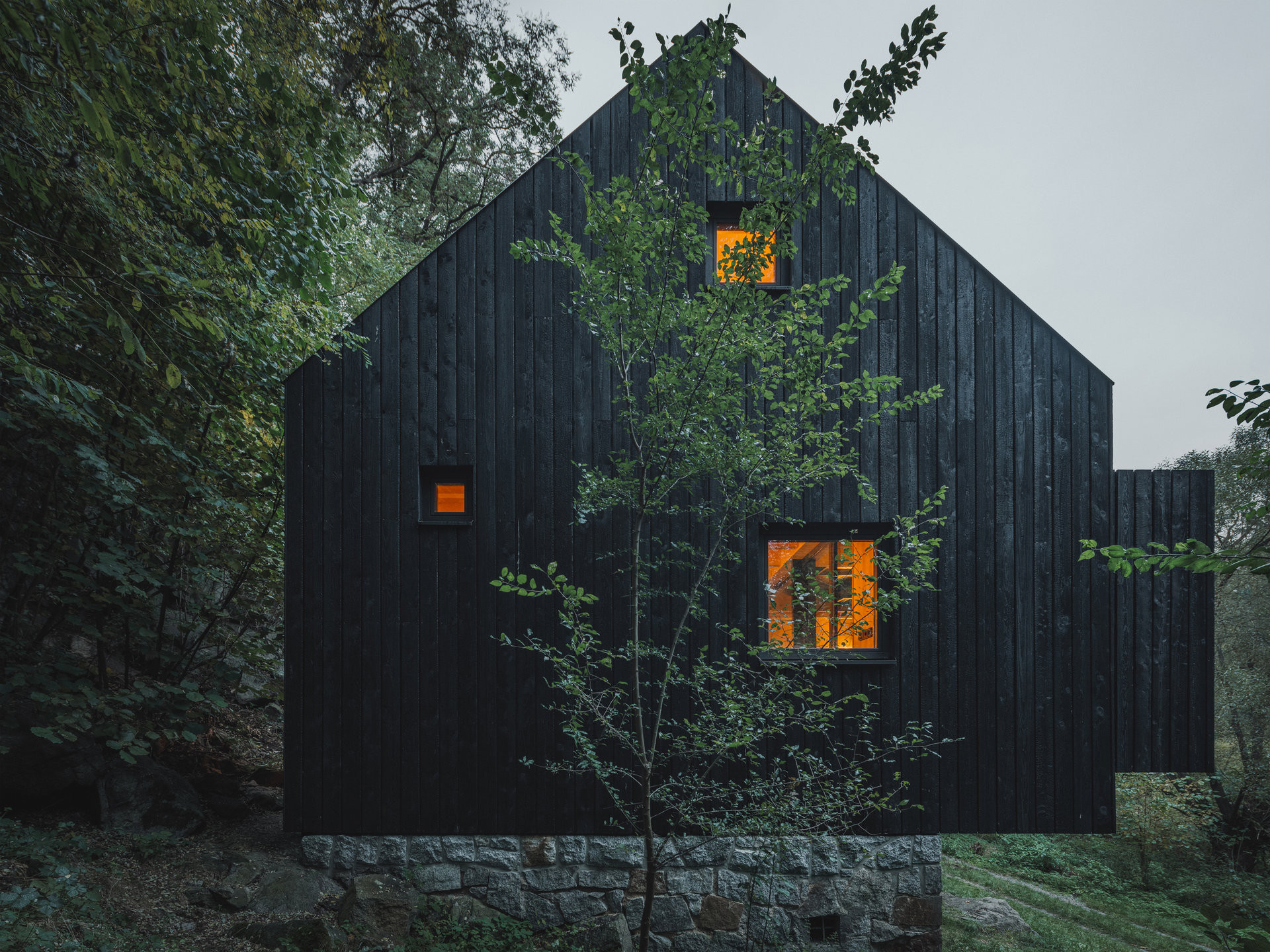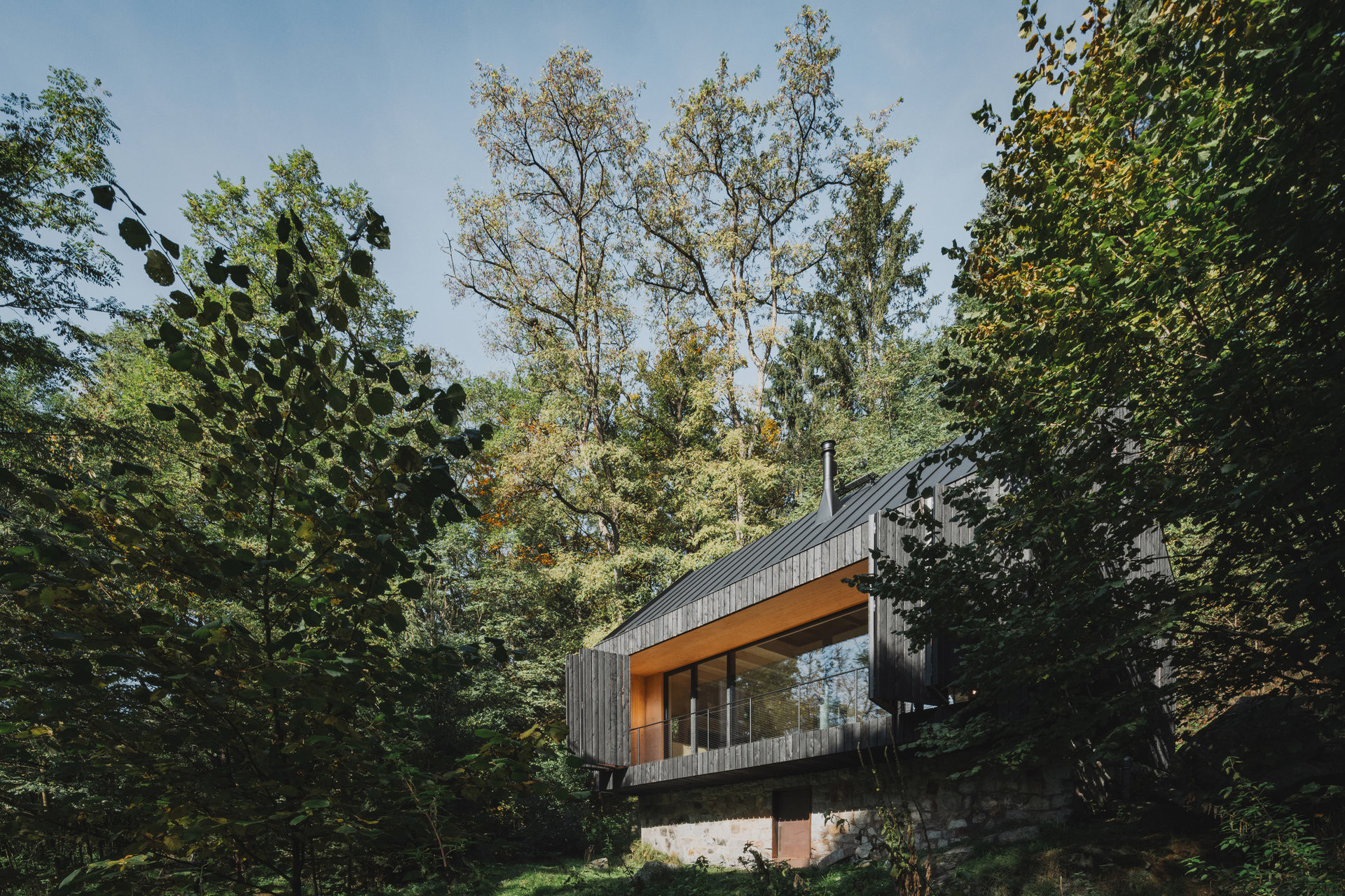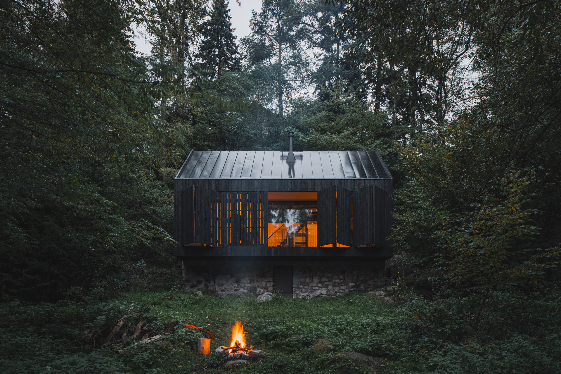 Přesně na stejném místě u Sázavy dříve stávala původní chata, která sloužila do té doby, než ji zničil požár. Jediné, co po ní zbylo, byla kamenná podezdívka, která se stala základem pro chatu novou, zvenku nenápadnou, ale při bližším pohledu velkorysou, usazenou pevně do okolní přírody. Novou podobu chaty navrhli Mimosa Architekti, kteří projekt založili na respektu k původní stopě stavby i okolní krajině.
