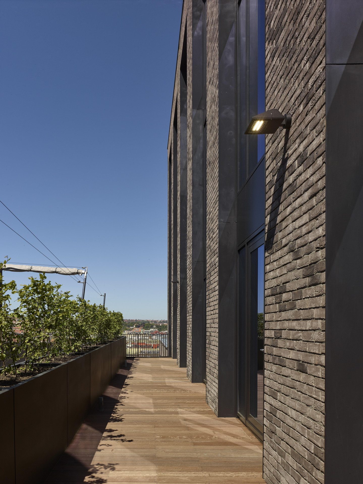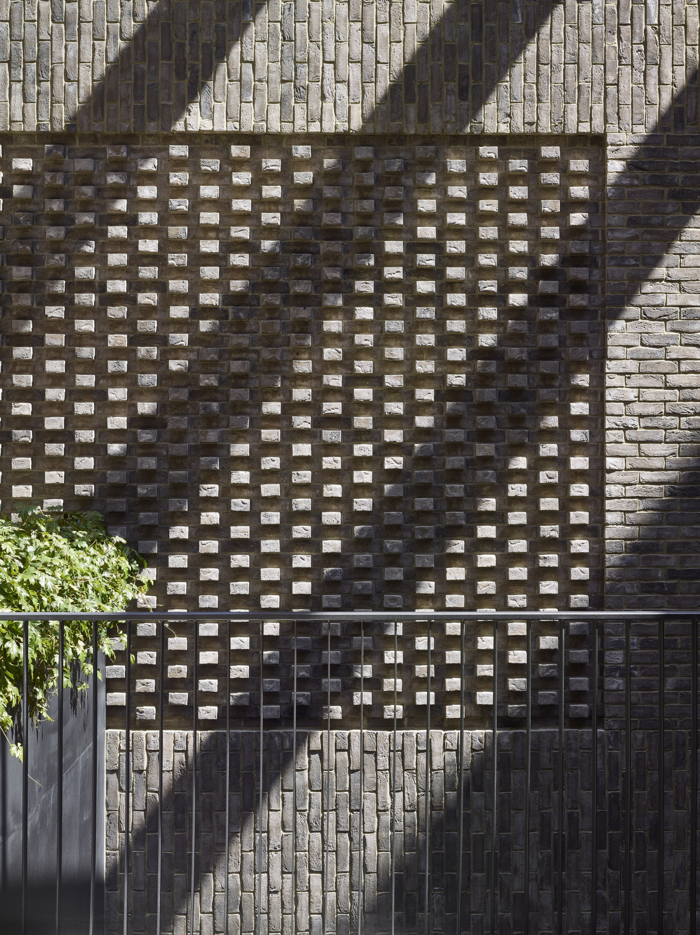 Dům na první pohled zaujme svou fasádou z neomítaného režného zdiva. Jak již bylo zmíněno, cihlová fasáda objektu propůjčuje charakter, kterým navazuje na charakter svých společníků obklopujících náměstí. Na fasádu bylo použito lícové zdivo produktové řady značky Terca od osvědčeného výrobce Wienerberger. Skrze široké portfolio produktů značky Terca, je možné si vybrat z několika typů fasádních systému a v různých barevnostech. Pro Churchill II. byl zvolen tmavý odstín zdiva, čímž bylo dosaženo zajímavého kontrastního vztahu s vedlejším objektem Churchill I., který je zahalen do čistě bílé obálky. Cihlová fasáda tak napomáhá zjemnění měřítka domu a dělá z něj pevně stojící dům, který doplňuje významné náměstí o další městotvorný objekt.