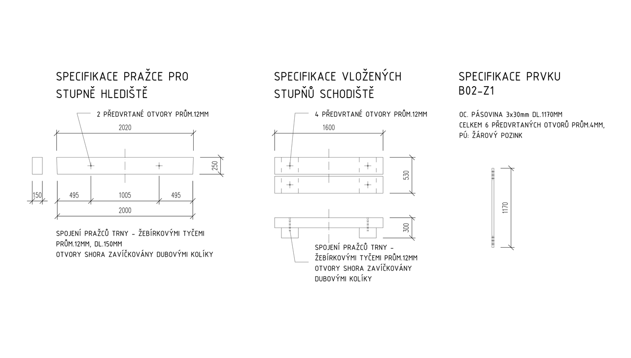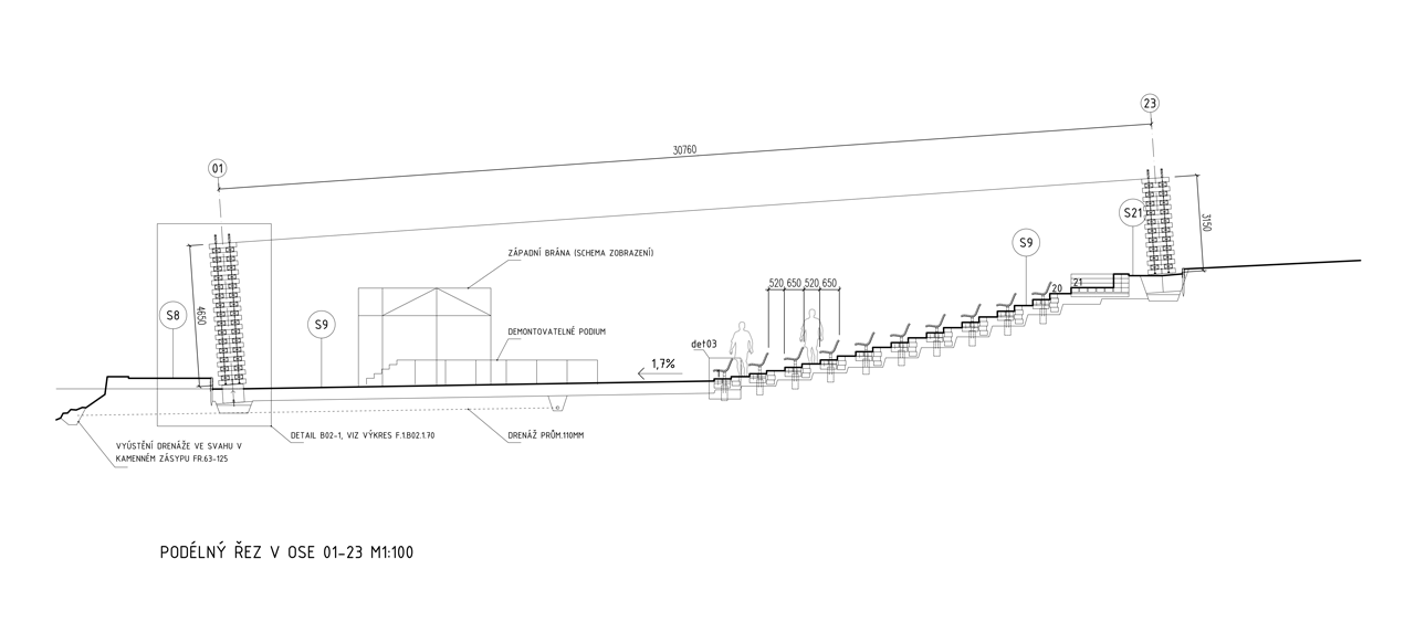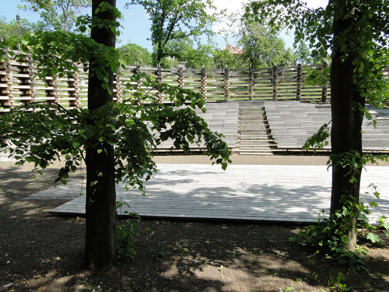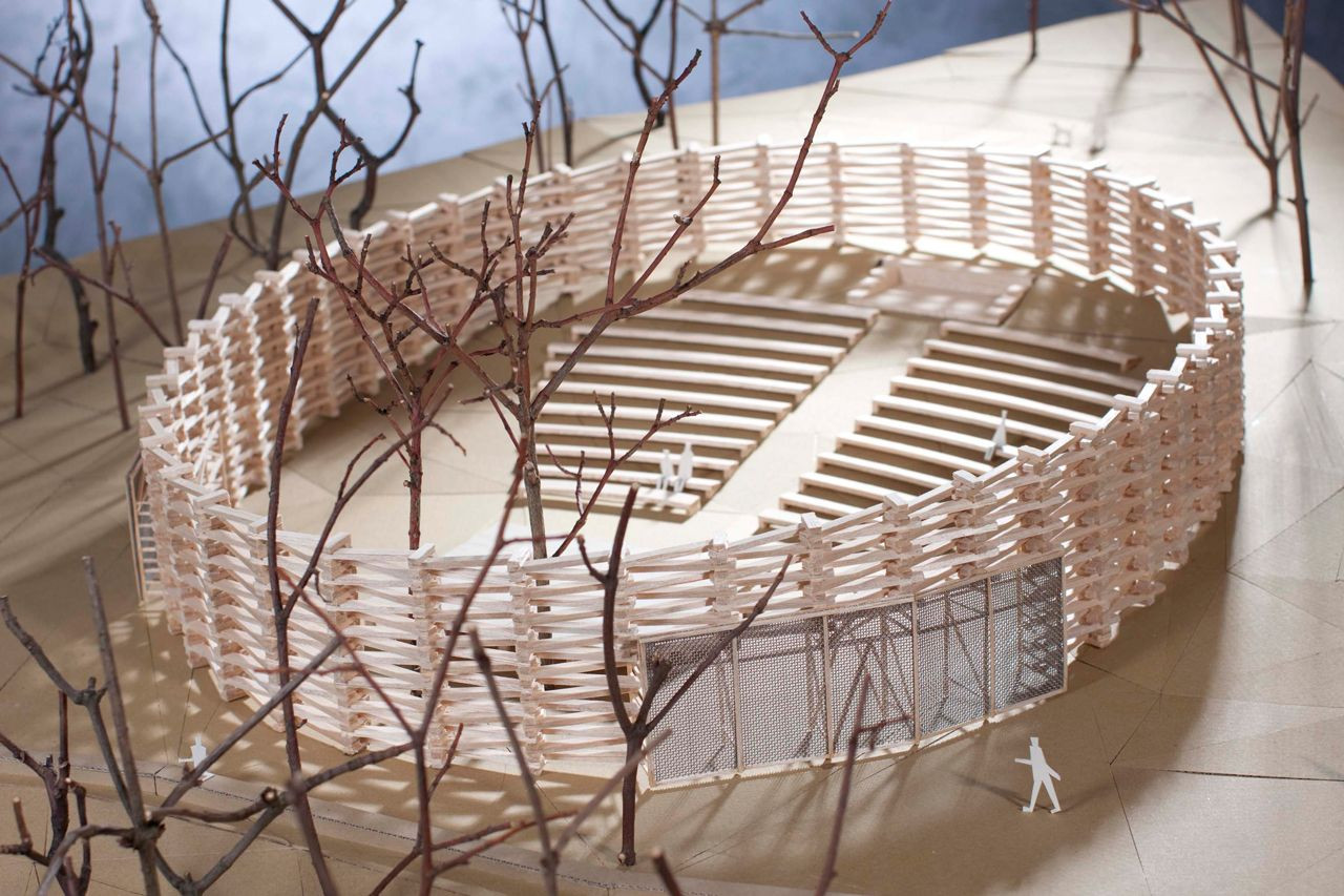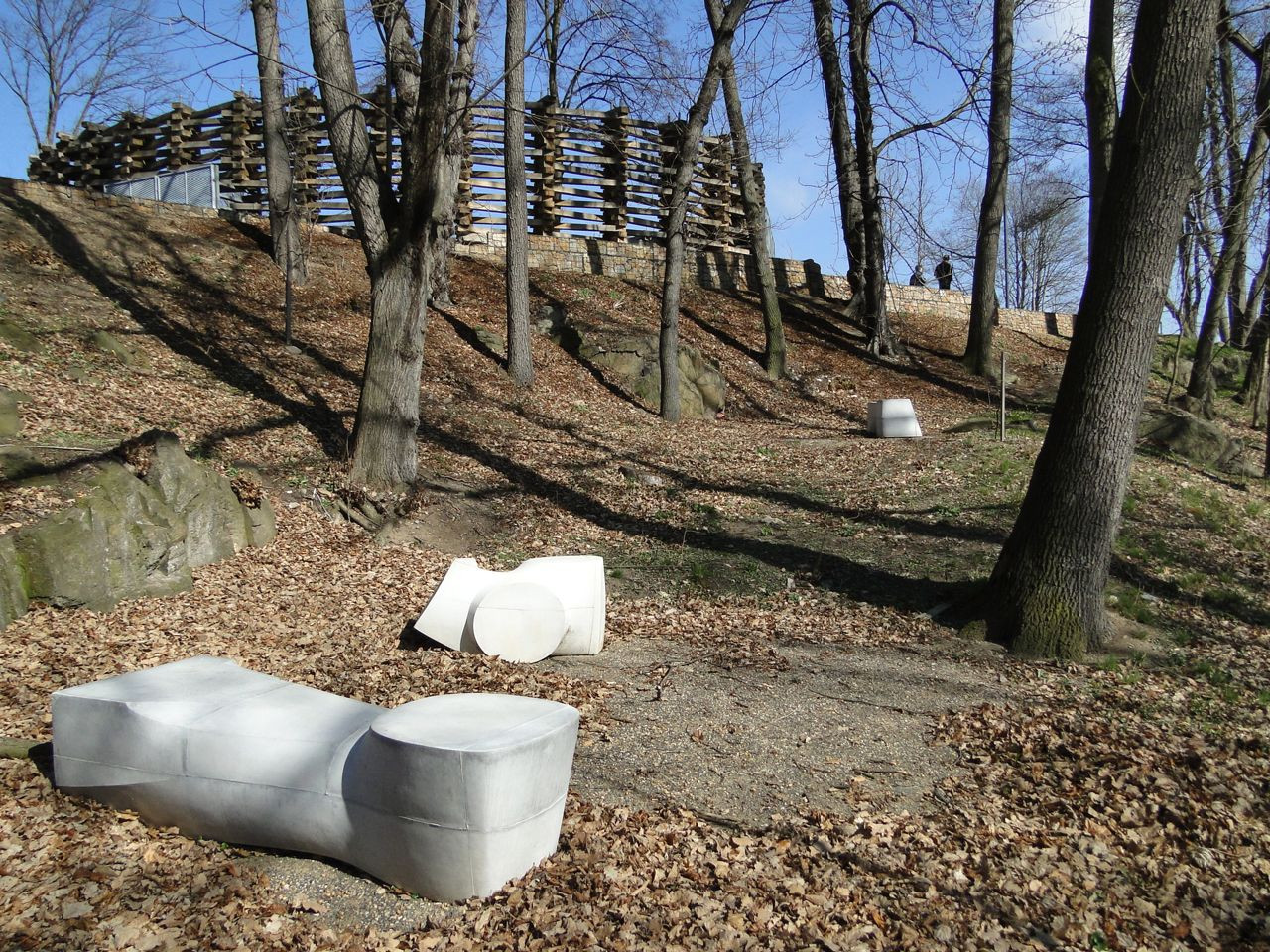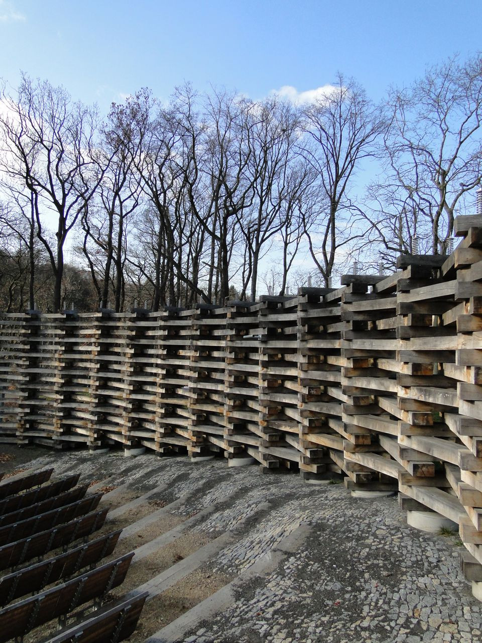 Oblečená neoblečená, obutá neobutá. Přes tisíc vzájemně propletených a ocelovými táhly sepnutých dubových pražců vymezuje na rozhraní města a krajiny místo. Travnatá mírná stráň obrácená k jihu na okraji menší dubiny přímo láká k tomu vstoupit dovnitř a posedět, i když se tu zrovna „nehraje“.