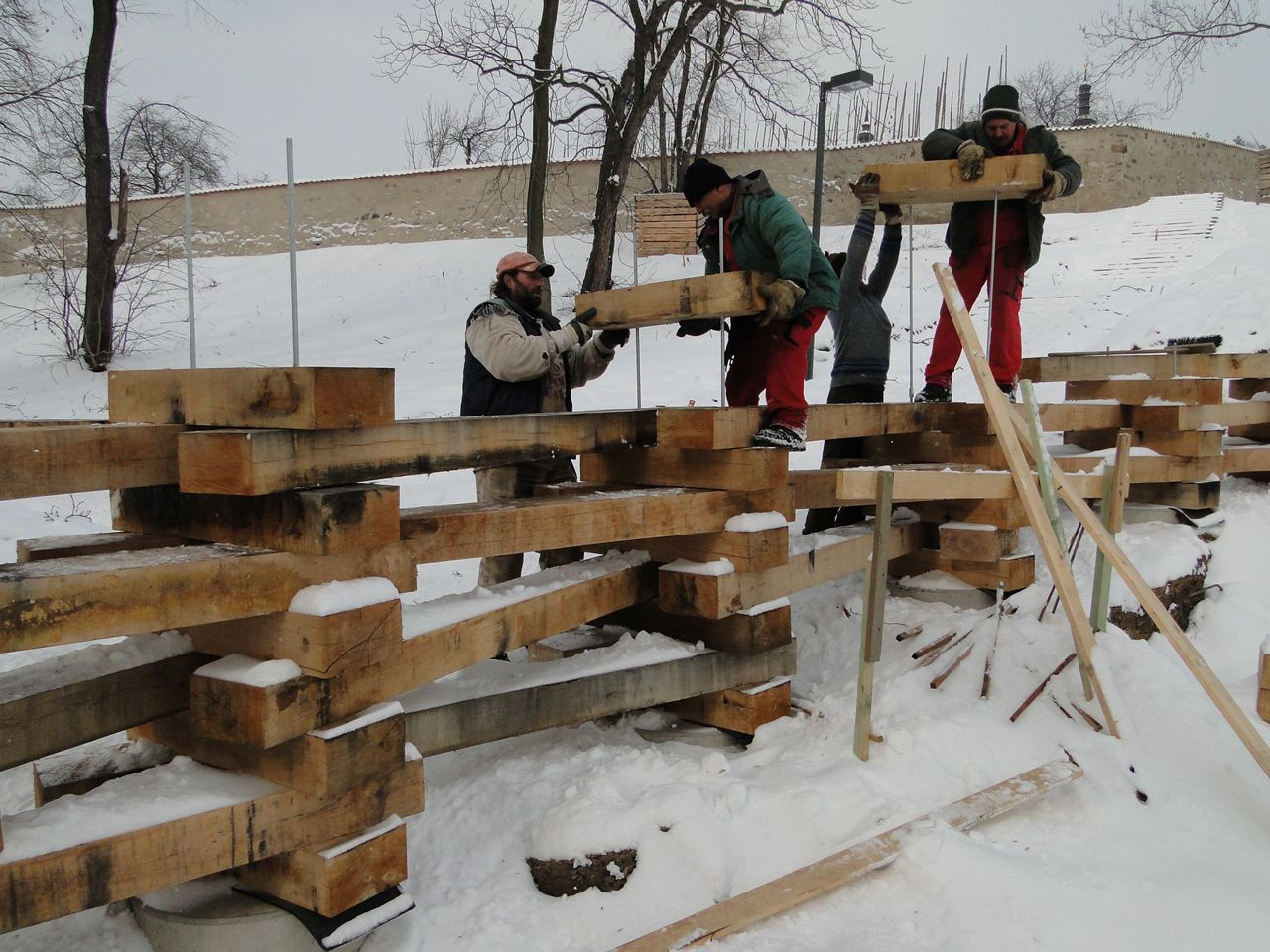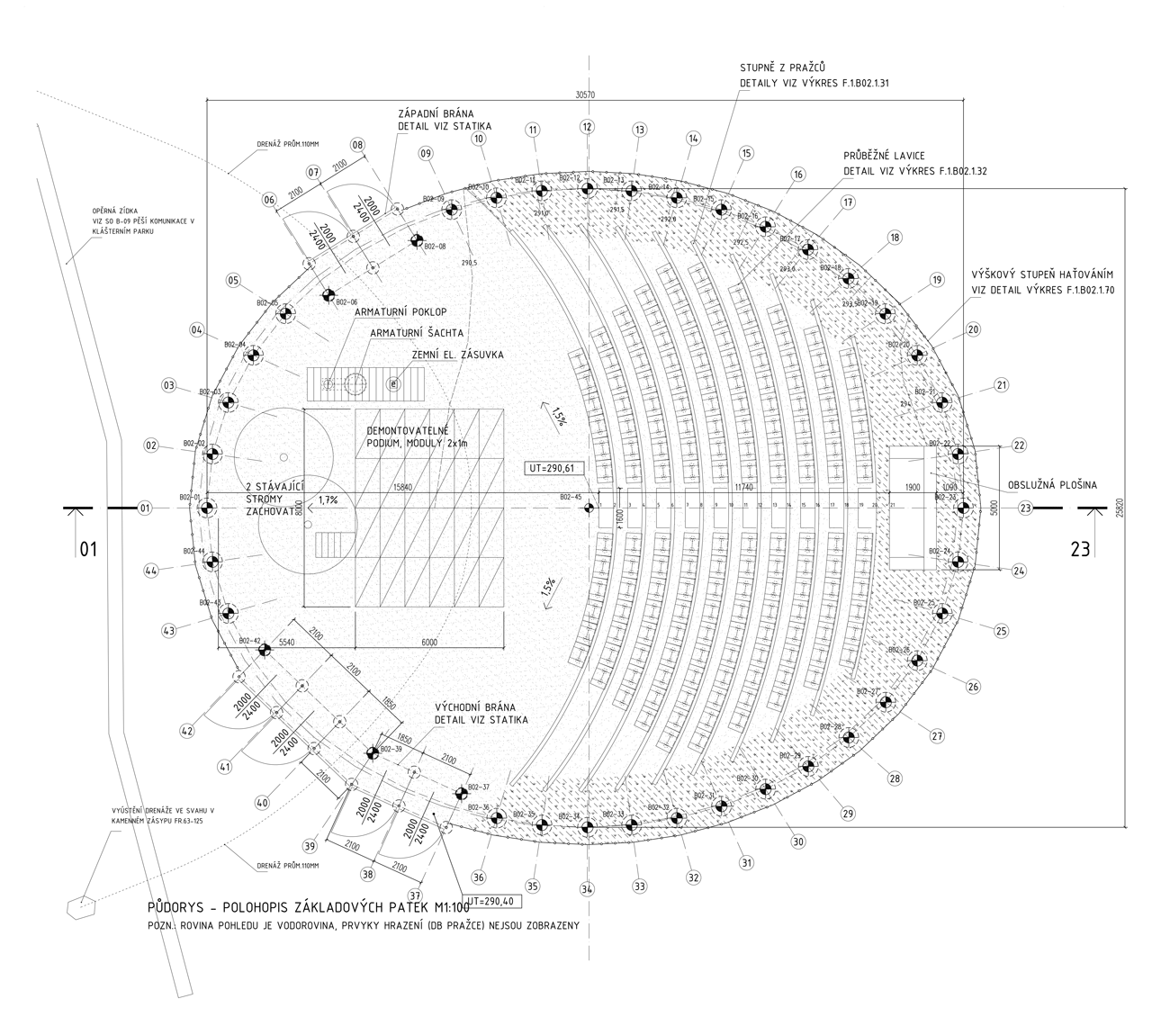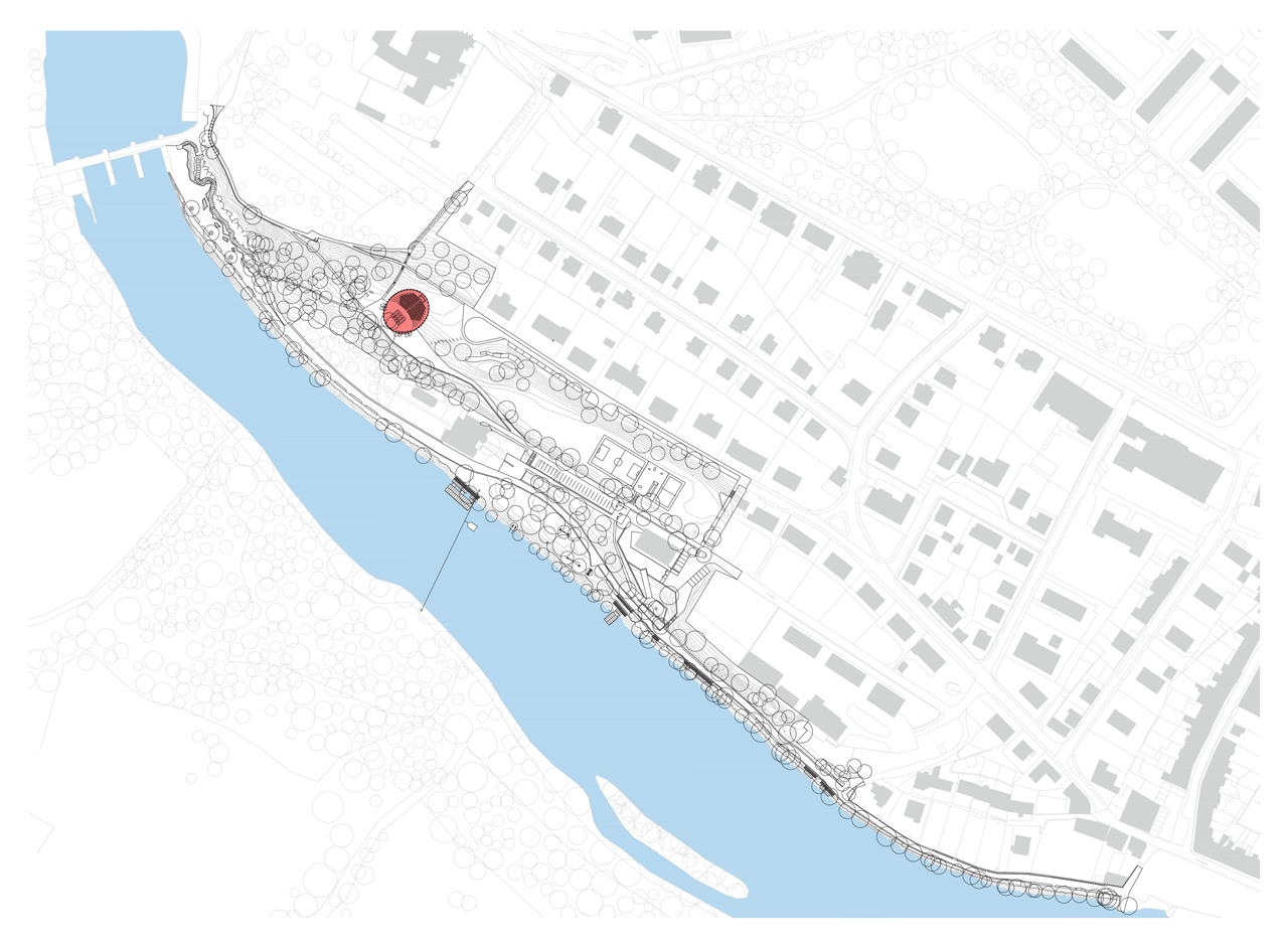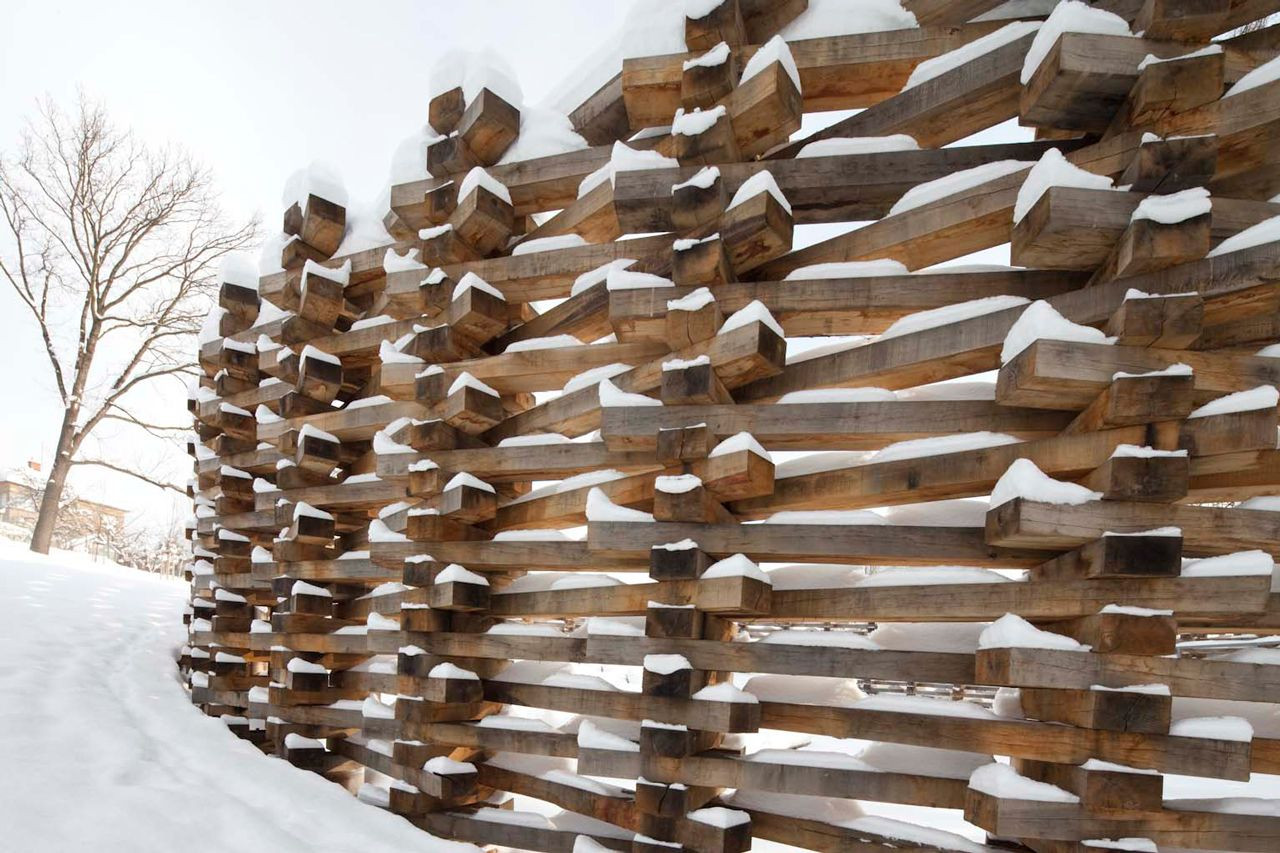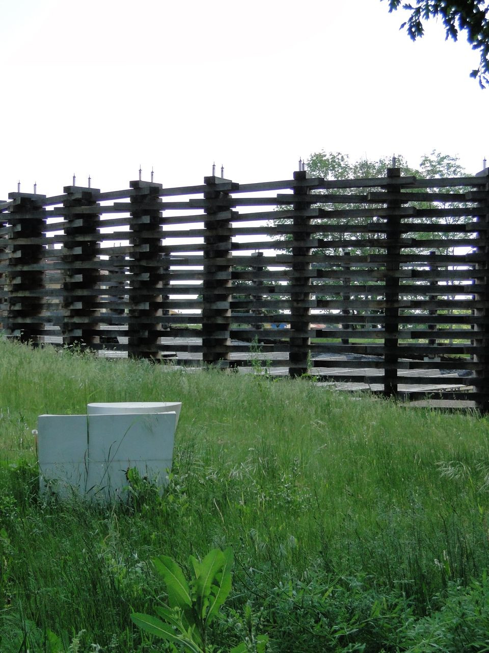 Oblečená neoblečená, obutá neobutá. Přes tisíc vzájemně propletených a ocelovými táhly sepnutých dubových pražců vymezuje na rozhraní města a krajiny místo. Travnatá mírná stráň obrácená k jihu na okraji menší dubiny přímo láká k tomu vstoupit dovnitř a posedět, i když se tu zrovna „nehraje“.