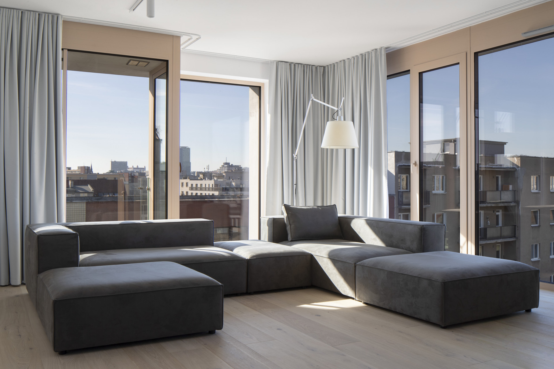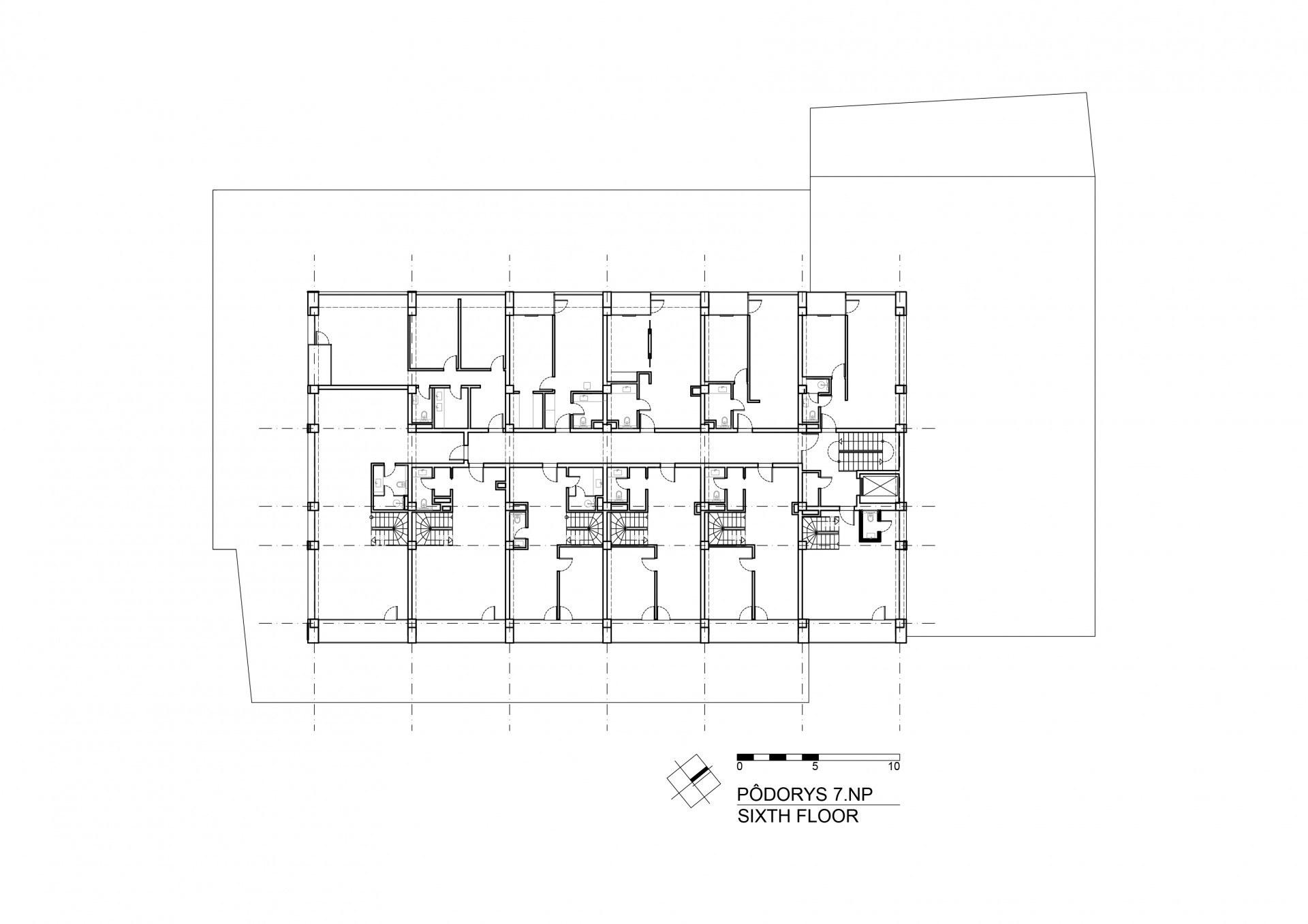 Na osmi podlažích se dnes nachází prostory pro obchody i kanceláře, většinu pater ovšem zaplnily byty. Architekti ze studia Cakov+partners k původní stavbě přidali jednopodlažní nástavbu a také dvě přístavby, které původní budovu ve spodní části obestupují. „Nová hmota domu respektuje původní urbanismus území, ve kterém je osazen. I když je budova o něco zvětšená, zapadá do prostředí citlivě, komunikuje s okolím a nenarušuje jeho původní charakter,“ říkají autoři návrhu konverze. Nové hmoty navíc navazují na původní modulární síť stavby.