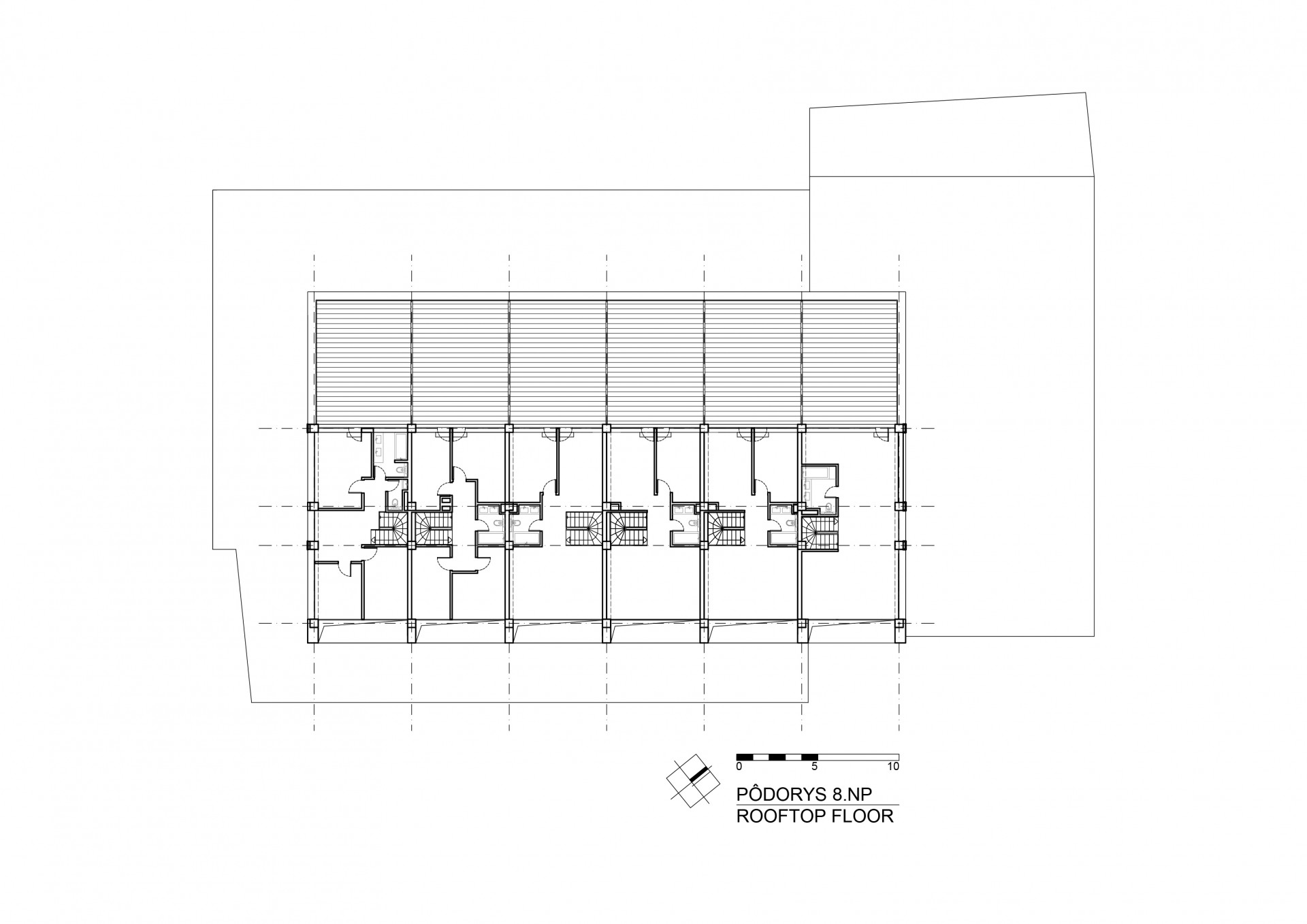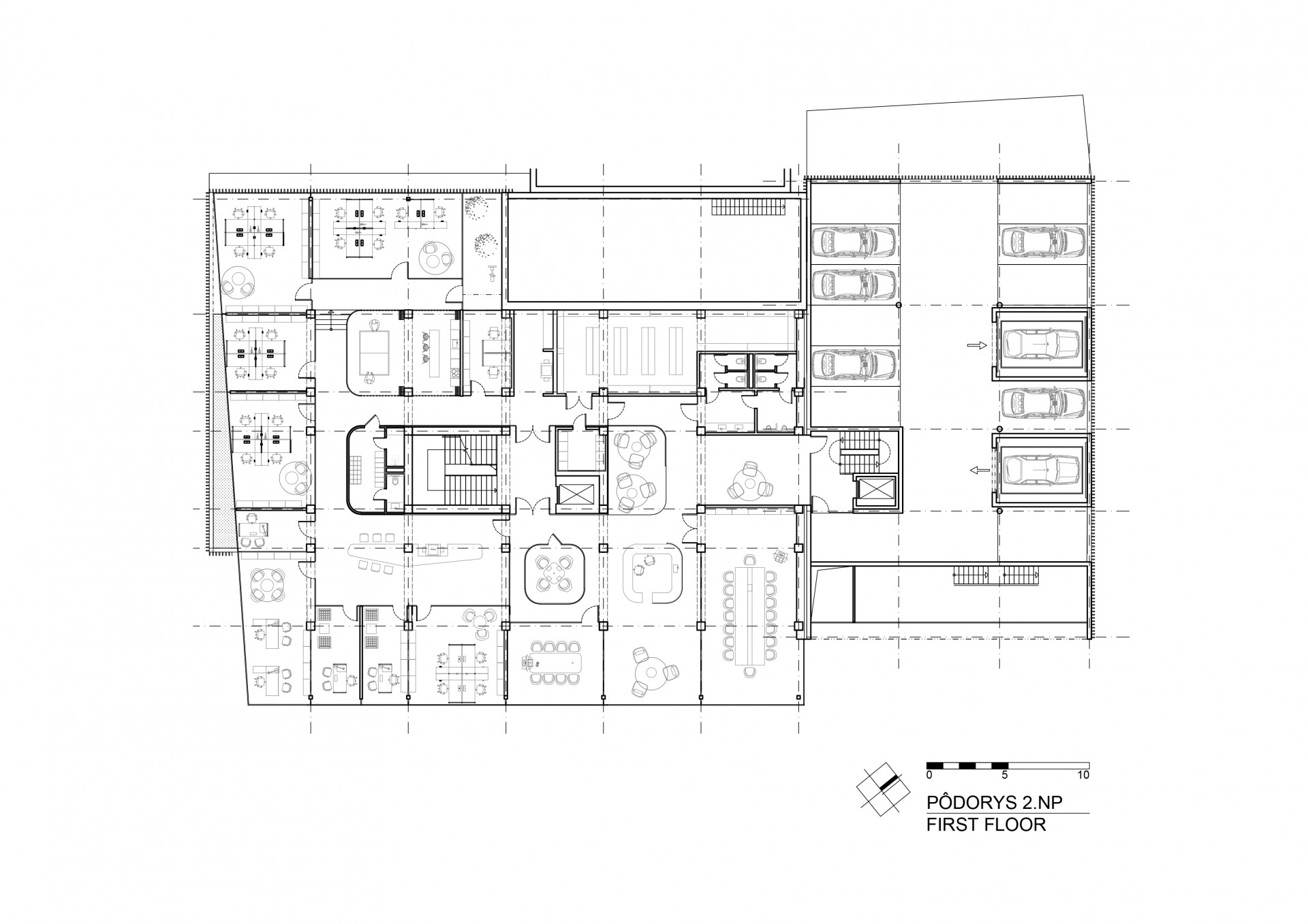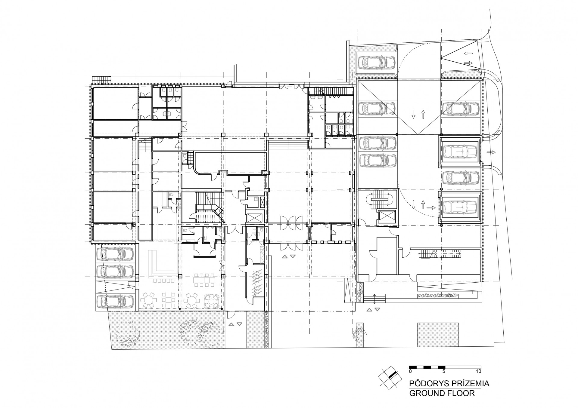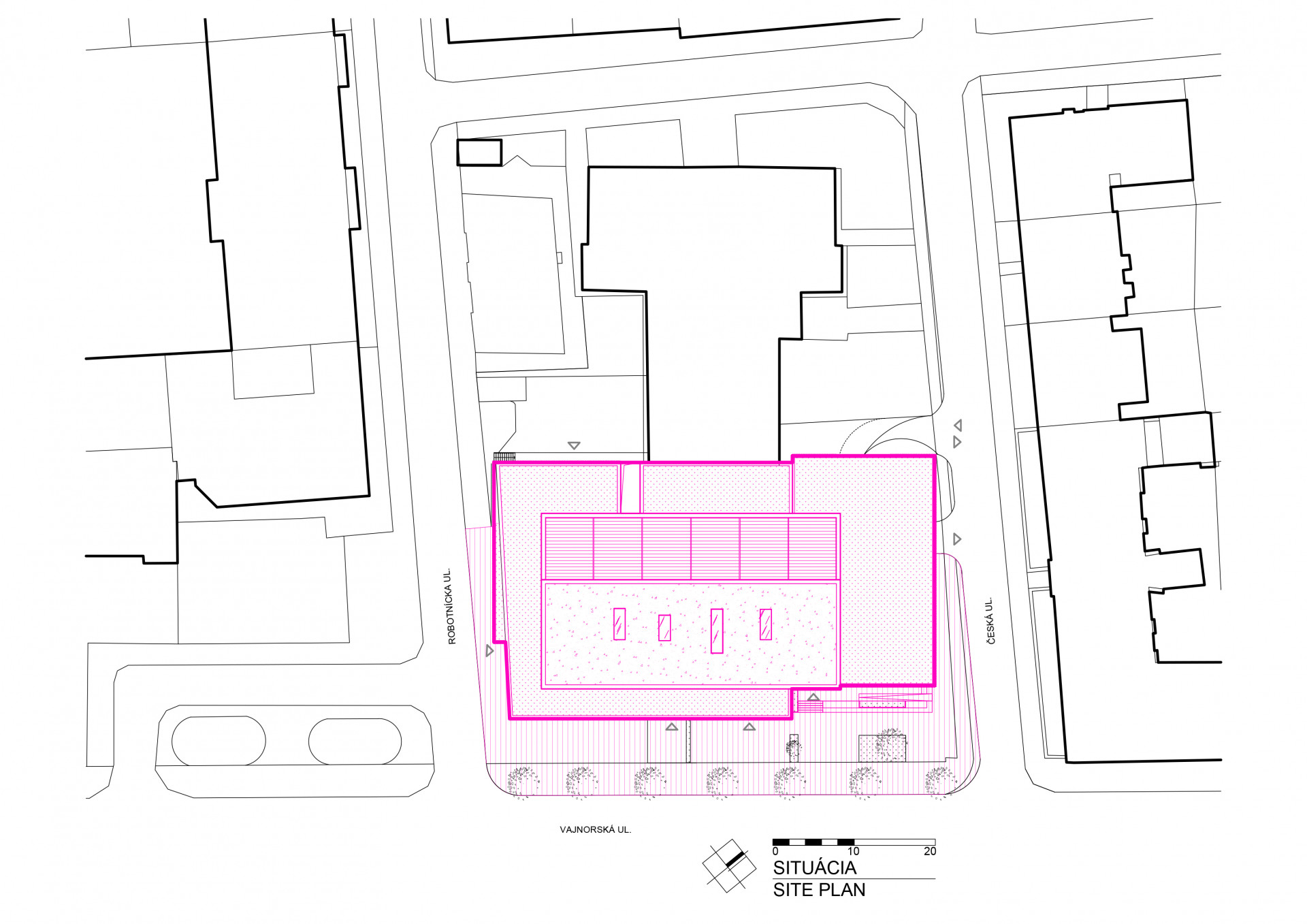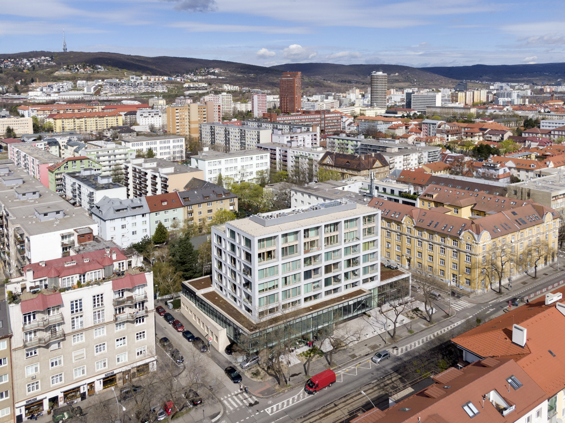 Dům na adrese Vajnorská 21 stojí jako solitér, ze tří stran ho přímo obklopují ulice. Architekti však chtěli do místa vnést i nějaký pestřejší veřejný prostor. „Namísto původního chodníku se vytvořil prostor, ve kterém lidé rádi pobývají – je v něm život,“ vysvětlují. Fungování malé piazzetty podporuje prosklený obchodní parter s místem pro kavárnu a pekárnu. Přízemím polyfunkčního domu se dá zároveň projít do místního kulturního střediska, které se k objektu připojuje ze zadní strany – malé náměstí je tak i jeho předpolím.