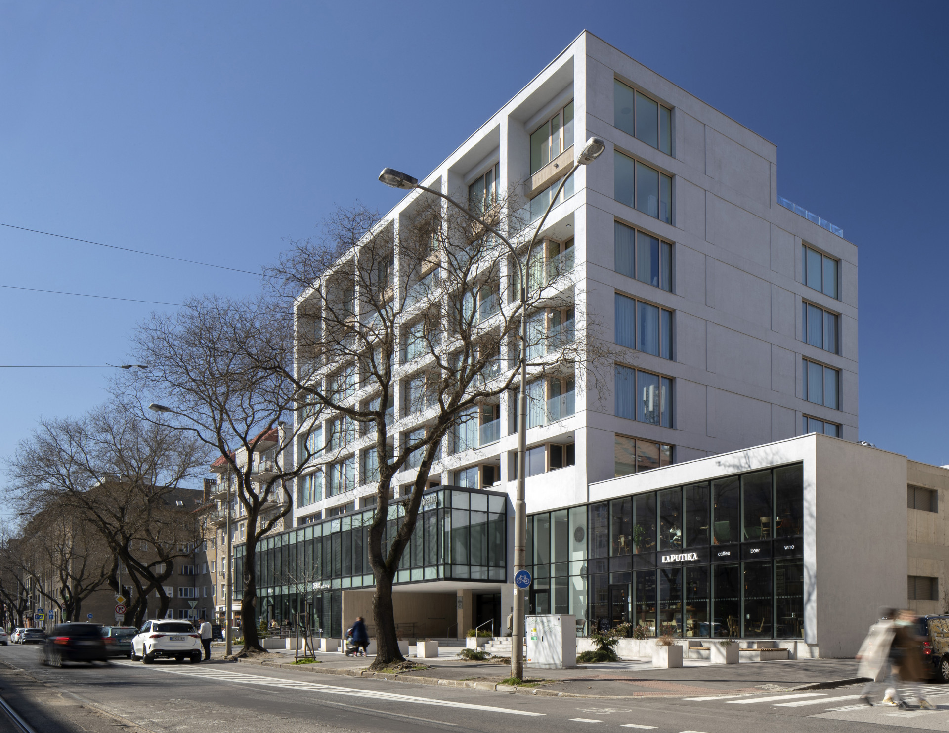 Původní pásová okna nahradila rozměrná francouzská, která přirozeně prozrazují rastr původního železobetonového skeletu. „Velká zasklení prosvětlují byty s nadstandardní světlou výškou 2, 9 metru zároveň dávají domu odlehčený vzhled,“ dodávají architekti. Díky dovnitř zapuštěným lodžiím si dům navíc zachoval kultivovaný městský vzhled, jeho fasády nic nezatěžuje ani nezakrývá. Celková koncepce také jasně říká, co se kde nachází. Na obchodní parter nasedá administrativní patro s prosklenými fasádami, za „klasickými“ okny se už nacházejí jen byty. Architekti ze studia Cakov+partners si za konverzi původně kancelářské budovy z 80. let odnesli nominaci na Cenu slovenské komory architektů CEZAAR 2022.