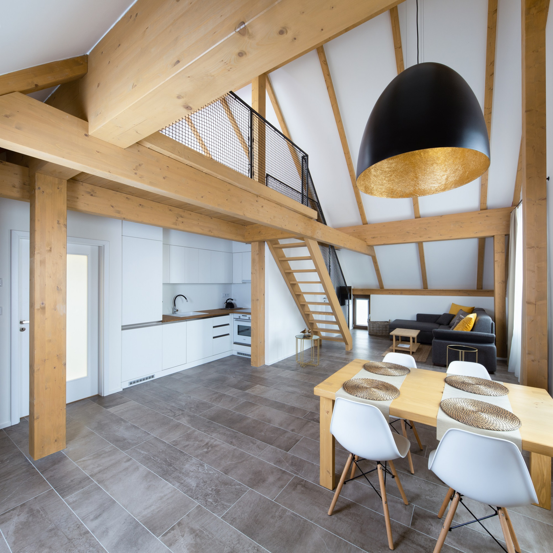 První a druhé patro Restortu Eisgrub zahrnuje dohromady dvacet menších bytů. V prvním patře jsou byty větší a jednopodlažní, ve druhém architekti navrhli mezonety, které chytře využívají podkrovní prostor. Interiéry jsou laděné do neutrálních odstínů, které nechávají vyniknout dřevěné prvky čítající podpěrné trámy, schody, vestavěnou kuchyň nebo jídelní set. Minimalistická bílá výmalba pomáhá šíření světla, které dovnitř proudí i střešními okny.
