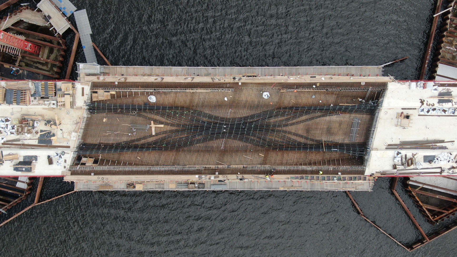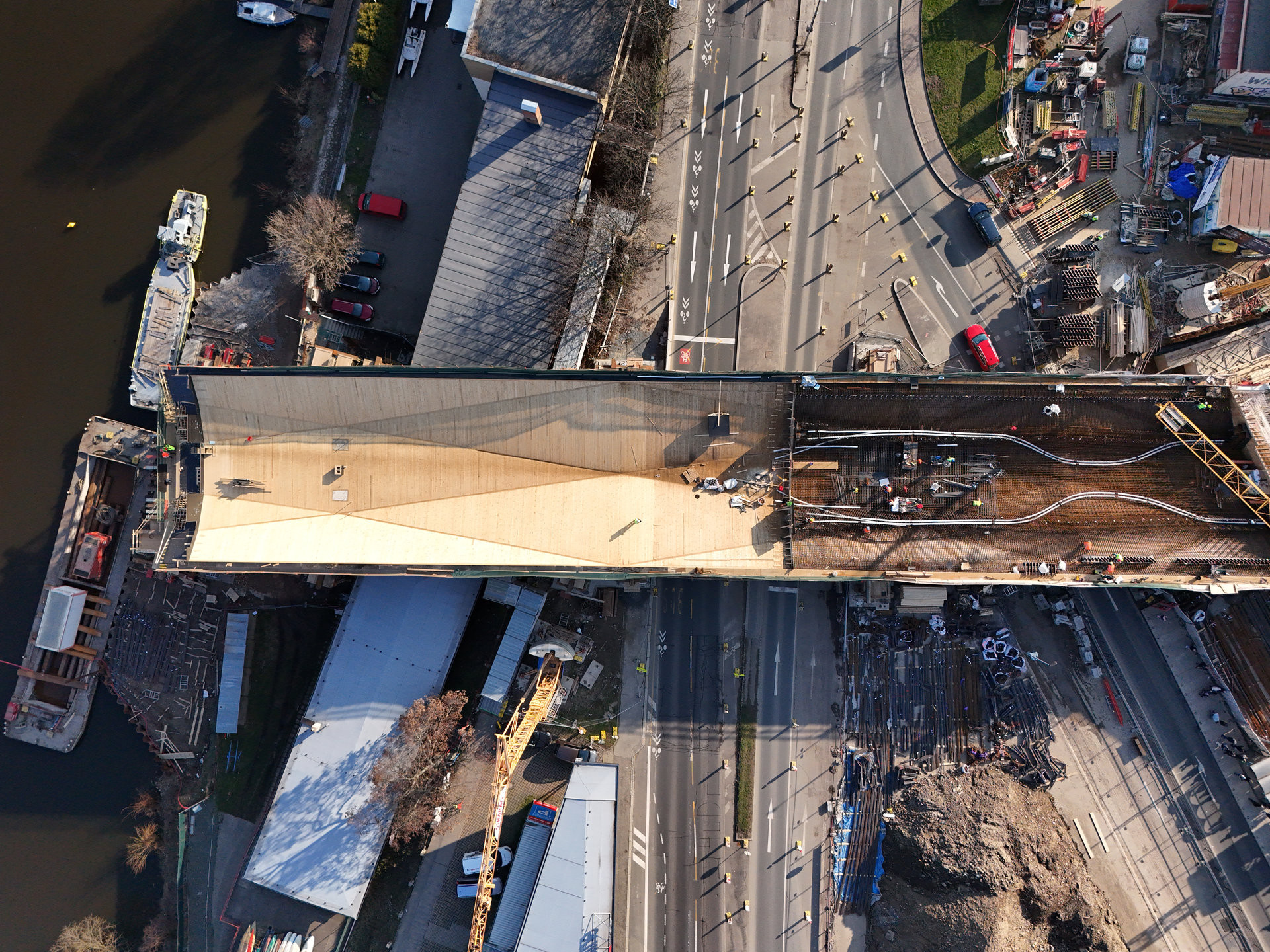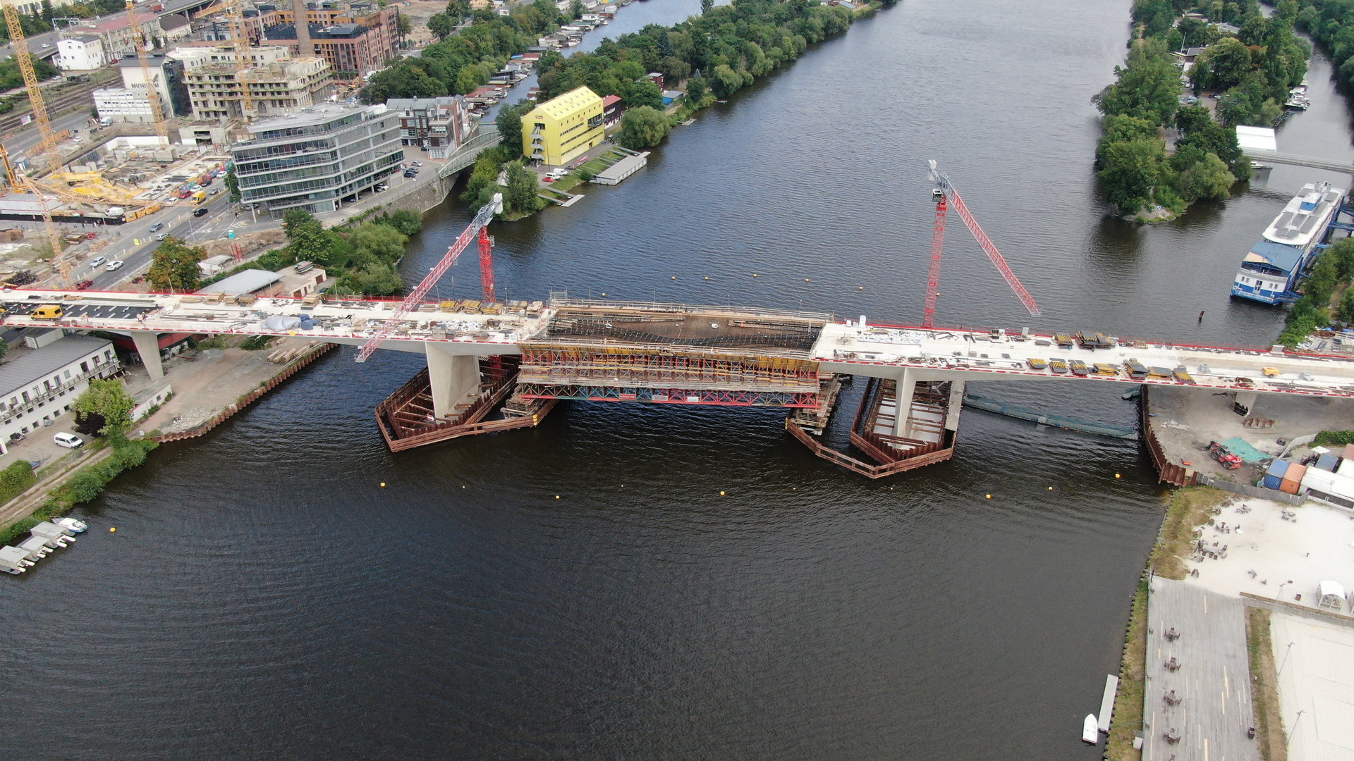 V současnosti se dokončuje poslední pole nosné konstrukce, montuje se tramvajová dráha, zábradlí a sloupy osvětlení. Zároveň postupují práce na obou předpolích a v navazujících veřejných prostorech. Otevření mostu pro dopravu, pěší i cyklisty se očekává na jaře 2026, kompletní dokončení okolních úprav pak během roku.