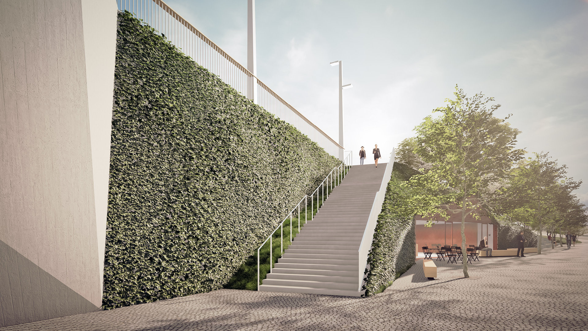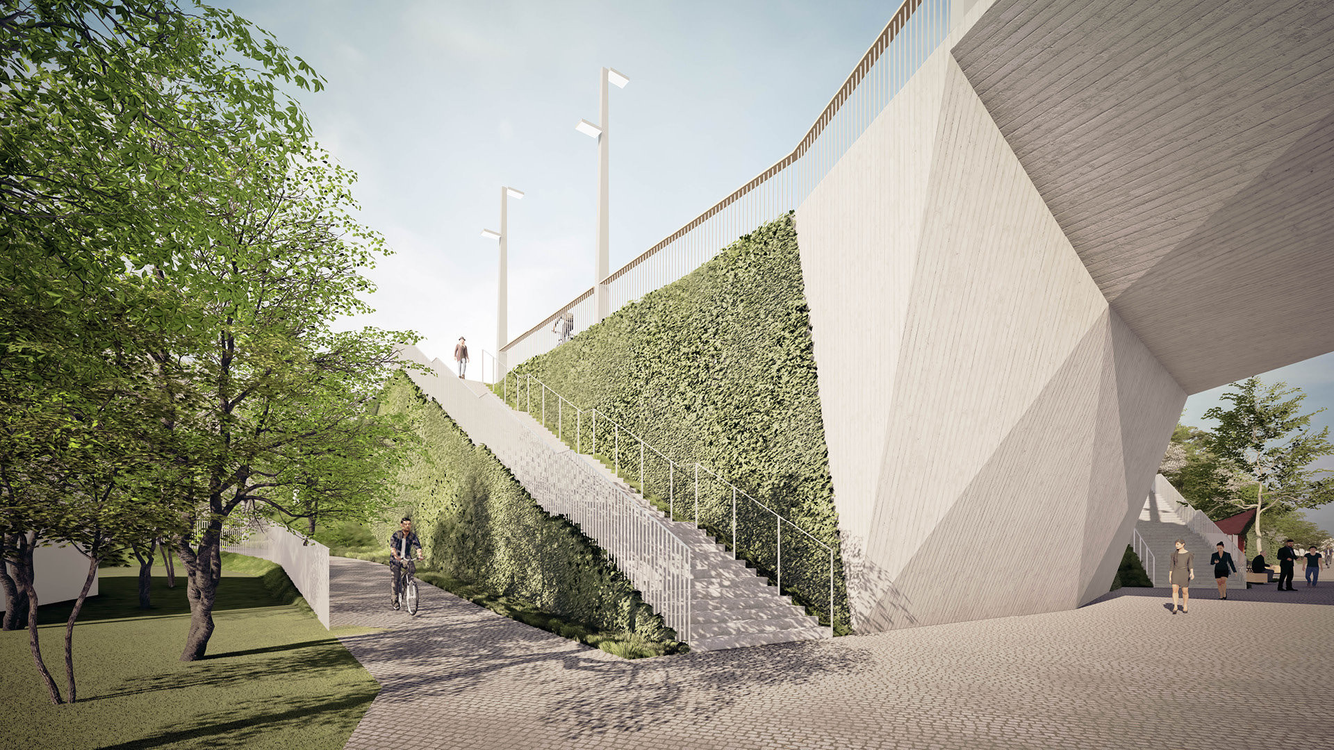 Kubisticky lomené plochy nosné konstrukce navíc reagují na specifika místa – most je výrazně šikmý vůči Vltavě a překonává významný výškový rozdíl mezi oběma břehy. Bílý beton a sochařské tvarování dávají mostu výraz, který je současný, ale zároveň pevně zakořeněný v pražské tradici.