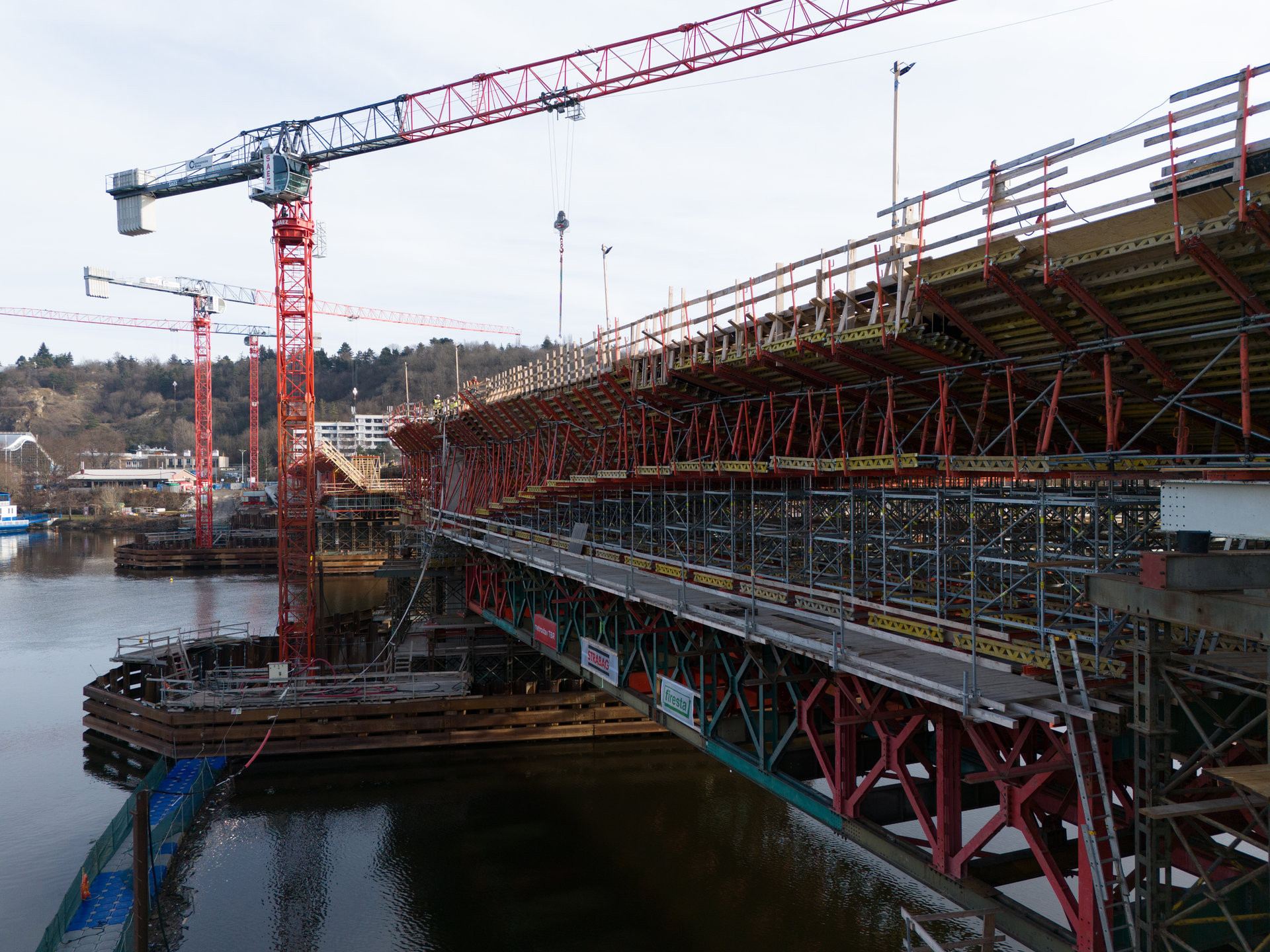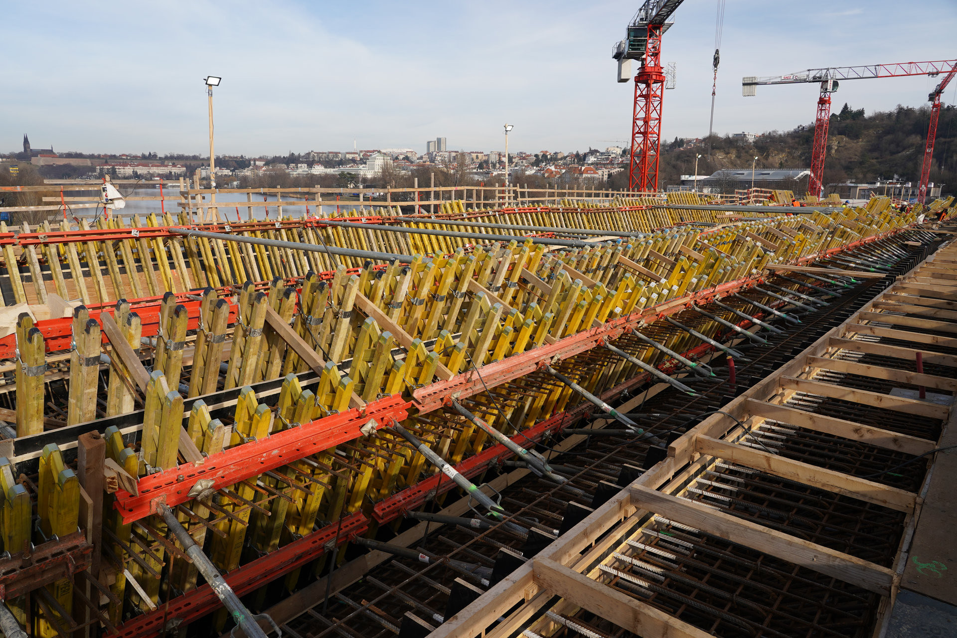 Jednou z největších výzev ale byla samotná realizace nosné konstrukce. Kubistické tvarování Dvoreckého mostu vyžadovalo precizní 3D návrhy a pečlivé řešení každé části konstrukce. Vysoké nároky na pohledový beton neumožňovaly tolerovat otisky spár či nerovnosti, proto bylo nutné kombinovat systémové prvky se zakázkovými díly. Lešení, systémy bednění a další prvky pro výstavbu dodala společnost PERI – úzce spolupracovali s projektanty i zhotovitelem a koordinovali návrh bednění tak, aby byla zajištěna přesnost tvaru, návaznost jednotlivých fází i bezchybná logistika.