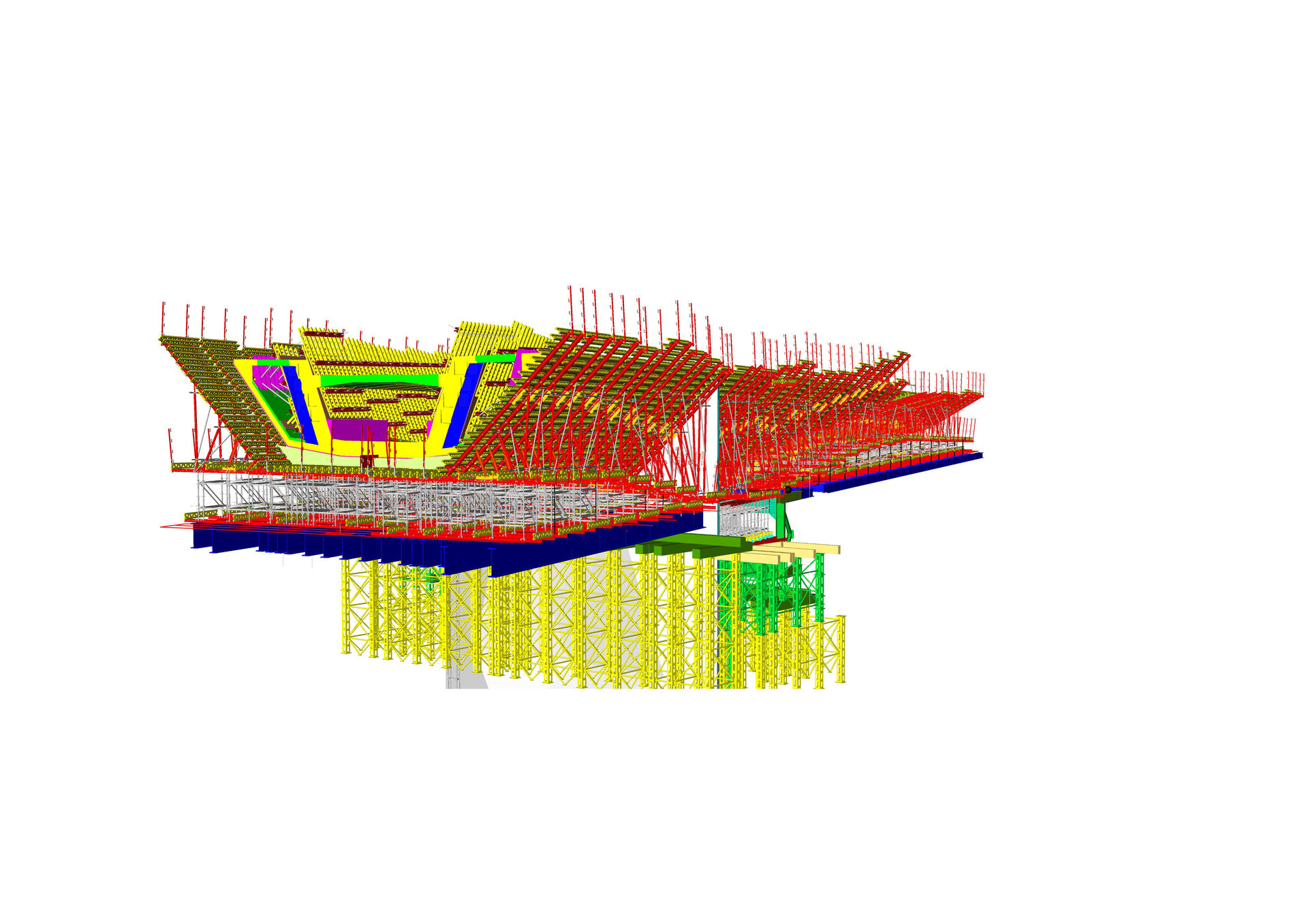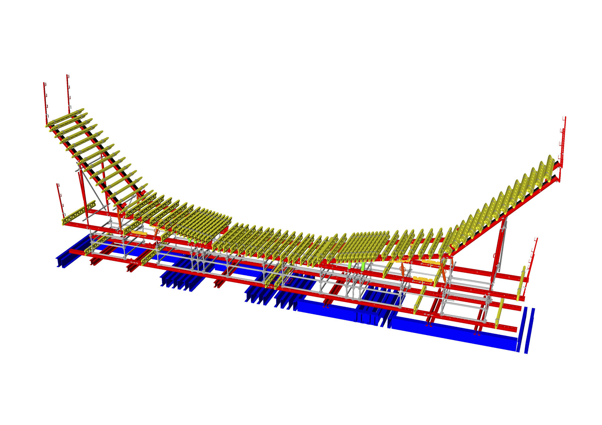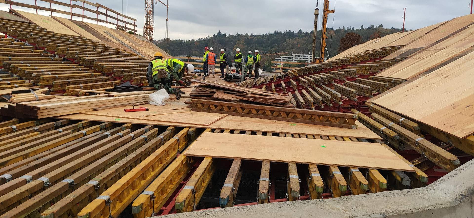 Pro pohledové plochy byl použit variabilní systém VARIO, nepohledové části vznikaly pomocí rámového bednění TRIO. Prostorové lešení PERI UP zajišťovalo podepření složitých úseků a inženýrská stavebnice VARIOKIT vytvořila hrubý obrys mostovky. Klíčové byly zakázkově vyráběné ramenáty podle 3D modelů, které umožnily dosáhnout přesné geometrie i požadované struktury povrchu. Kombinace systémových řešení a minimálního množství atypů zajistila efektivní postup i vysokou kvalitu výsledku.