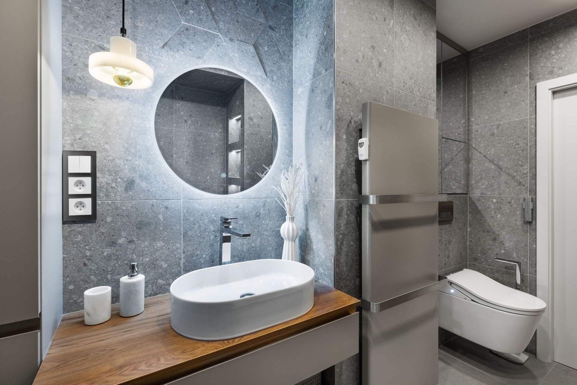 Koupelna sousedící s chodbou byla sice nejmenší místností proměny, zato největším oříškem. Řeší ho většina majitelů bytu, a to aby pračka nebyla dominantou koupelny. Designérka Kristýna z Xtina Design toto potvrzuje: „Jednoznačně nejtěžší kalibr bylo dispoziční rozvrhnutí koupelny. Byla velmi malá, a navíc se dvěma sloupy, které ztěžovaly rozmístění jejího vybavení. Aby toho nebylo málo, majitelka potřebovala do koupelny dostat ještě pračku se sušičkou! Ty jsme nakonec schovali za posuvnou dřevěnou laťkovou stěnou. Je tak kdykoli k dispozici a přitom nenarušuje estetický dojem z koupelny.“ Naopak výhodou bylo, že koupelna má okno a díky tomu odpadl problém s absencí přirozeného světla a větrání. I tady chladný kámen doplnily teplé tóny dřeva a přísné tvary topného žebříku nebo vypínačů zjemnily kulaté zrcadlo a oválné umyvadlo.