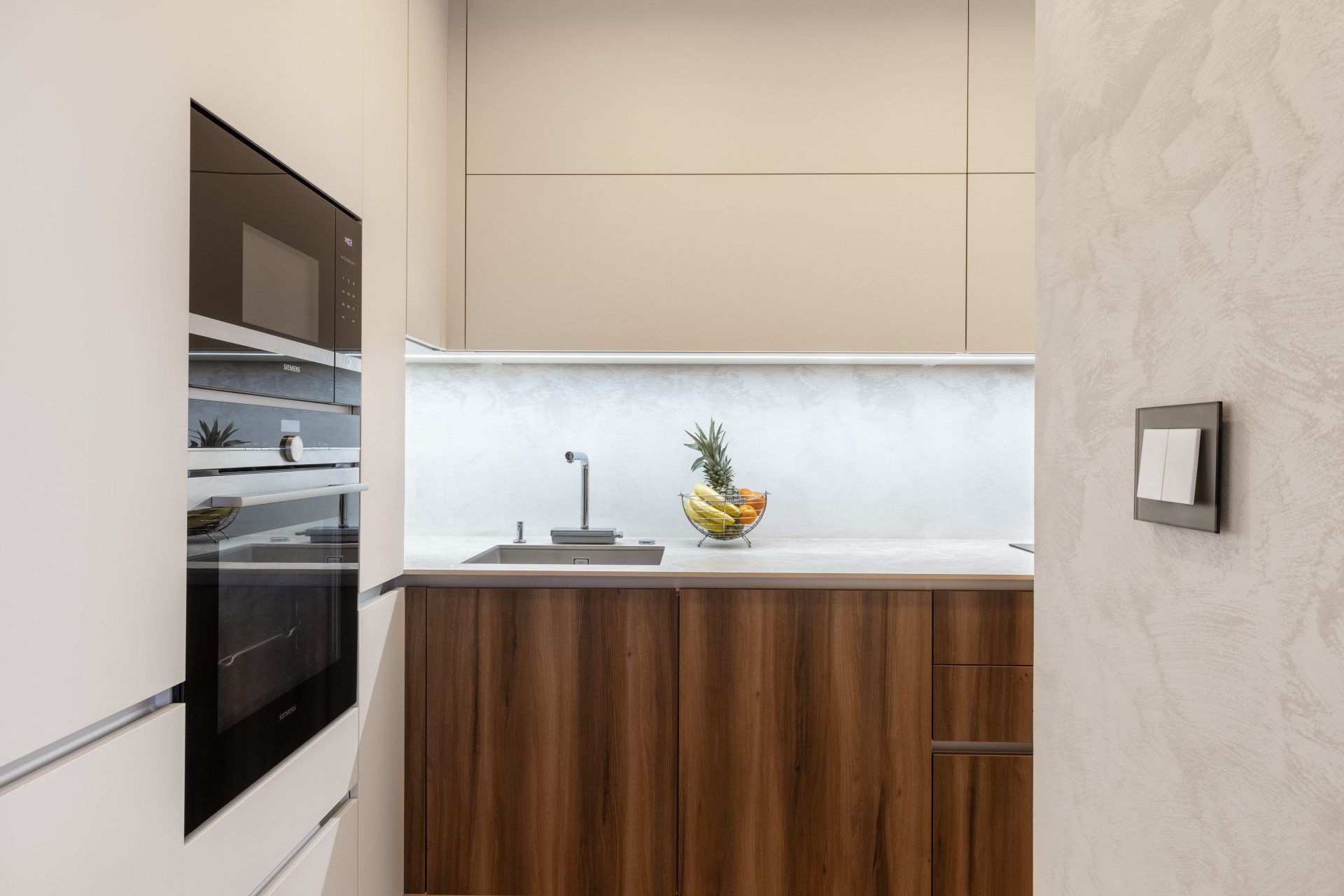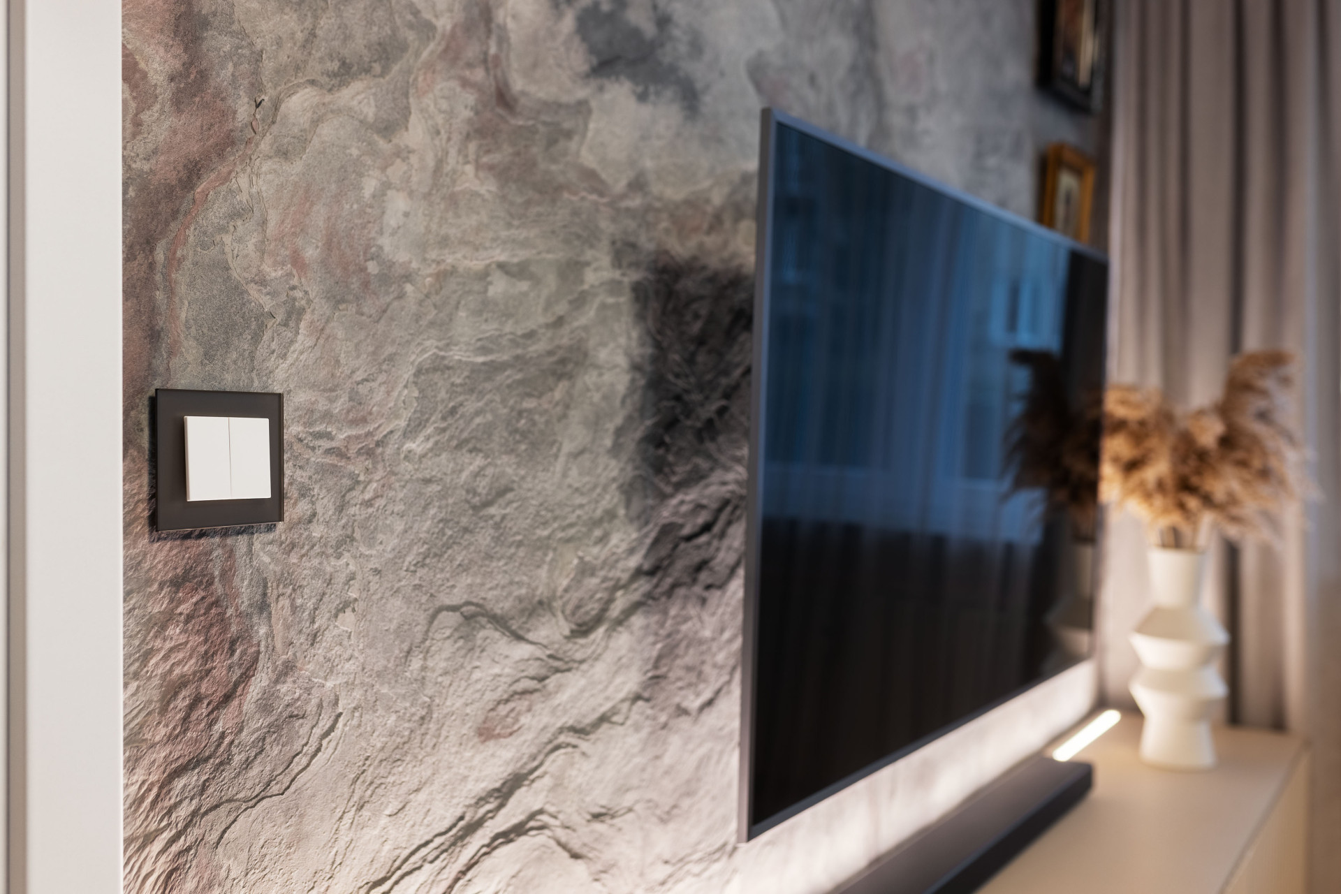 Se světlem úzce souvisejí vypínače, které nenápadně propojují celý byt. Volba padla na vypínače řady Decente od českého Obzoru. Designérka volbu vysvětluje: „V návrhu jsem kladla důraz na kvalitní materiály, a tak byly vypínače Decente se skleněným rámečkem jasnou volbou. Barvu skla jsme vybraly také netradičně – s majitelkou jsme se jednoznačně shodly na bronzovo matné. Krásně vynikne na stěně. V kombinaci s bílou matnou krytkou působí velmi elegantně. Všude v bytě jsme použili jen tyto rámečky. Vyniknou totiž krásně v koupelně na obkladu, na luxusní italské stěrce i na dřevěném obložení v chodbě. Propojují tak celý byt.“