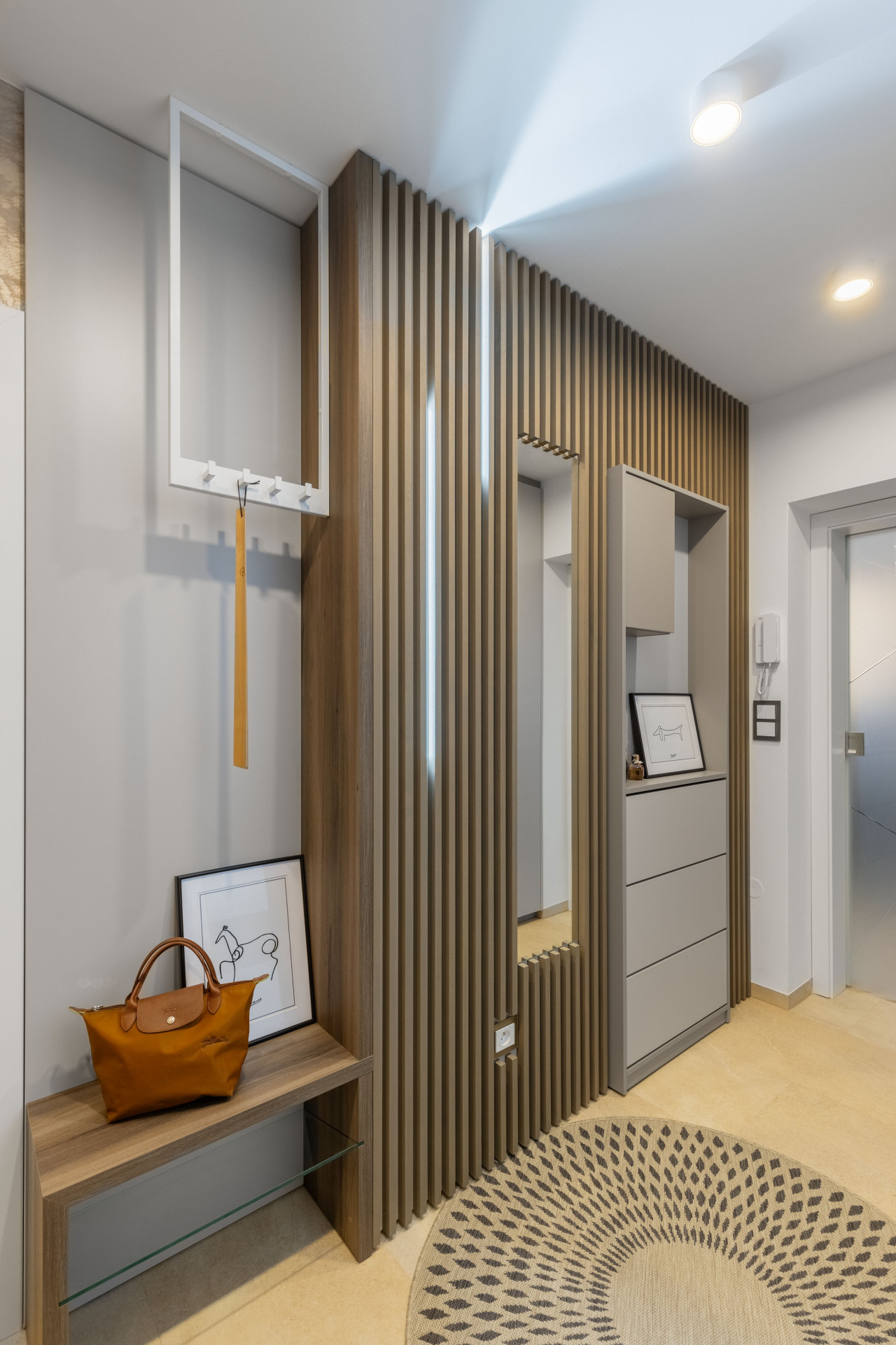 Kuchyni a chodbu propojuje podlaha z kvalitního francouzského vinylu, který je velmi odolný a skýtá možnost volit z nepřeberných vzorů a barev, navíc se snadno udržuje. Chodba s předsíní je vybavena vysoce účelně, přesto nechybí prostor pro umění v podobě obrazů a ostré hrany moderního věšáku vyvažuje kulatý jutový koberec.
