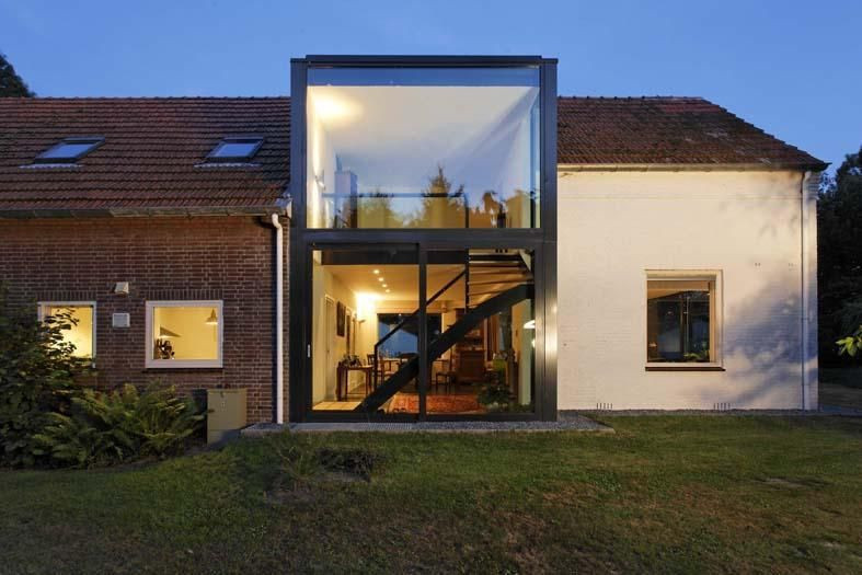 Dům pro mladou rodinu se rozšířil o prosklenný obytný prostor, který je k domu předsazen. Velkoformátové okna v ocelové konstrukci tvoří průhledný kvádr, který přízemí i první patro sjednotil a rozjasnil denním světlem. Dům se otevřel do zahrady, schodiště se přesunulo k boční stěně a interiér se tak opticky zvětšil a vyčistil. Hlavní vchodové dveře jsou v celé šiři od podlahy až ke stropu, takže nenarušují kompatibitu sklaněného kvádru přístavby.