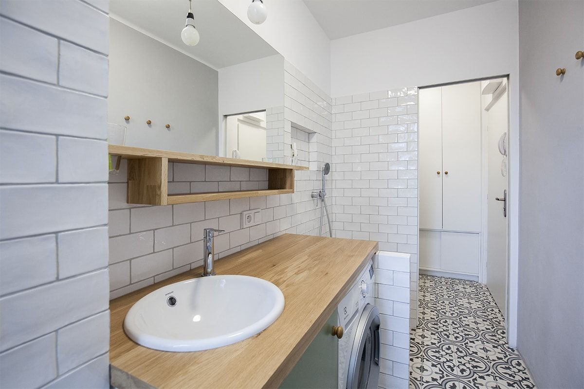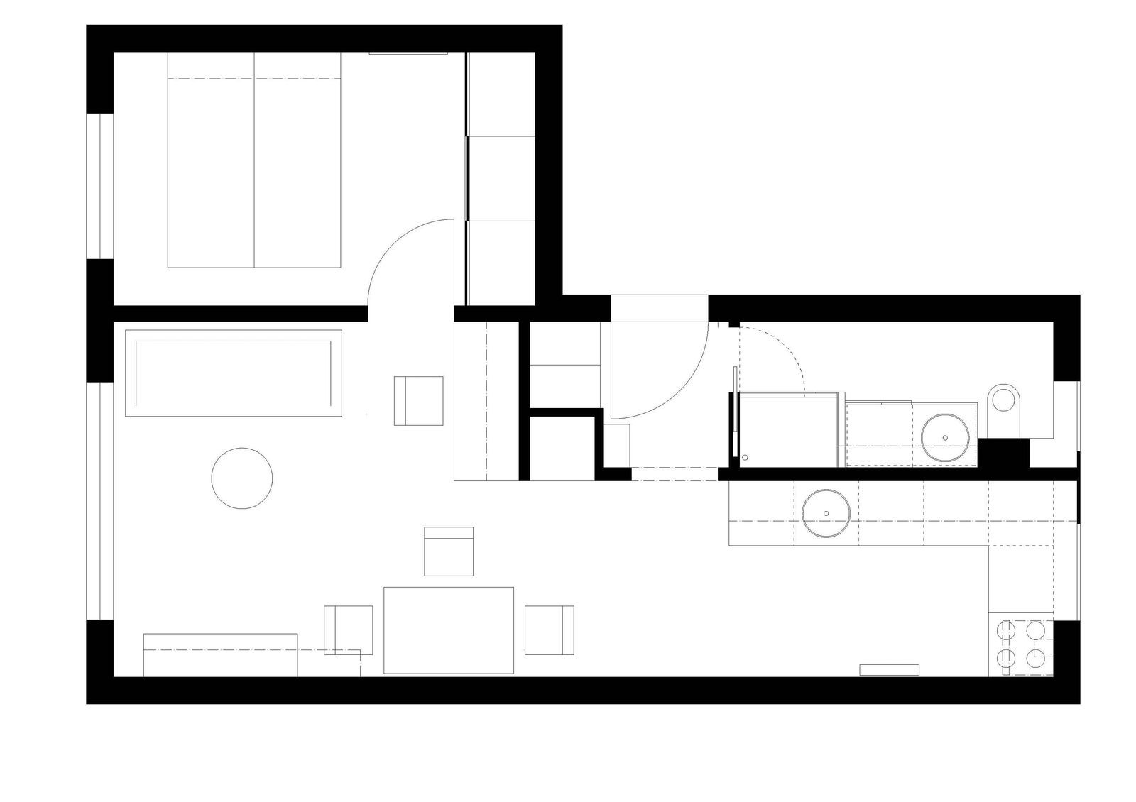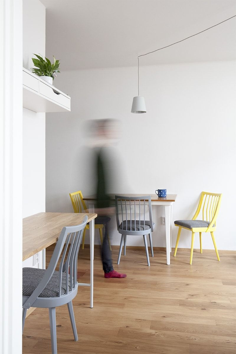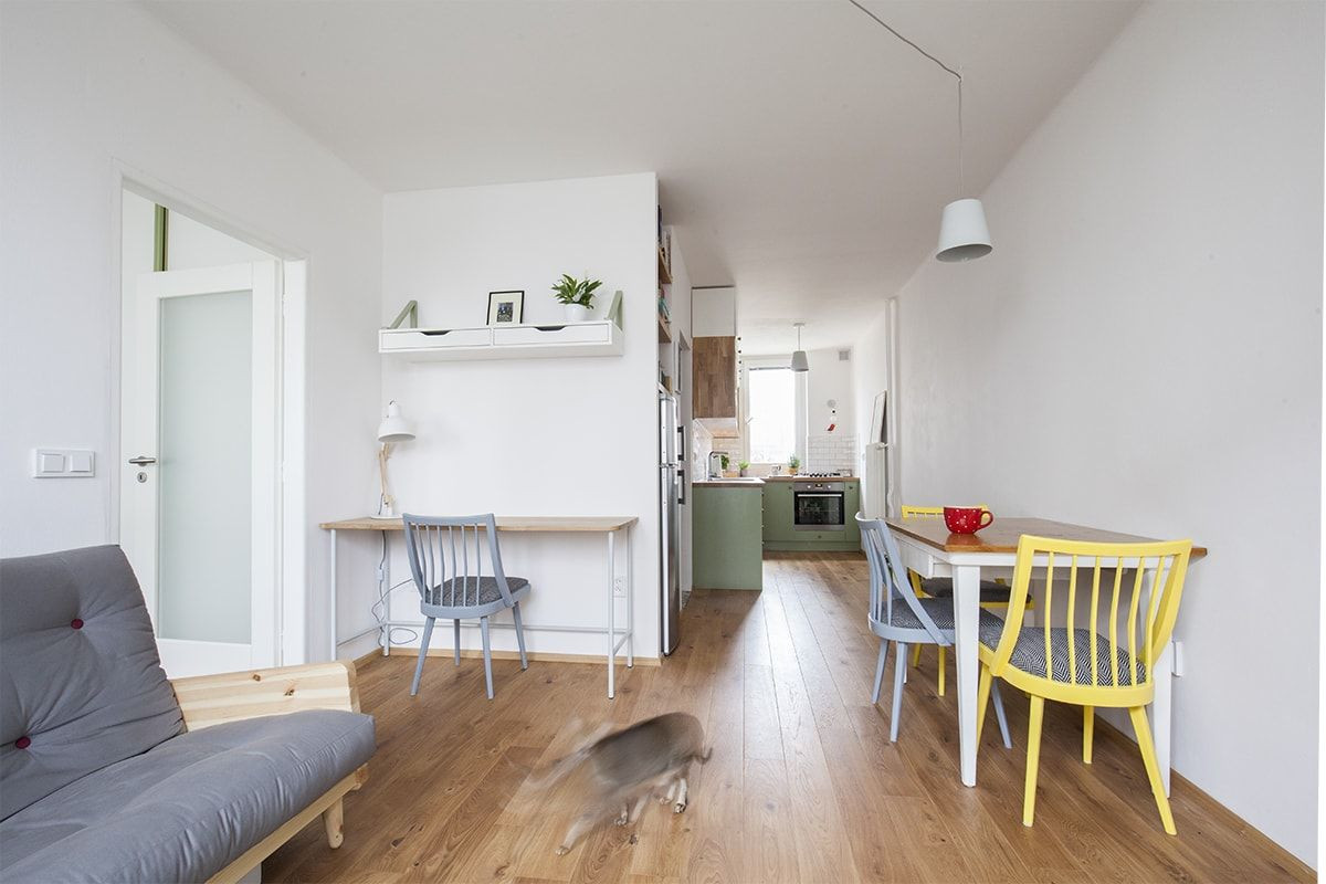 Na rekonstrukci interiéru bytu ve zděném domě v Dejvicích jsme byly oslovené majitelkou - lékařkou, pro kterou jsme dříve navrhly dětskou ordinaci. Původní dispozice bytu 2kk o velikosti 38 m2 byla téměř zachována. Vzhledem ke skutečnosti, že poměrně malý byt se nachází v suterénu, hlavním požadavkem majitelů bylo ho maximálně prosvětlit, provzdušnit a propojit v kompaktní celek.