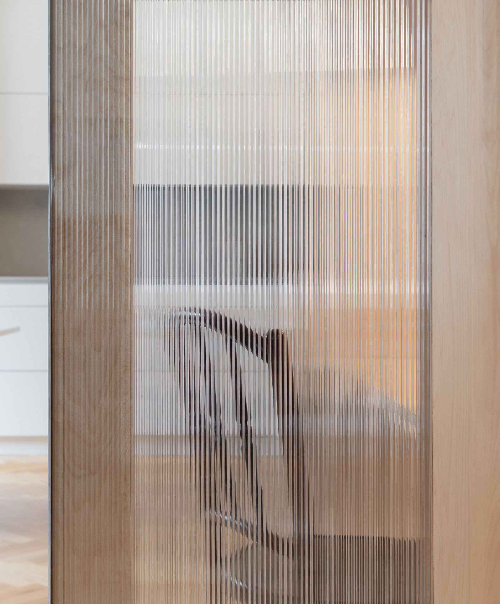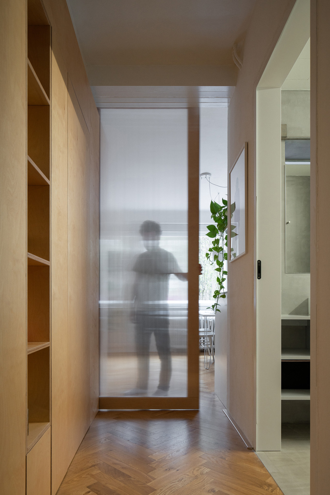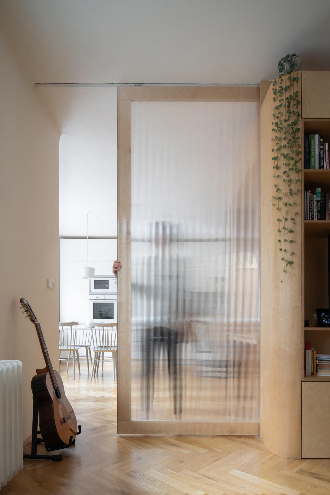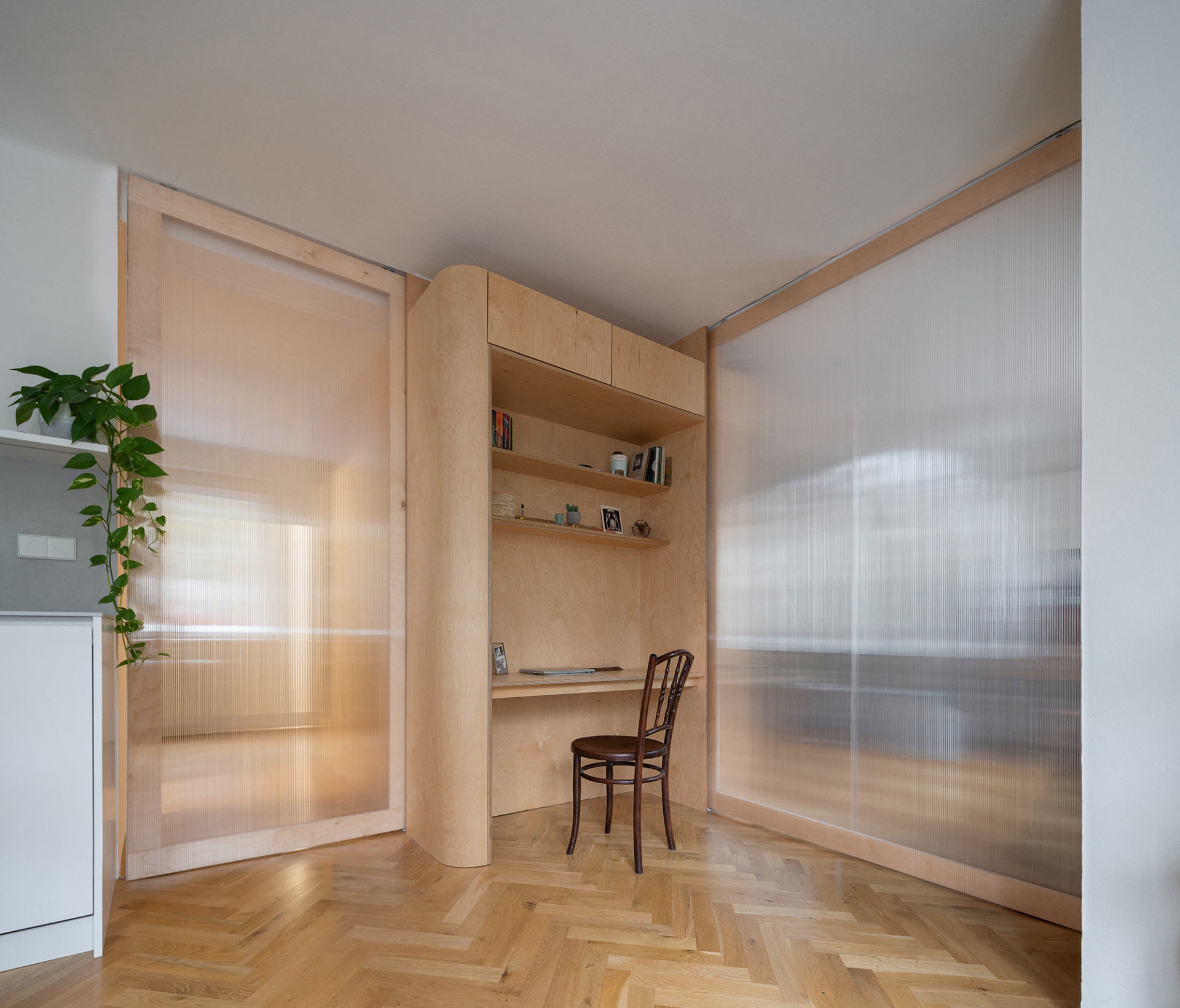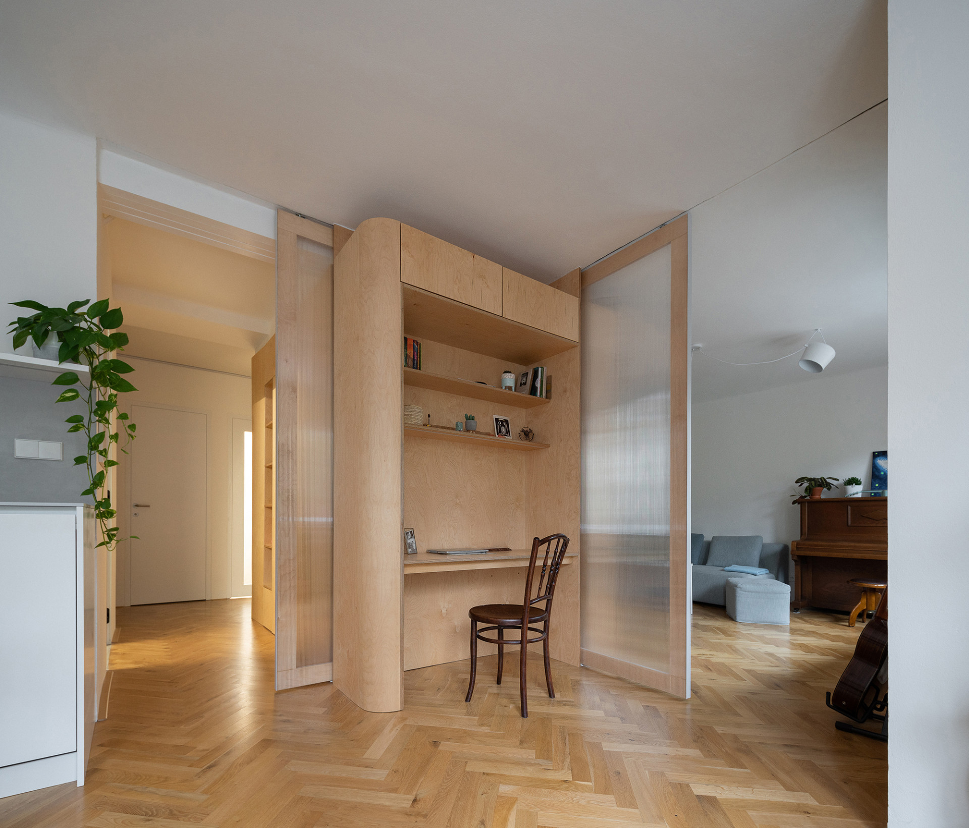 Jádro je vytvořené z březové překližky a díky tomu v bytě laděném do šedé a bílé značně vyniká. Kromě toho, že je multifunkční samo o sobě, umožňuje také proměňovat prostor okolo. Dají se z něj vysunovat průsvitné příčky z polykarbonátu, díky kterým je možné oddělit předsíň od hlavního obytného prostoru nebo obývací pokoj od kuchyně. Místnosti ale mohou rovněž zůstat navzájem propojené. Aby prostor dobře plynul, navrhli architekti jádro se zaoblenými rohy.