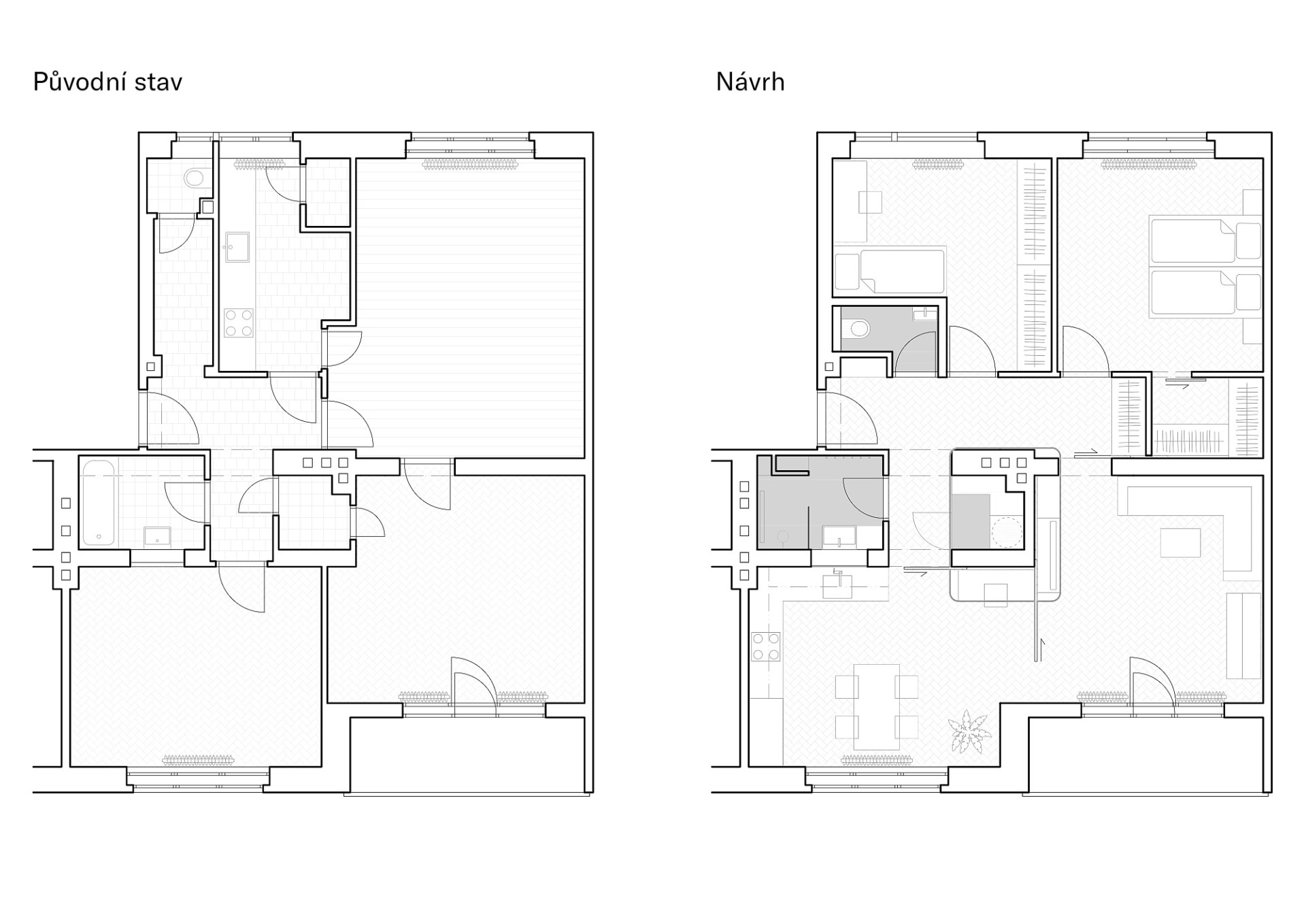 Rekonstrukce bytu v pražském Bubenči se nesla ve znamení celkového přeorganizování prostoru. Došlo i k zásadním stavebním úpravám, které autoři z ateliéru Papundekl architekti konzultovali se statikem. „Původní dispozice bytu se vyznačovala krkolomně uspořádaným zázemím. Přáním klientů bylo otočit dispozici tak, aby se obývací pokoj s kuchyní dostal na slunečnou jižní stranu, kde jsou okna do veřejného vnitrobloku, a pokoje na klidnější severní stranu,“ popisují situaci architekti Jan Bárta, Šimon Bierhanzl a Marek Fischer.