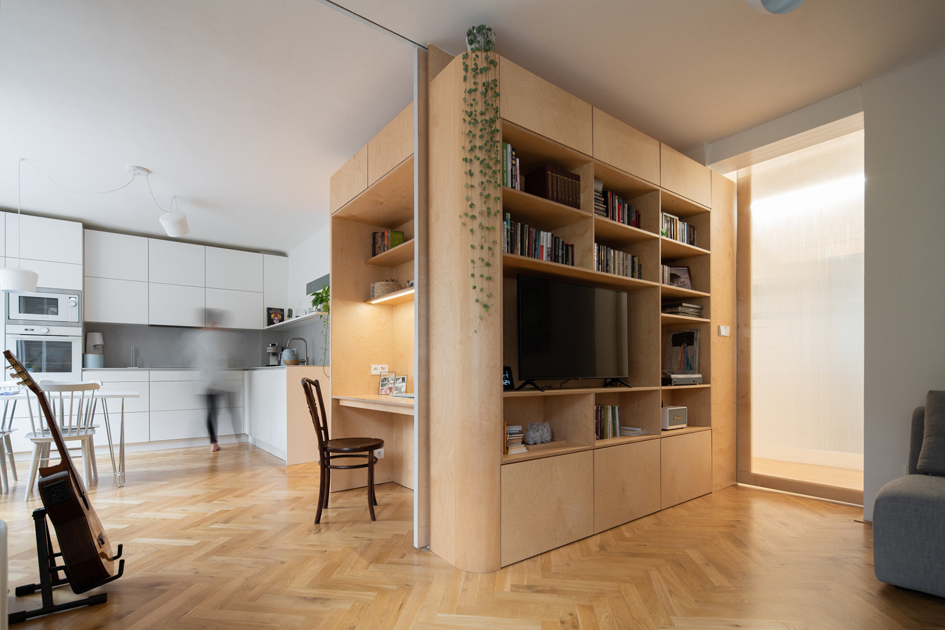 Pražskému bytu v domě ze 40. let nově dominuje dřevěné jádro. Funguje jako technická místnost i úložný prostor a lze do něj zasunout také průsvitné příčky z polykarbonátu.