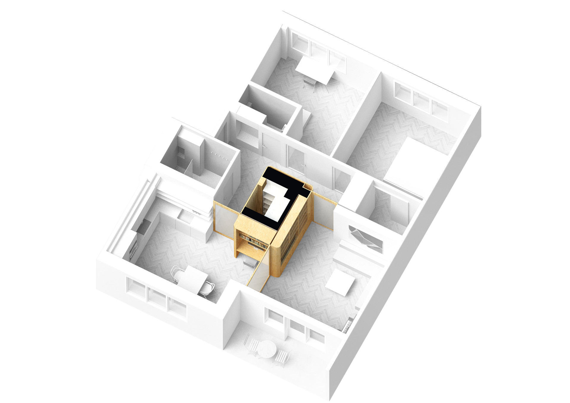 Návrh rekonstrukce bytu vypracovali pro mladý pár, který si ji podle vlastních slov přál „udělat úplně z gruntu“. Architekti nakonec dospěli k novému dispozičnímu řešení točícímu se kolem centrálně umístěné komory – dřevěného jádra, které v sobě slučuje obdivuhodné množství funkcí.