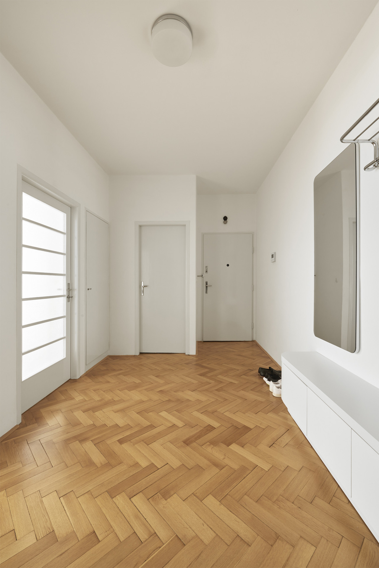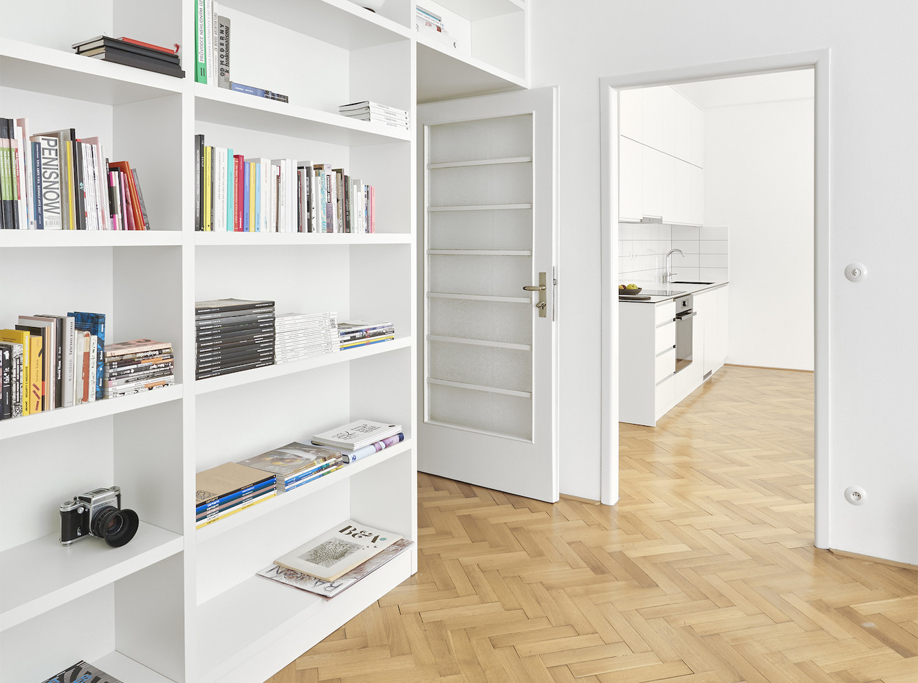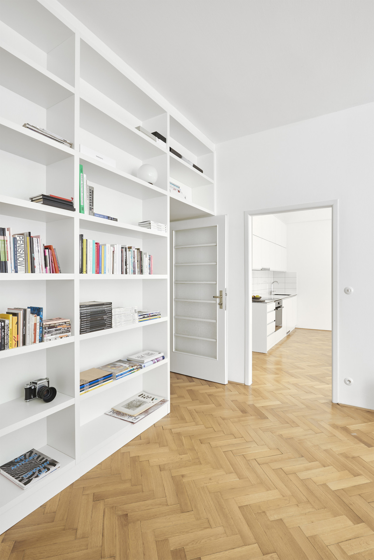 Byt ve fukcionalistickém domě z roku 1938 na pražských Vinohradech neprošel do příchodů architektů z 0,5 Studia žádnou zásadnější úpravou a díky tomu si zachoval mnoho původních prvků a povrchů. Cílem nynější rekonstrukce bylo podtrhnout jeho autentický funkcionalistický charakter a navrhnout několik změn pro pohodlné bydlení splňující dnešní standardy. Nový vestavný nábytek s jednotnou povrchovou úpravou v bílé barvě doplňuje řada designového vybavení známých značek podle výběru klienta, v rámci citlivé rekonstrukce došlo také k repasi původních oken, mosazných klik i podlah. "Prokazatelně kvalitní výstavba z 30. let stále zůstává nedostižena, zvláště v porovnání s dnešní standardní výstavbou. Výšky stropů, použité materiály, dokonalost provedení detailů i celku, nadčasovost a čistota dispozic mohou i po téměř 100 letech ukazovat dnešnímu stavebnictví záda a současné architekty inspirovat," říkají k projektu architekti Pavel Nový a Vít Svoboda.