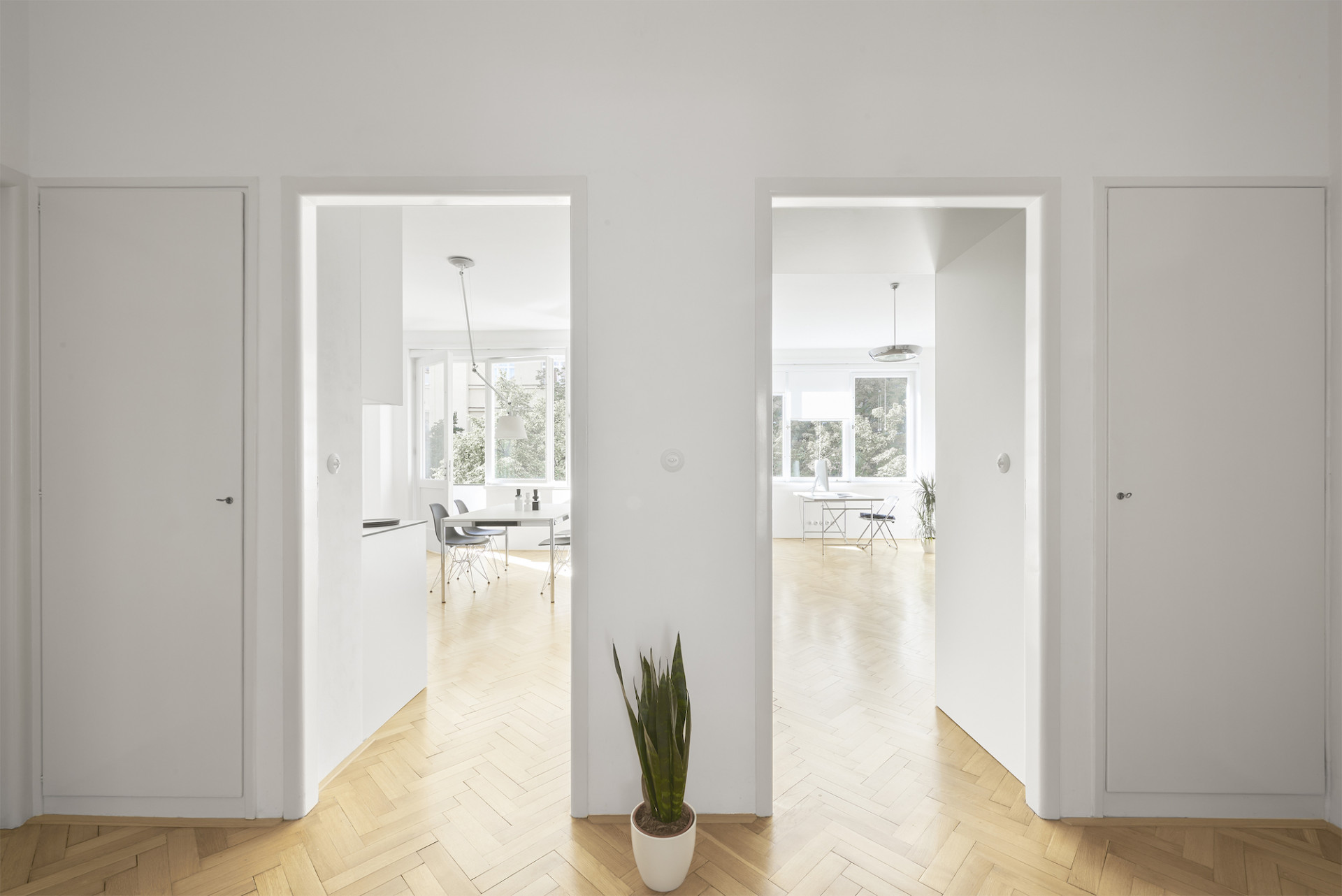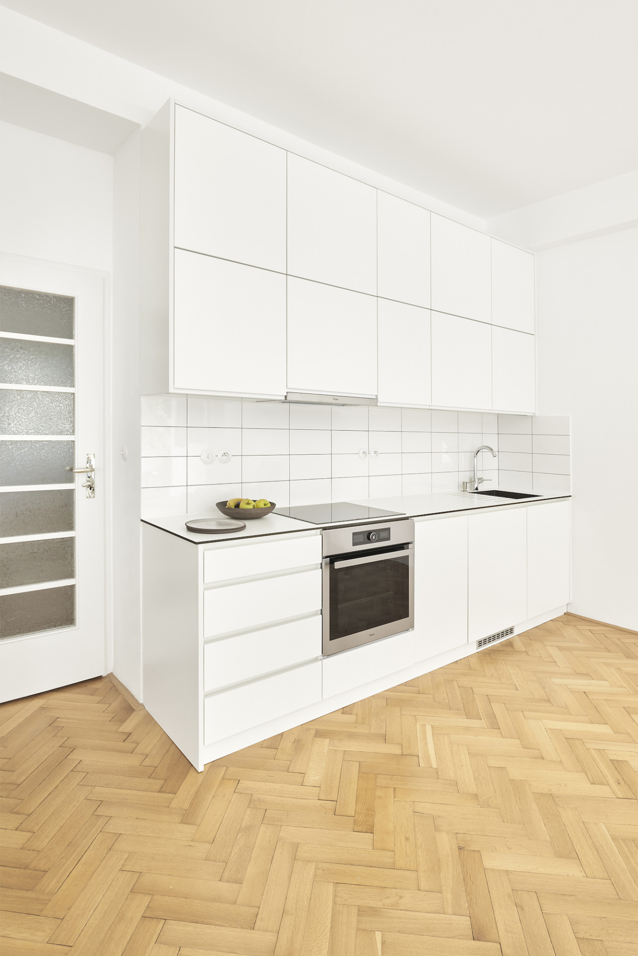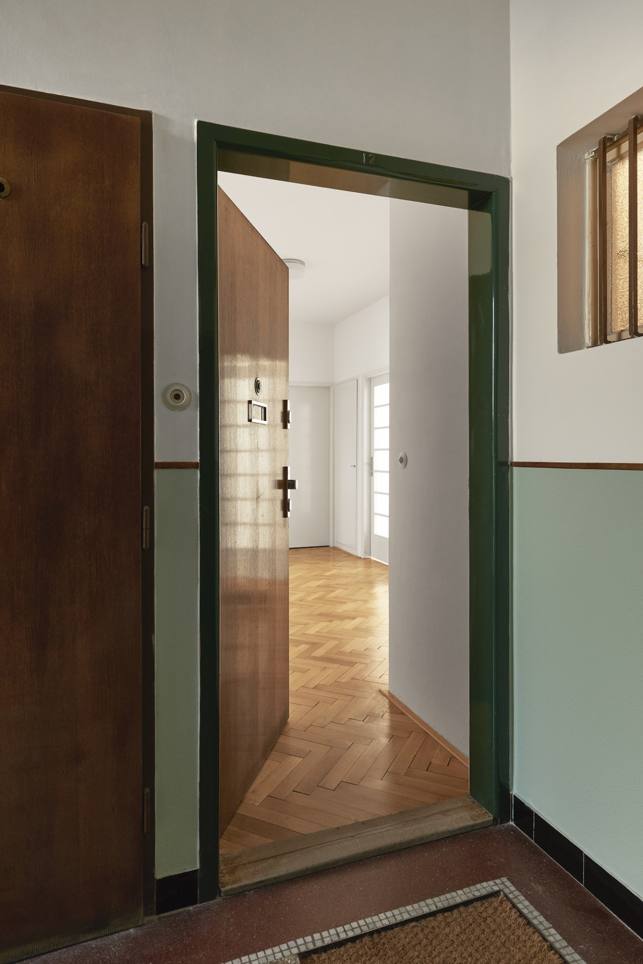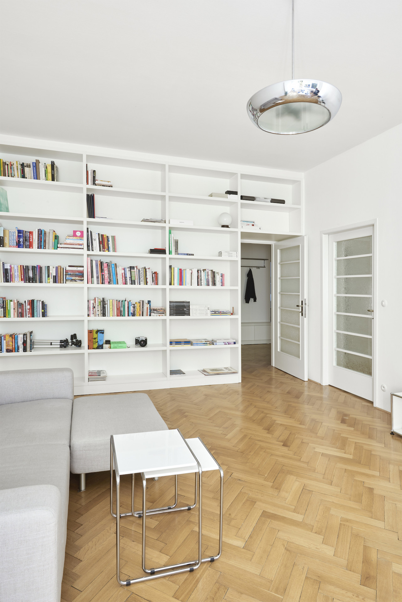 Byt ve fukcionalistickém domě z roku 1938 na pražských Vinohradech neprošel do příchodů architektů z 0,5 Studia žádnou zásadnější úpravou a díky tomu si zachoval mnoho původních prvků a povrchů. Cílem nynější rekonstrukce bylo podtrhnout jeho autentický funkcionalistický charakter a navrhnout několik změn pro pohodlné bydlení splňující dnešní standardy. Nový vestavný nábytek s jednotnou povrchovou úpravou v bílé barvě doplňuje řada designového vybavení známých značek podle výběru klienta, v rámci citlivé rekonstrukce došlo také k repasi původních oken, mosazných klik i podlah. "Prokazatelně kvalitní výstavba z 30. let stále zůstává nedostižena, zvláště v porovnání s dnešní standardní výstavbou. Výšky stropů, použité materiály, dokonalost provedení detailů i celku, nadčasovost a čistota dispozic mohou i po téměř 100 letech ukazovat dnešnímu stavebnictví záda a současné architekty inspirovat," říkají k projektu architekti Pavel Nový a Vít Svoboda.