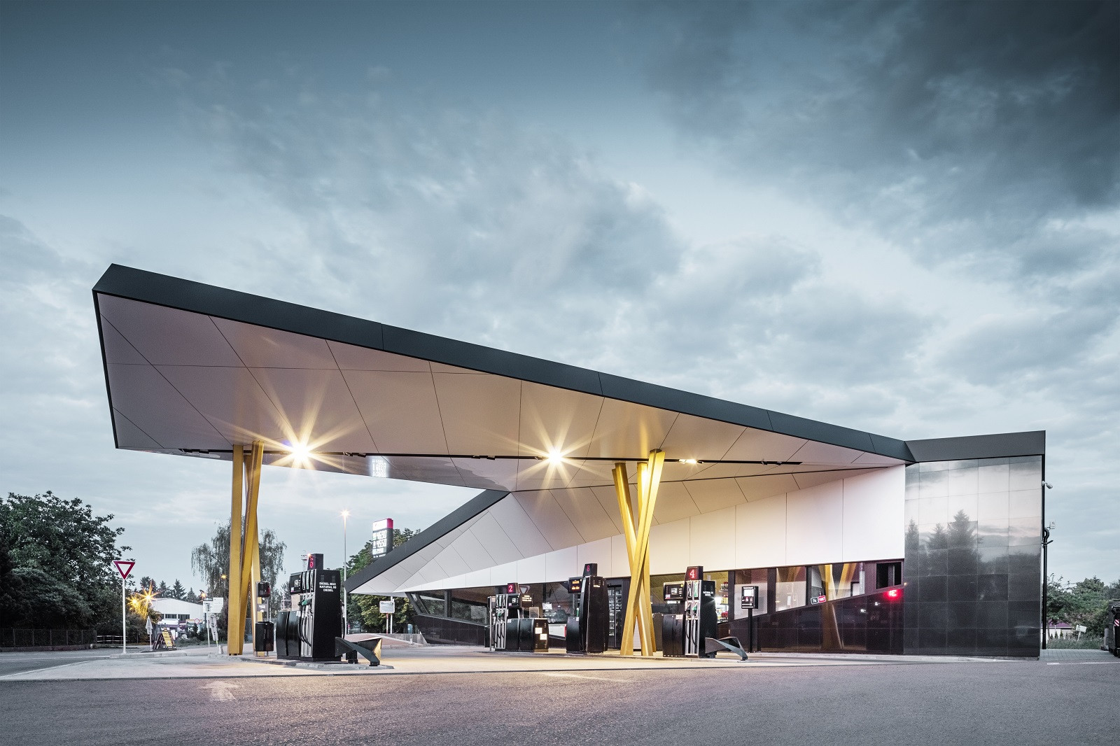Za netradičním architektonickým návrhem čerpací stanice v Uhříněvsi stojí známý liberecký architekt a designér Daniel Zerzán. Jako velký milovník silných motorek a extrémní rychlosti na závodních okruzích se snažil svůj koníček promítnout i do ostře řezaných geometrických tvarů futuristicky formované čerpací stanice pohonných hmot. Pro vnější opláštění využil kombinaci moderních materiálů – keramické obklady tmavých odstínů na zadní straně budovy a kompozitní desky PREFABOND v čistě bílém odstínu s velkoformátovým prosklením prodejny na čelní straně. Střešní lemování ohraničují rovněž kompozitní desky společnosti PREFA Aluminiumprodukte, avšak v černošedém odstínu. Interiéru vévodí dřevěné obklady a liniové osvětlení prodejní plochy.