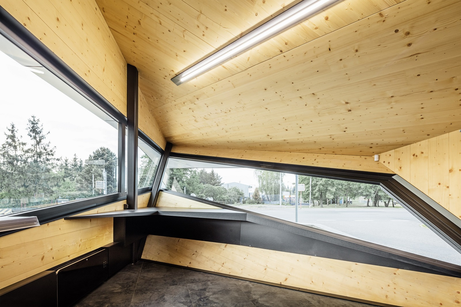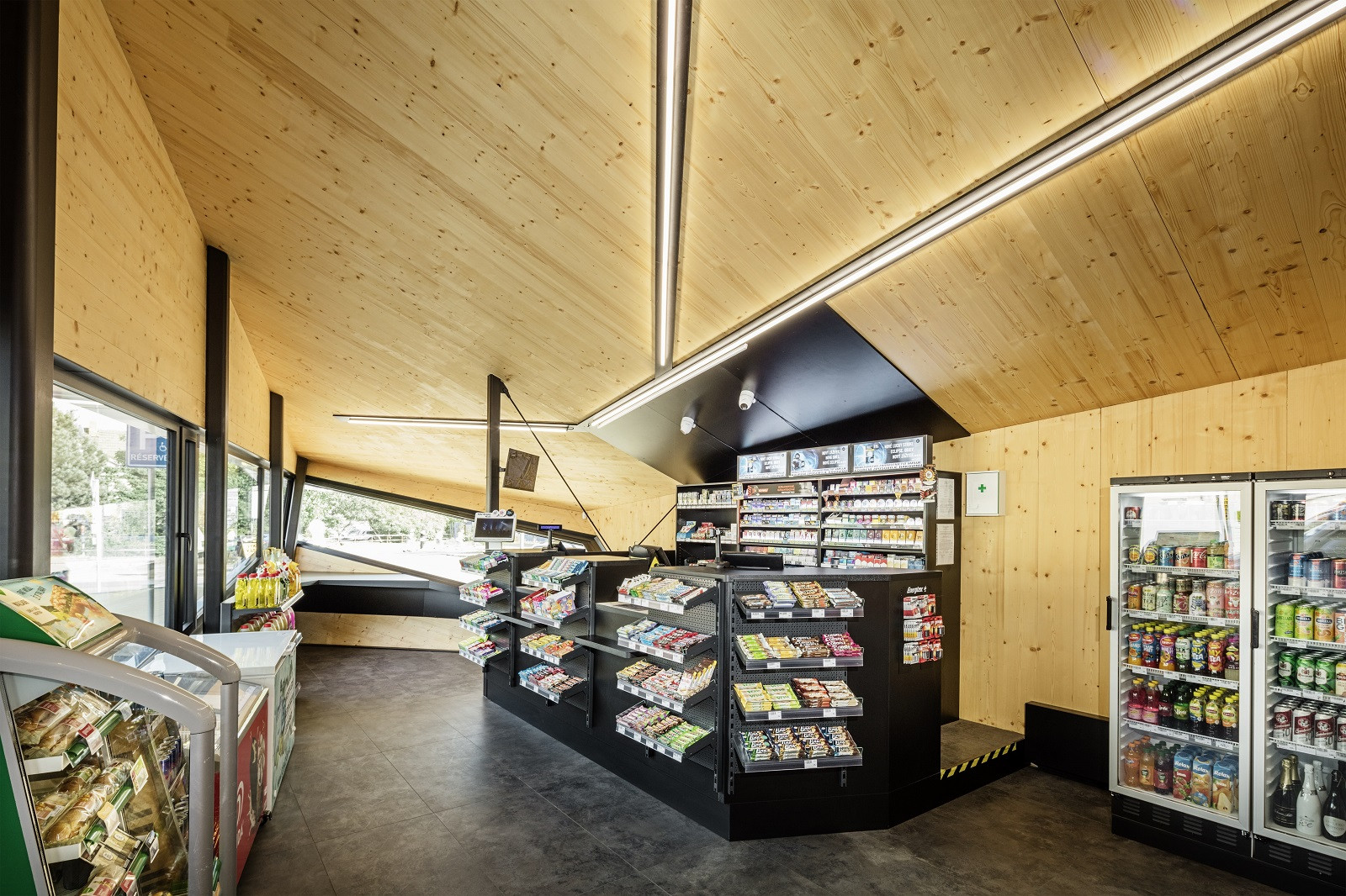 Geometricky náročná forma čerpací stanice s sebou nese zajímavé konstrukční detaily. Na ocelové žebrované nosné konstrukci spočívá těleso z digitálně předfrézovaných desek z křížem lepeného dřeva, do kterého je umístěna prodejna a servis. Je upnuta na trubkové ocelové podpěry, které jsou viditelné v interiéru, a které rovněž podpírají střechu v oblasti výdejních stojanů. Ty jsou dobře skryty ve skupině podpěr, ve kterých je integrováno odvětrání podzemních nádrží a rovněž odvodnění střechy. Podobně kreativně je řešen výhled od pokladny na dění okolo výdejních stojanů, který si obsluha čerpací stanice nemůže vynachválit.
