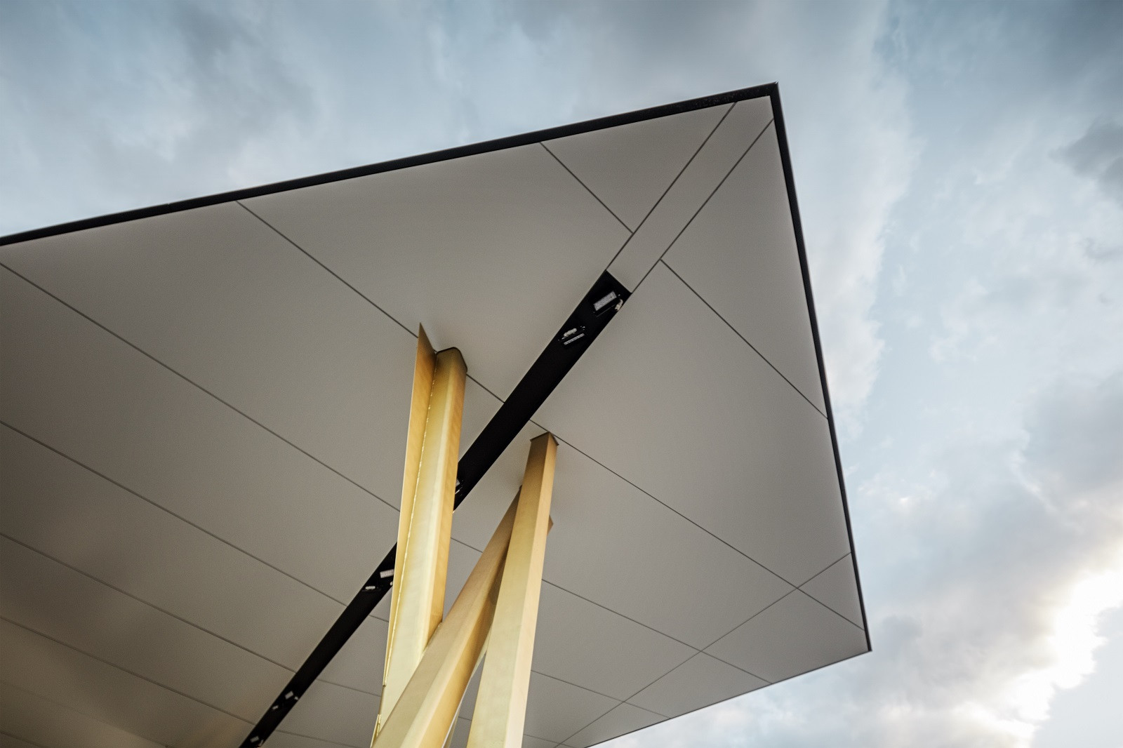 Kompozitní desky PREFABOND jsou sendvičově vrstvené ze dvou hliníkových plechů a z obou stran strojově natavené a nalisované na polyetylenové jádro. Vykazují tak mimořádnou pevnost i odolnost a jsou proto ideální volbou pro opláštění fasád nebo podbití střech v jakkoliv technicky a klimaticky náročných podmínkách. Dají se s milimetrovou přesností řezat nebo tvarovat, a to včetně pokládky přes ostré rohy, kdy se vyfrézováním drážky z rubové strany přes roh jednoduše ohnou. Také se dají snadno lepením, nýtováním nebo šroubováním kotvit v jakékoliv poloze a jakémkoliv úhlu. Této flexibility využil i Daniel Zerzán a navrhnul na budově prodejny několik lomených, negativně skloněných rovin, které postupně přecházejí z fasády až do roviny střešního podhledu nad výdejními stojany.