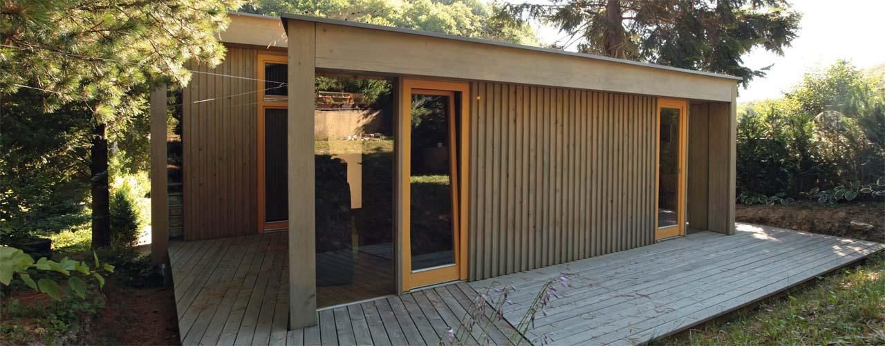 Taktílna textúra exteriérových stien, dosiahnutá pravidelne sa striedajúcou hrúbkou smrekových fošní (18/16cm), reaguje na meniace sa svetelné podmienky a podtrhuje prepojenie budovy s rytmom roka a dňa. Nálada budovy sa tak mení podľa ročného obdobia, času, ako aj svetelných podmienok a počasia. Drevená terasa lemuje chatu z troch strán a v jej bočnej, južnej, časti, odkiaľ je aj hlavný vstup do domu, vytvára malé átrium prepojené na kuchyňu. Veľkorozmerné okná a presklené dvere, striedanie teplých a priesvitných materiálov určujú povahu a atmosféru domu. Kým pri nich máme jasný pocit, že slúžia predovšetkým k pozeraniu a prestupovaniu von, svetlíky umiestnené na západnej a východnej strane krátkej chodby budia dojem, že ide skôr o okolité stromy, ktoré sa dívajú dnu. Dojem je docielený tým, ako sú svojím uhlom orientované na lesy na kopcoch pred a za chatou. Predstavivosť však najviac zamestnáva plochá zelená strecha a možnosti vonkajšieho života, ktoré poskytuje.