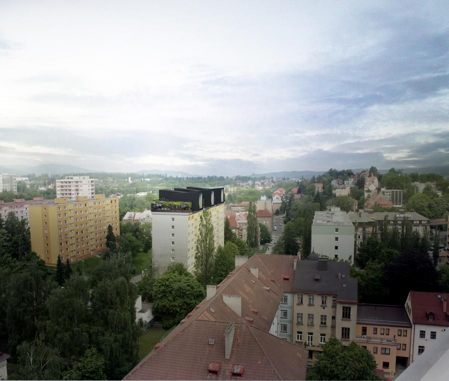 Nabízíme svobodným, finančně zajištěným a aktivním lidem moderní formu bydlení posazenou nad úroveň okolní zástavby s nerušeným výhledem na město Liberec a jeho okolí. Chtěli jsme novým obyvatelům střešní nástavby nabídnout všechny atributy nadstandardního bydlení. Zajímavou lokalitu, nerušený výhled, otevřený prostor, zahradu a minimální náklady na provoz.