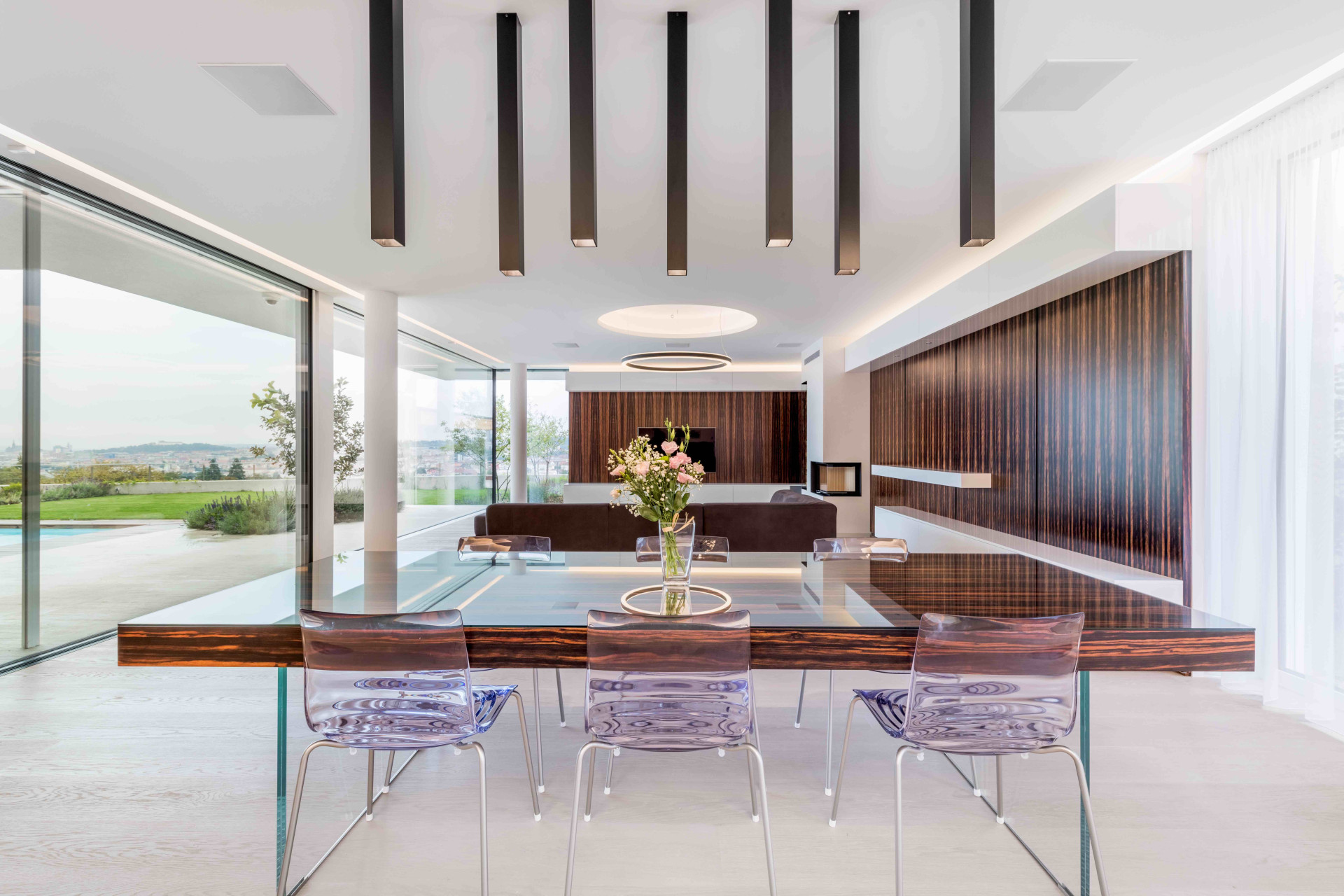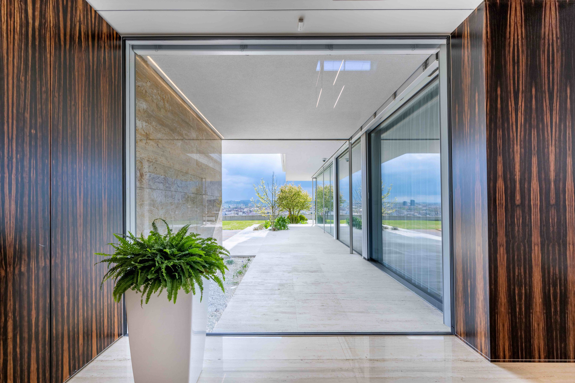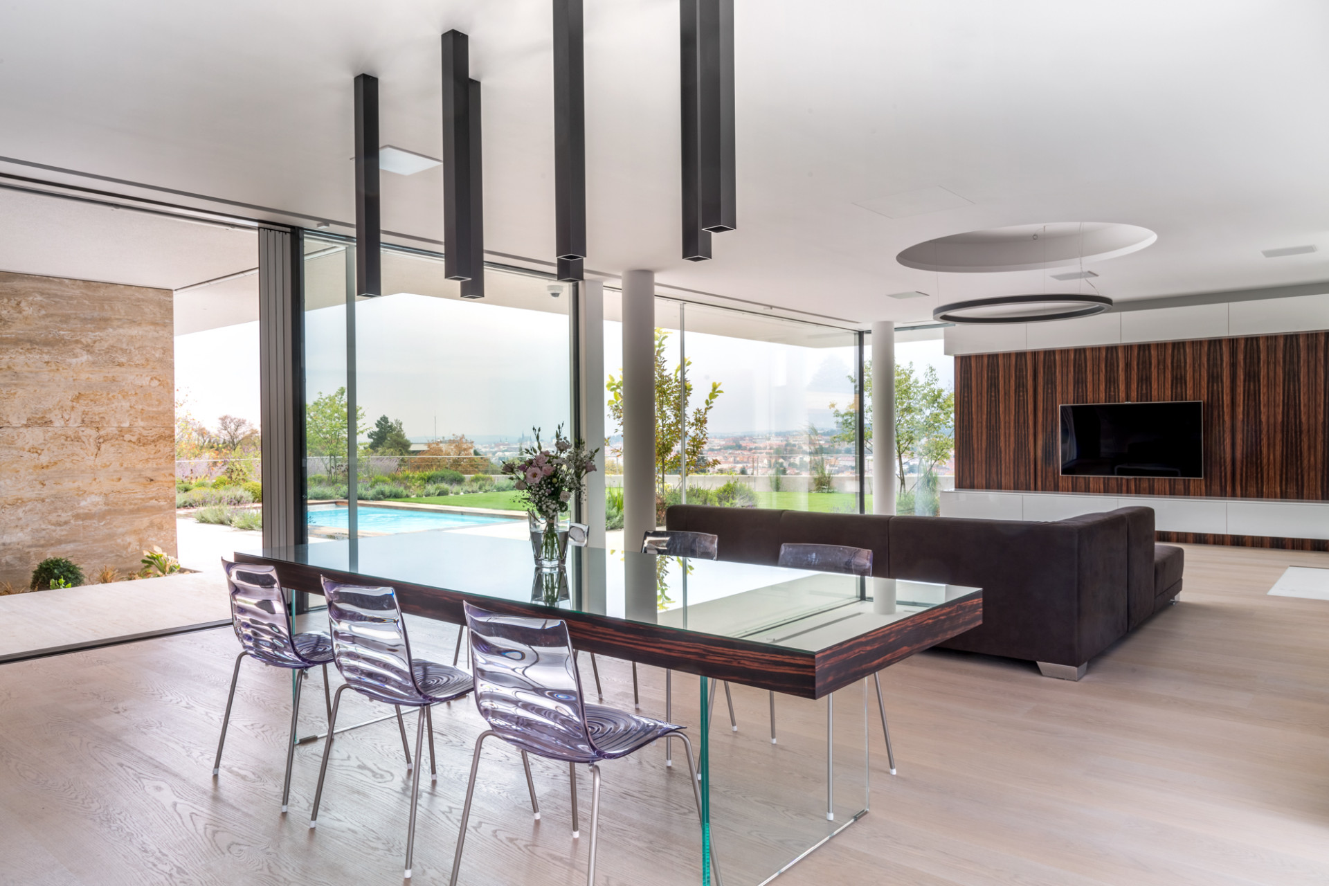 Nejmodernější technologie umožnily architektům dosáhnout i maximálního propojení interiéru s exteriérem, které zprostředkovala i řada panoramatických hliníkových posuvných systémů Schüco ASS 77 PD.HI. S tímto designovým a zároveň vysoce tepelně izolovaným posuvným systémem lze konstruovat rohy bez nežádoucího pevného sloupku, maximální transparentnost je dána úzkými pohledovými šířkami profilů od 30 milimetrů i bezbariérovým osazovacím rámem. Vodící lišty umožňují automatizovaný pohyb křídla o hmotnosti až 500 kilogramů. Prosklené výplně otvorů jsou zaskleny až 6 metrovými izolačními trojskly, kde složitost jejich konstrukce vyžadovala výrobu ve speciální sklárně v Německu.