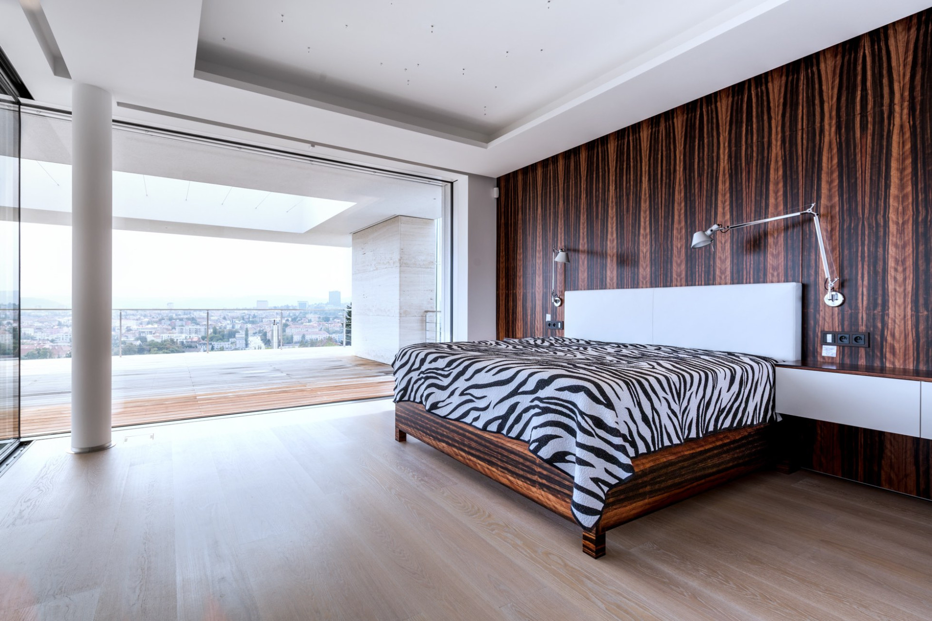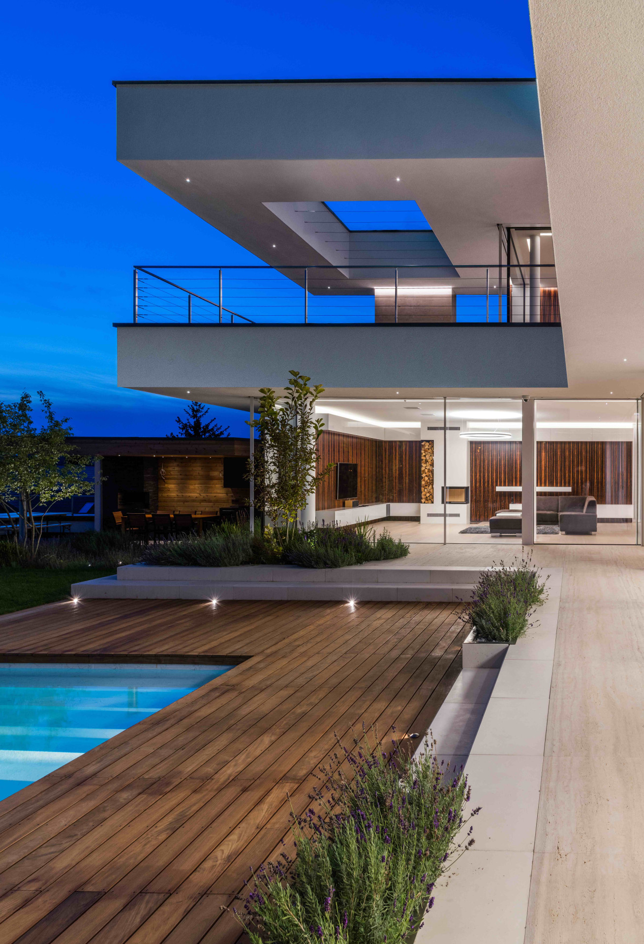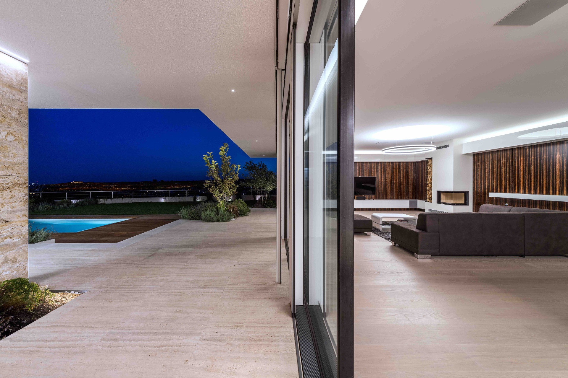 Nejmodernější technologie umožnily architektům dosáhnout i maximálního propojení interiéru s exteriérem, které zprostředkovala i řada panoramatických hliníkových posuvných systémů Schüco ASS 77 PD.HI. S tímto designovým a zároveň vysoce tepelně izolovaným posuvným systémem lze konstruovat rohy bez nežádoucího pevného sloupku, maximální transparentnost je dána úzkými pohledovými šířkami profilů od 30 milimetrů i bezbariérovým osazovacím rámem. Vodící lišty umožňují automatizovaný pohyb křídla o hmotnosti až 500 kilogramů. Prosklené výplně otvorů jsou zaskleny až 6 metrovými izolačními trojskly, kde složitost jejich konstrukce vyžadovala výrobu ve speciální sklárně v Německu.