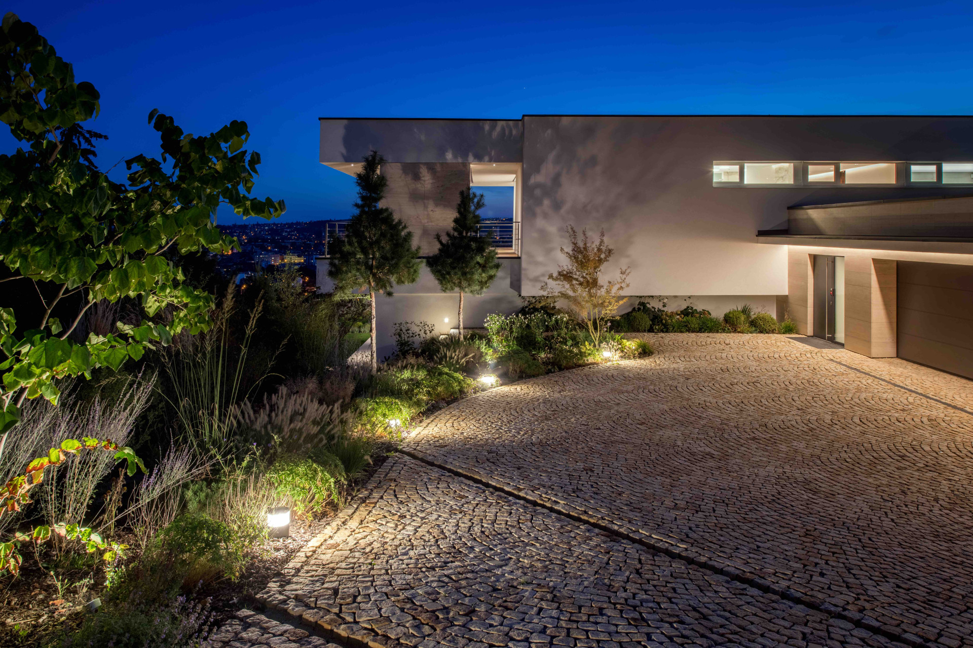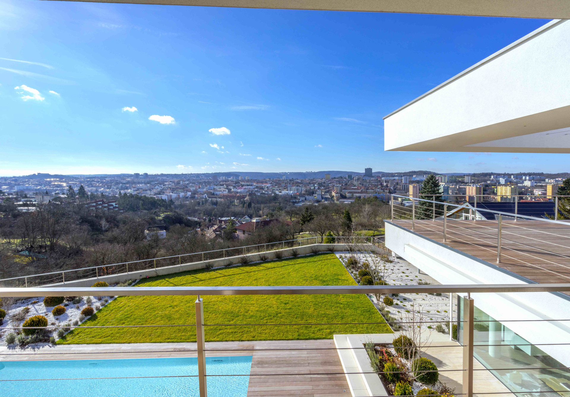 Unikátnost vily je postavena na exkluzivnosti pozemku s nenapodobitelným výhledem na brněnské dominanty, jako je hrad Špilberk či katedrála svatého Petra a Pavla, ba dokonce s průhledem až na Pálavu. „Málokdy se poštěstí pracovat s tak úžasným pozemkem, před kterým nejsou a nebudou žádné jiné stavby, s pozemkem, který ubíhá po svahu, takže můžete vytvářet gradaci celého prostoru zahrady. Jako kdybyste se dívali na Prahu z Pražského hradu...,“ pokračuje architekt Martin Kareš. Stavba je umístěna v horní části pozemku u příjezdové komunikace. Velký terénní výškový rozdíl byl vyrovnán vytvořením terasy s obytnou částí zahrady a bazénem, vše bezbariérově navazující na dům. Jednoduchá koncepce má poskytnout obyvatelům ze všech místností zážitek neopakovatelného výhledu na město. „Chtěli jsme udělat lehkou architekturu, která je propojena otevřeným prostorem přes skla s exteriérem. Aby pokaždé, když klienti přijdou domů, měli kontakt s Brnem, jako kdyby si sedli na louku, když tam dům nestál. Dům by neměl vytvářet bariéru, ale průhled, to je to nejcennější na pozemku. Proto jsme klientovi navrhovali i panorama designy, tedy posuvné systémy Schüco s co nejužšími profily rámů, které jsou maximálně skryty. A přestože to bylo finančně náročnější řešení, klient na tuto myšlenku, na tuto filozofii přistoupil.“ Výsledkem jsou na pohled dvě levitující desky propojené jen transparentními skleněnými plochami.