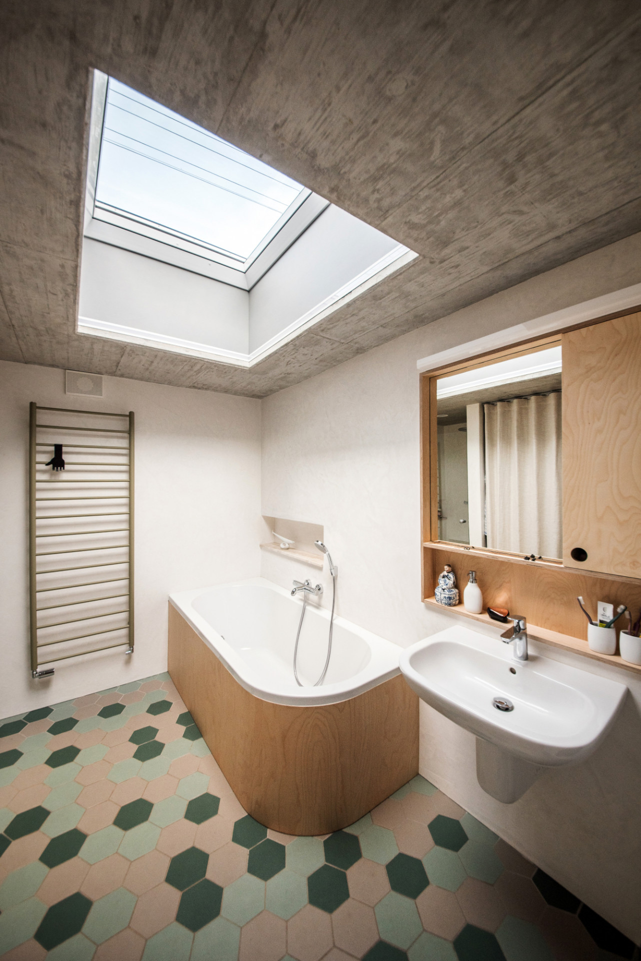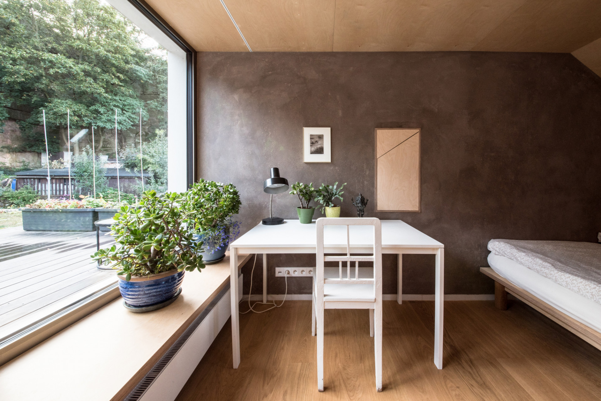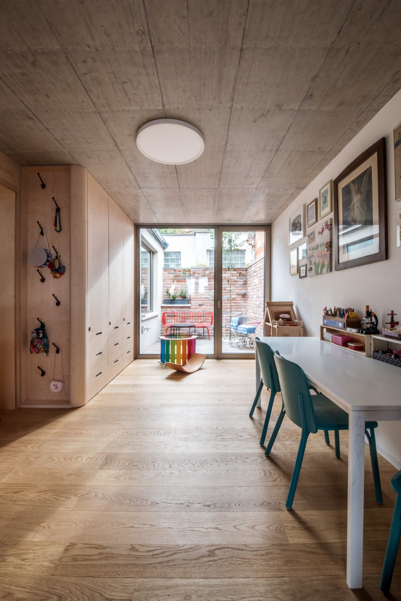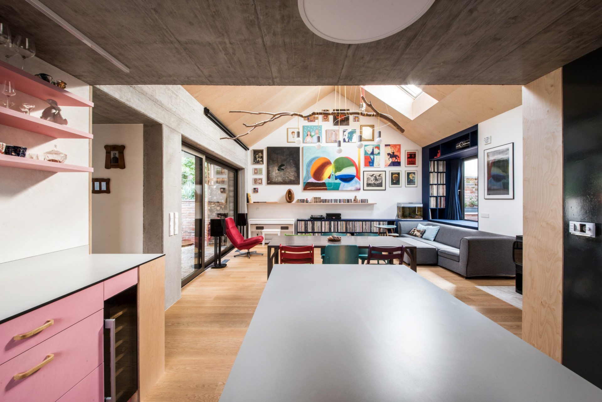 Nová přístavba má na podlaze ve hmotě probarvenou dlažbu, stará část pak třívrstvou dřevěnou dubovou lamelu. Celým domem prochází přírodní březová překližka (nábytky, obklad vstupu, dveře, podhled obývacího pokoje a ložnice), lokálně pak probarvená překližka (modrá – odpočinkový kout obývacího pokoje, růžová – kuchyň). „Máme rádi barvy, proto jsme se nápadu naší dcery s růžovou kuchyní nezalekli a snažili se tuto ne úplně obvyklou barvu vhodně materiálově a barevně doplnit,“ pokračuje Ing. arch. Radim Horák. Speciálním prvkem kuchyně je i tzv. chytrá stěna, magnetická a popisovatelná zároveň – děti mají kde malovat, rodiče zase prostor třeba na nákupní seznam...